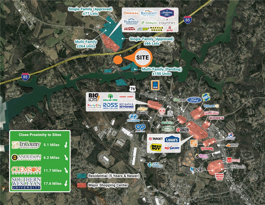 249' along I-85! Desirable high traffic property located right at I-85 and US 76-28 (Exit 19A) intersection. All utilities and storm drainage work complete with public road ready to access your business. Utilities available at property are water, sewer, electric and gas. Easy to access the interstate. Great location for restaurant, corporate office, shopping plaza, wedding venue and many other business ventures! More than 80,000 combined vehicles pass here each day on I-85 and Hwy 76 (Clemson Blvd) Exit 19B heading north 11 miles takes you to Clemson University and 6.5 Miles heading southwest on Hwy 76/Clemson Blvd. takes you to Anderson University. Anderson serves 6 Georgia counties for food, entertainment and shopping and is growing at a healthy rate! Nearby properties include beautiful Lake Hartwell, Portman Marina, boat ramps, shopping centers, hotels, fast food and dine in restaurants, residential homes and condos. Other large employers include Michelin, Arthrex, Ryobi, Electrolux, First Quality, Walgreens Distribution and many others. On Destination Blvd: Hilton Garden Inn, Fuddruckers, AJ's Bar and Grill - Within a mile of Panera's, Texas Roadhouse, Olive Garden, Longhorn, Hardees, Bojangles, Chick Fil-A, Chilis, and more! On the other side of Interstate: Waffle House, Wendy's, McDonalds, Arbys, Holiday Inn Express, Subway, Outback, Hooters, Wild Wings, Fairfield Inn, Country Inn & Suites, Comfort Inn & Suites, Starlight Movie Theater, Hampton Inn, and Cracker Barrel.