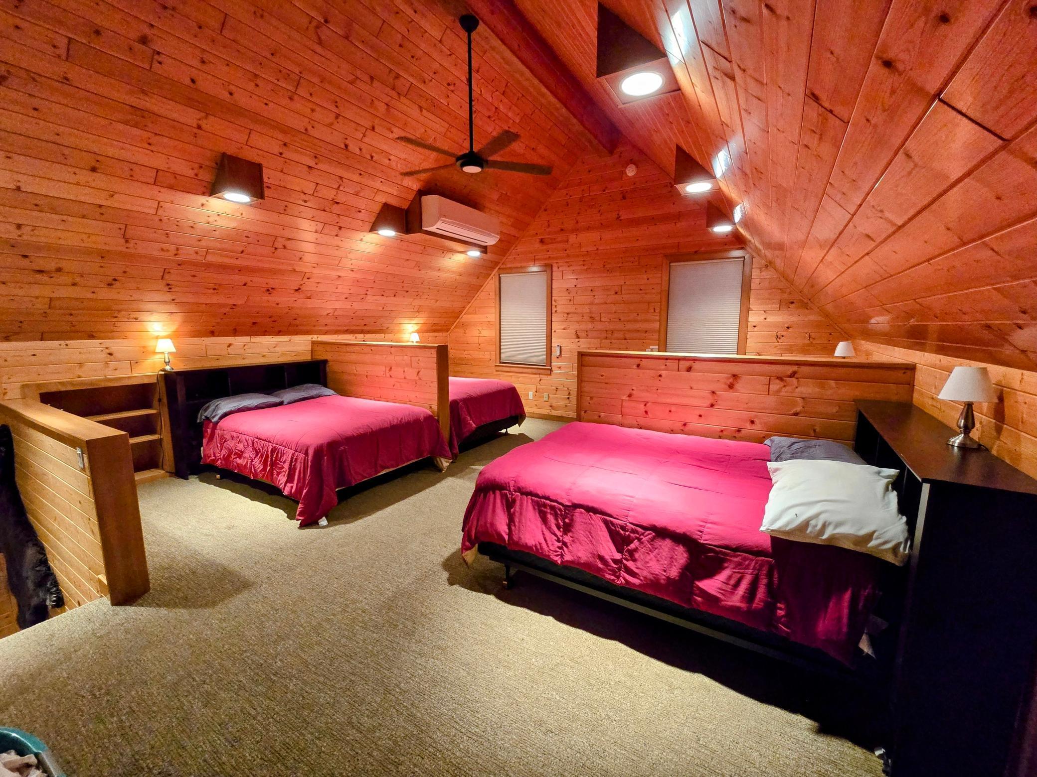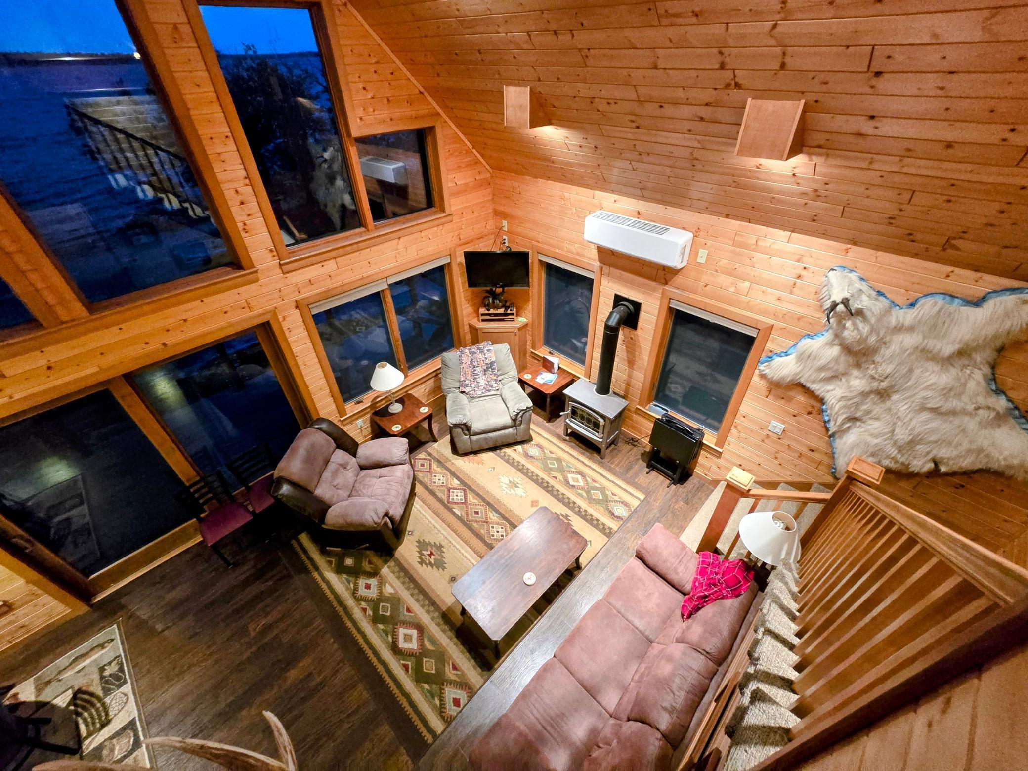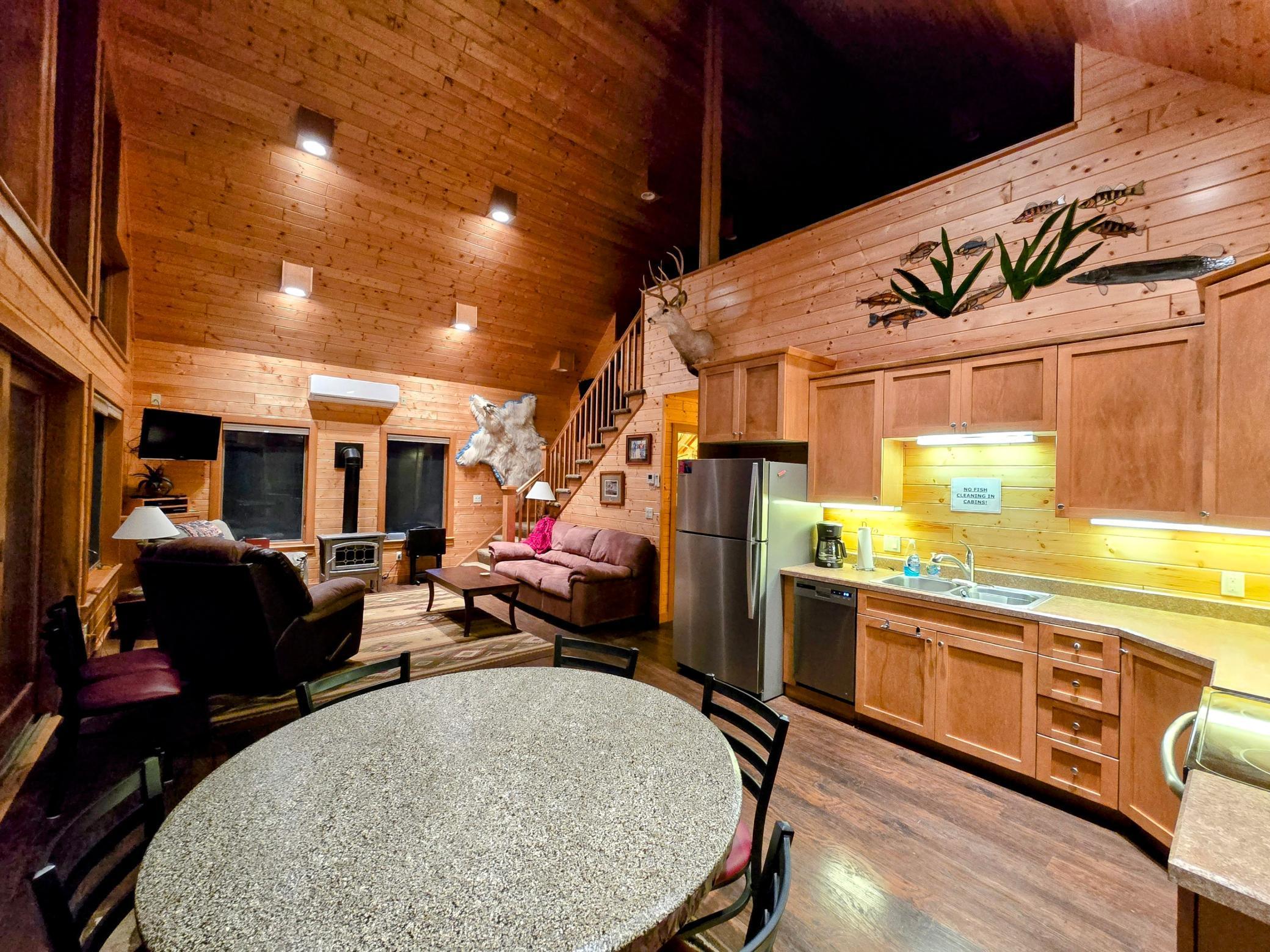 On the main level, you'll find two comfortable bedrooms: one with a queen bed and another with a full bed and a twin bed, along with two full bathrooms. The large loft offers four full beds in a semi-private layout. The expansive deck is ideal for stargazing, and on clear nights, you might even catch the Northern Lights .In the summer, take a refreshing swim in the lake just steps from your door, or gather around the firepit for s’mores. In the winter, snowmobile parking is conveniently located next to the cabin. Nestled at the back of the resort, Tanonka provides a peaceful escape, allowing you to fully embrace the beauty of Flag Island Resorts. We know you'll fall in love with this hidden gem!