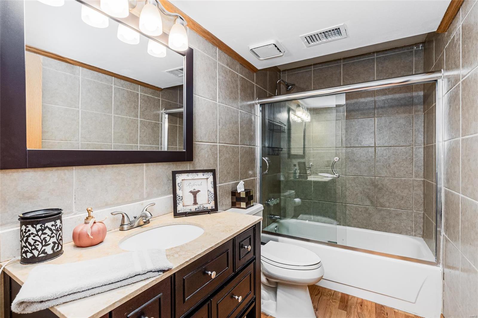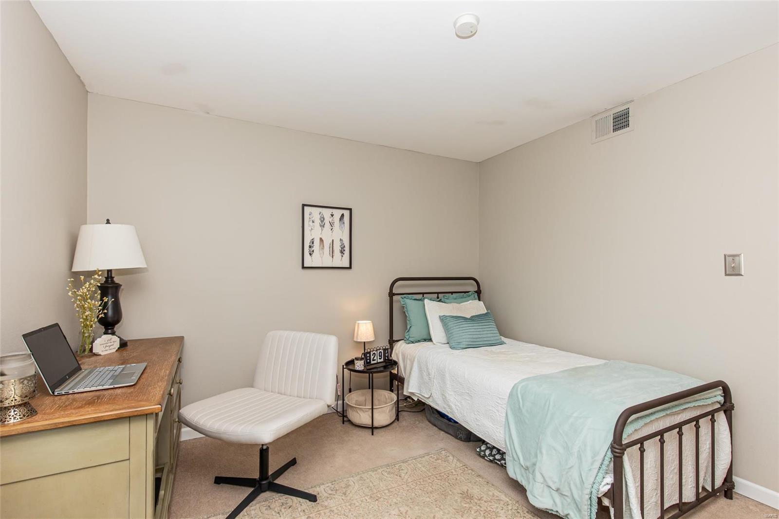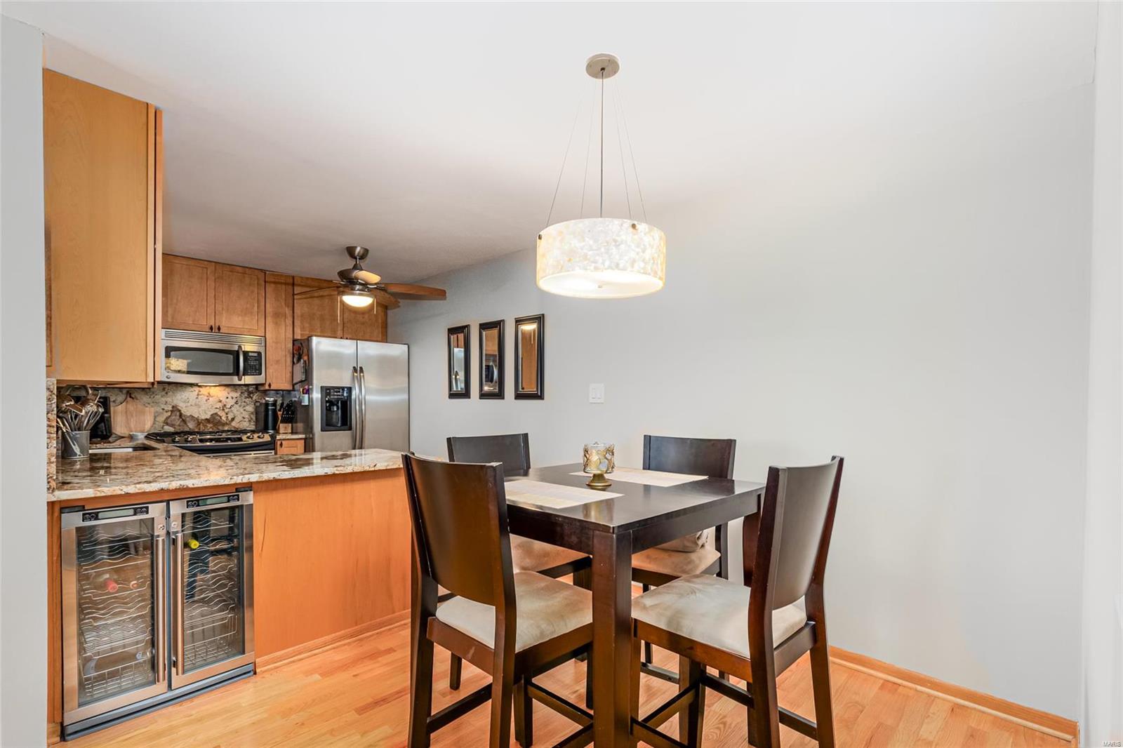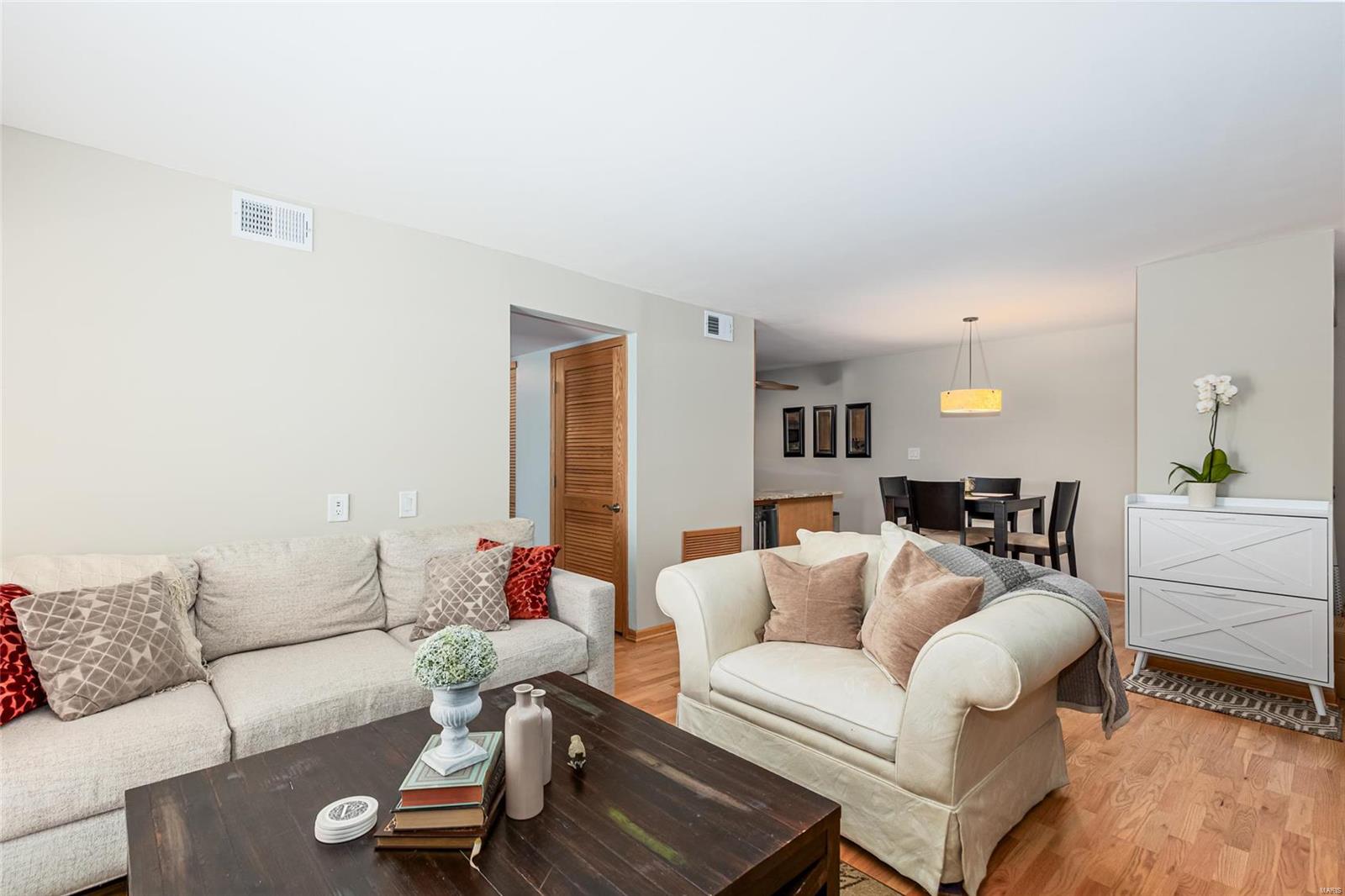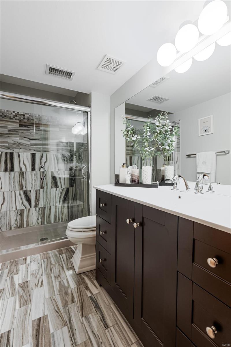Discover the perfect blend of luxury and low maintenance living! This main floor, 2 bed, 2 bath condo is conveniently nestled in Hickory Sound Condos just a minute away from 141. The community HOA provides access to the clubhouse, tennis courts, and inground pool perfect for the heat of St. Louis Summers. The entry foyer opens into the spacious living room and seamlessly connects to the dining area with adjacent kitchen. A sleek granite peninsula offers ample workspace while 42 inch cabinets ensure you have enough storage. The kitchen also boasts stainless steel appliances, gas stove, and trendy countersplash. Down the hallway leads to the primary bedroom with walk in closet and spa like ensuite. In unit washer and dryer, full hall bath, additional bedroom, & utility closet complete the interior of the unit. Be able to get outside without ever leaving your home, the covered balcony deck off the living room provides additional space and storage. Unit comes with 1 assigned parking space.