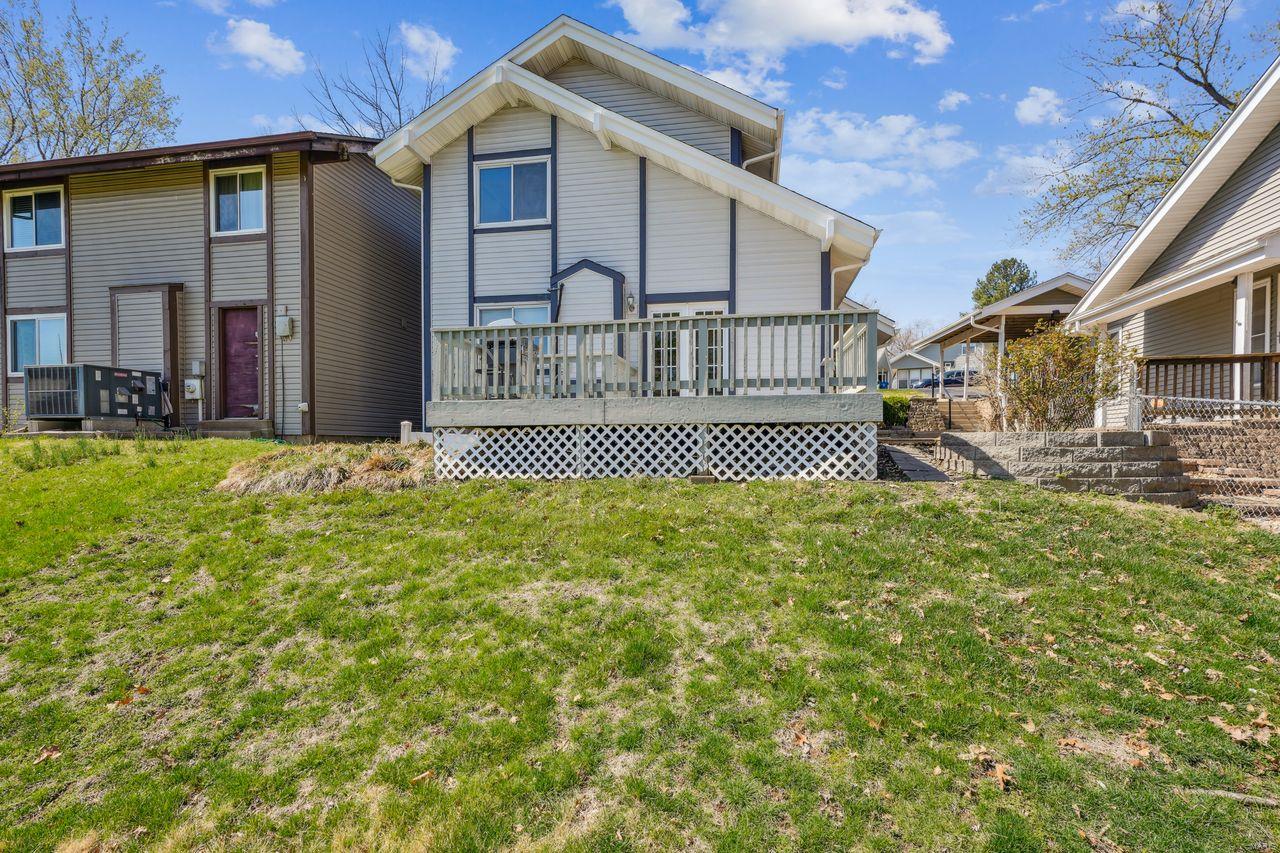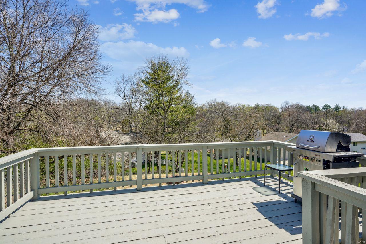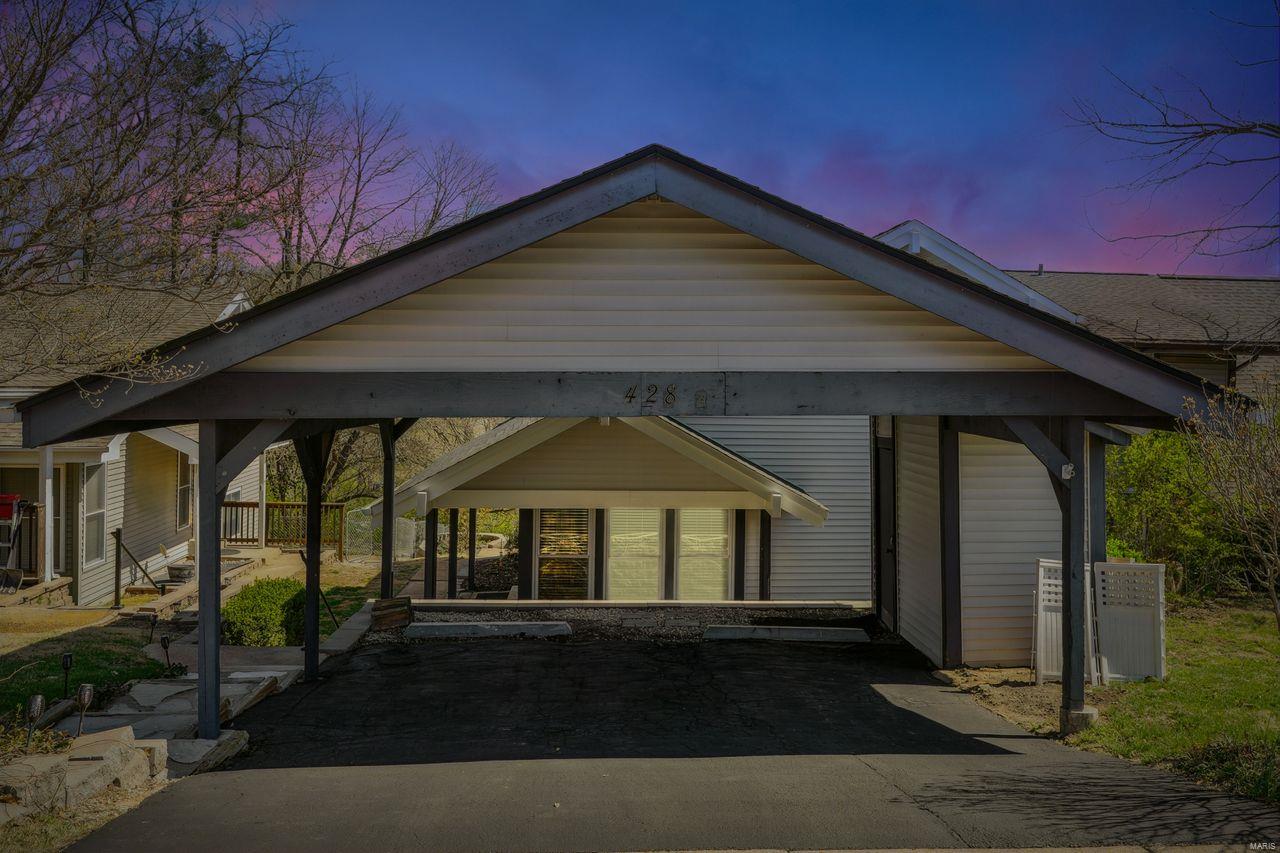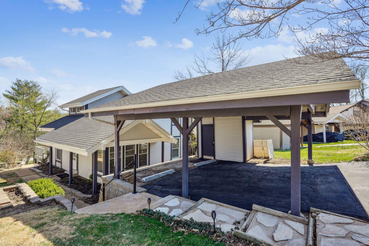 Welcome to this charming 1.5-story contemporary Ballwin home. 3-bedrooms, 2-full baths and 1313 sq. ft. of living space! Once you enter, you are welcomed by beautiful vaulted ceilings in the living room, then met by hardwood floors, and an eat-in kitchen with stainless steel appliances, granite counter tops. French doors lead to a peaceful back yard and an oversized deck for gatherings. Main-level laundry is ultra convenient. Upstairs offers two bedrooms and a full bath. Main level bedroom can be used as an office. Enjoy a private subdivision pool, plus shopping, parks, and recreation nearby. 2-car covered carport conveniently located in front of home. This home is wonderfully comparable to condo/villa living, with the first year of HOA fees and a 1-year home warranty INCLUDED! Located in the sought-after Parkway School District. This home is #theone.
