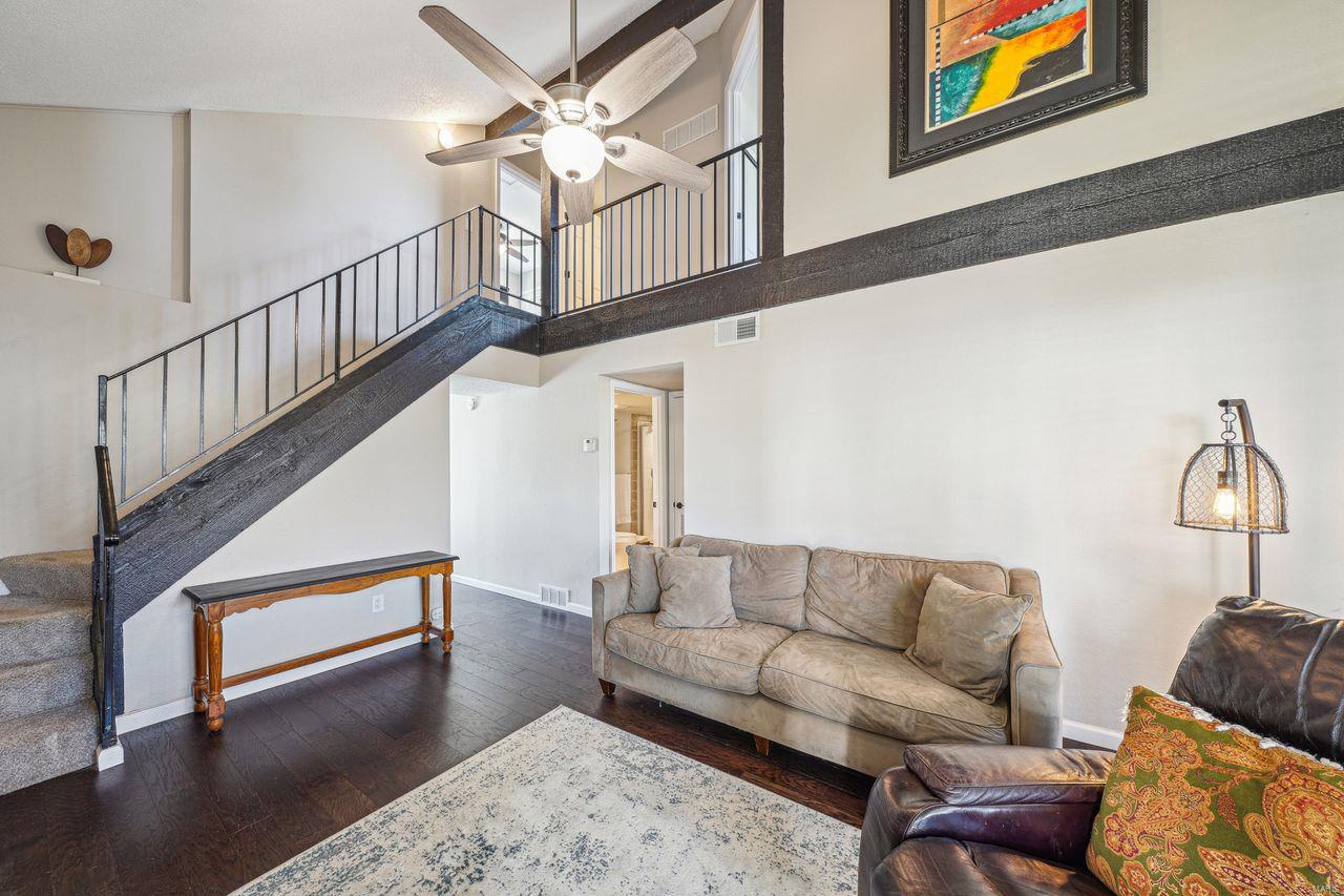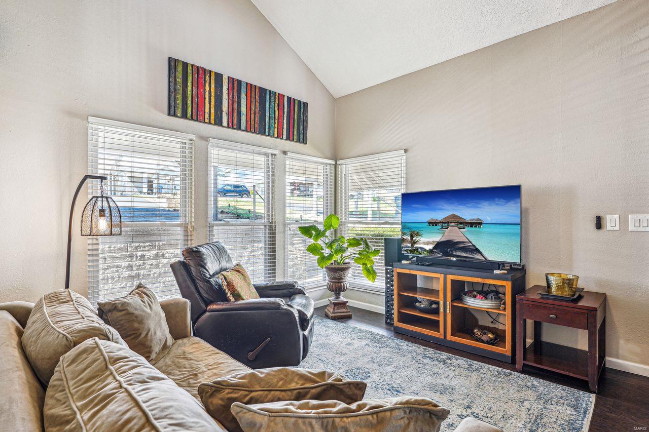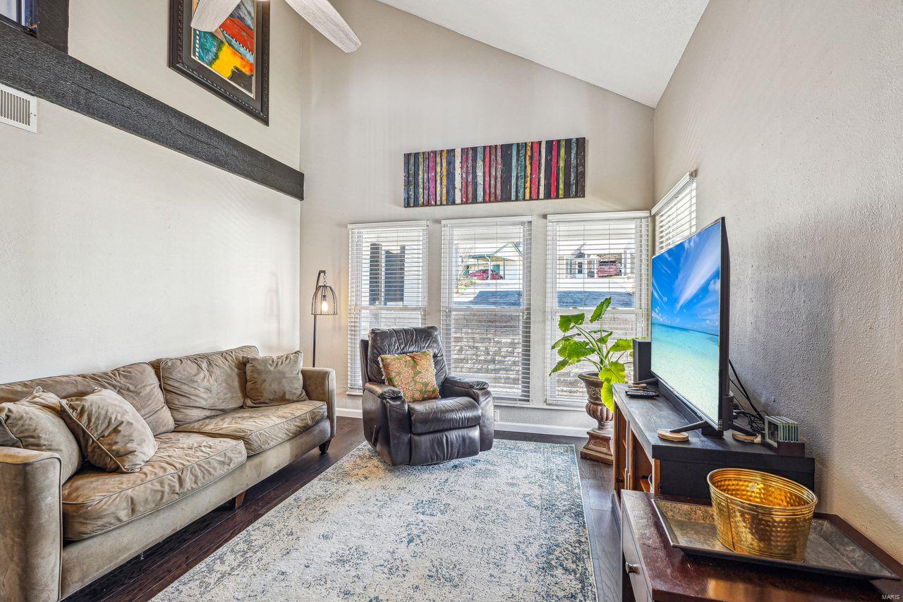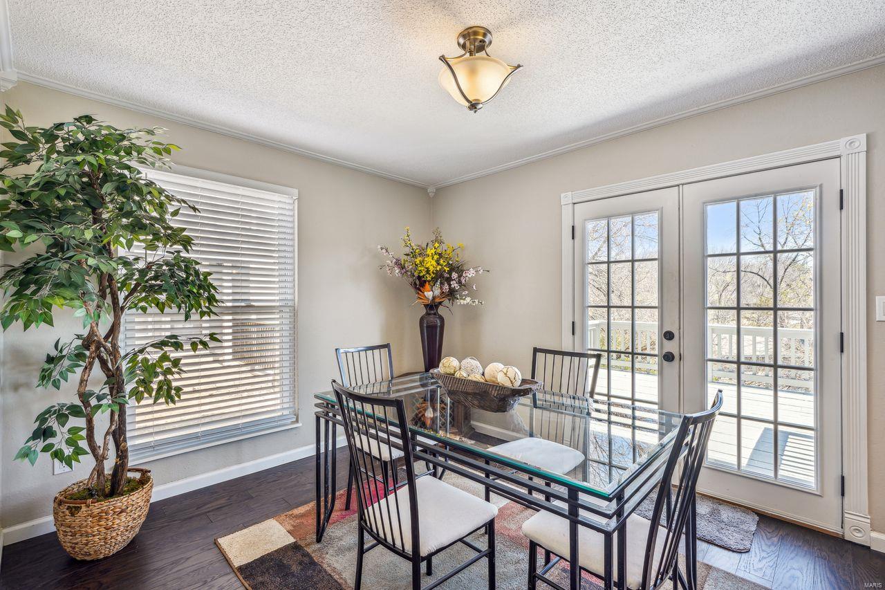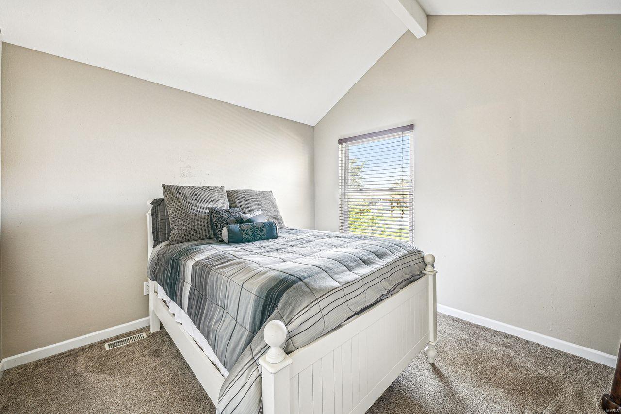 Welcome to this charming 1.5-story contemporary Ballwin home. 3-bedrooms, 2-full baths and 1313 sq. ft. of living space! Once you enter, you are welcomed by beautiful vaulted ceilings in the living room, then met by hardwood floors, and an eat-in kitchen with stainless steel appliances, granite counter tops. French doors lead to a peaceful back yard and an oversized deck for gatherings. Main-level laundry is ultra convenient. Upstairs offers two bedrooms and a full bath. Main level bedroom can be used as an office. Enjoy a private subdivision pool, plus shopping, parks, and recreation nearby. 2-car covered carport conveniently located in front of home. This home is wonderfully comparable to condo/villa living, with the first year of HOA fees and a 1-year home warranty INCLUDED! Located in the sought-after Parkway School District. This home is #theone.