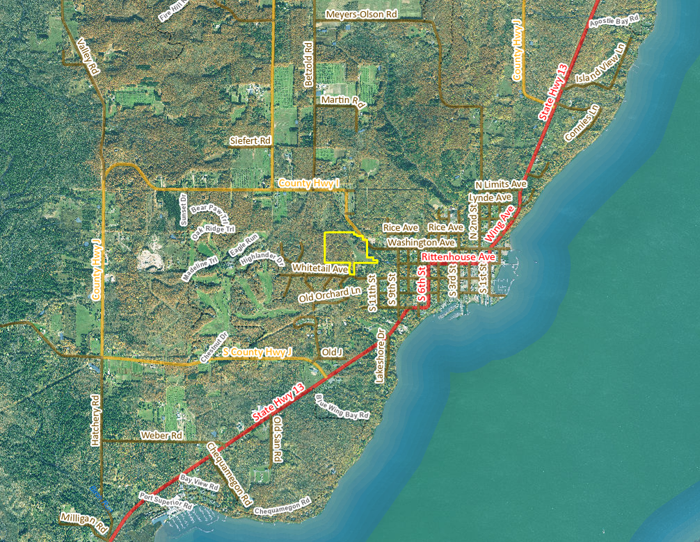 Hidden out of sight on the edge of the City of Bayfield, this former deer farm of 29.79+/- acres has incredible Lake Superior views and phenomenal development potential. With mature red oak, white pine and birch woods, it could be a conservation subdivision holding the grassy field, meadow and woods in common with luxury townhomes with the view of Lake Superior above the mature woods. The meadow on the upper glacial ridge is blooming with native flowers throughout summer, surrounded by mature forests with mushrooms and moss. Several pocket neighborhoods could be nestled on the glacial ridges with views of the meadow and field and the ferry headed to Madeline Island on Lake Superior in the distance. It could have mixed housing with houses or apartments on the upper meadow, and duplexes looking out over the lower field. Any of these could be built in the Bayfield Township parcel. The City of Bayfield parcel has existing lots which could be rezoned to create a neighborhood of small homes around a central circular field. It has access from other platted streets. All these could have connected walking trails from the old orchard, along the deep ravine with water running all year, up the slopes to the meadow and more. The locals have used the property as a hidden park for cross-country skiing and exercising dogs for years. Just minutes to downtown Bayfield but completely private with its access through the old apple orchard. This is the only large, private, and unbuilt piece of land so close to the city of Bayfield, the most preferred home location in all of Bayfield County.