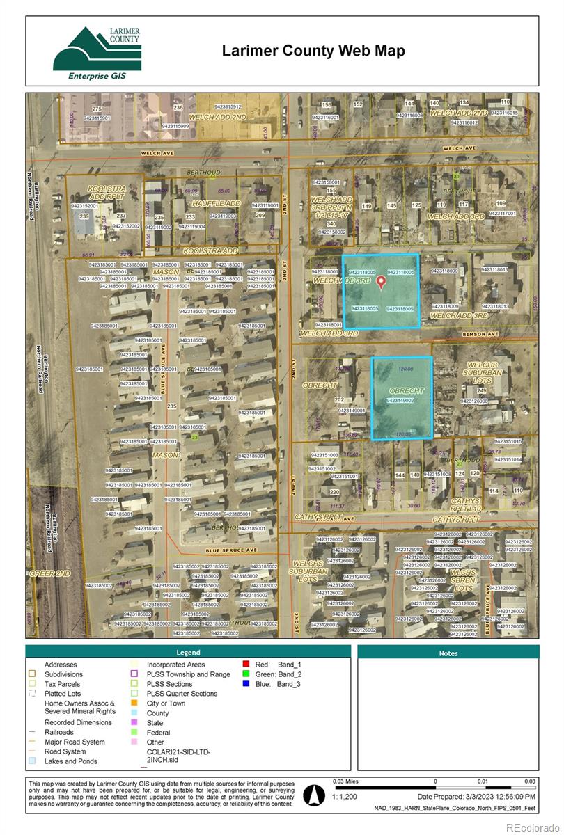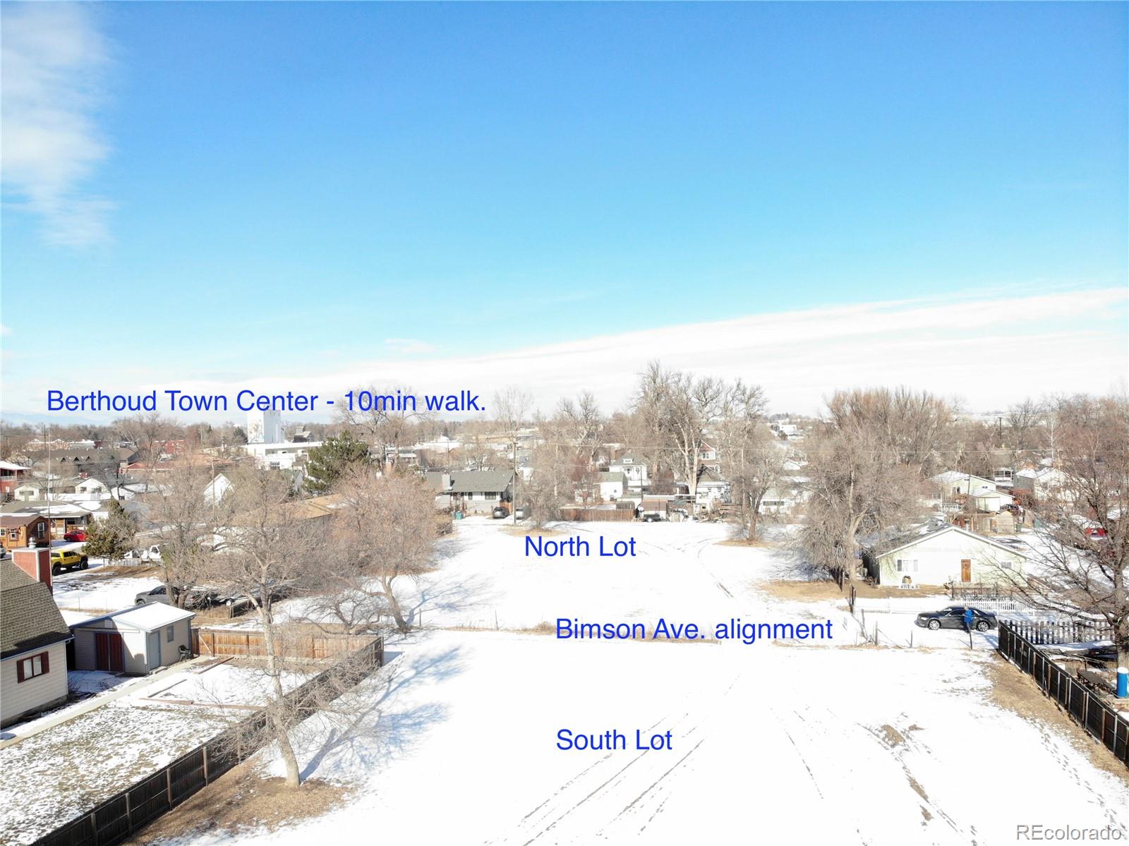 Excellent development investment opportunity in the highly coveted Berthoud, Larimer County, Northern Colorado area! Close to shopping, work, and transportation. Lush, quiet, private, green, ½-acre infill site. This property is zoned R3 and use by right allows for construction of up to 10 units (20/Acre): single-family, duplexes, townhomes, multi-family allowed. 5-minute walk to Mountain Ave (main street) / downtown Berthoud. No HOA. No Deed Restrictions. Park your RV and toys on site. Room for large garages / shop. Existing wet and dry utilities available on N, E, W sides of lot. Low-Density and High-Density conceptual designs available. Extensive soils tests conducted recently—ground conditions are excellent for residential construction. The owner of these lots has held multiple productive discussions with the Planning, Public Works, and Fire Departments of the Town of Berthoud. They are all very familiar with these lots and have been very receptive to each of the development concepts--high density 20-plex design and several different medium-density townhome w/ ADU designs. ***See Supplementals for potential development ideas***Phase 1 Environmental Study complete: “This assessment has revealed no recognized environmental conditions in connection with the Site.” Recent Alta Survey and Topo survey performed.The parcel to the north (9423118005) is approximately 0.517 acres and is also for sale. The two parcels are adjacent to the Bimson Ave alignment, west of 1st Street. Buyer to verify all data.
