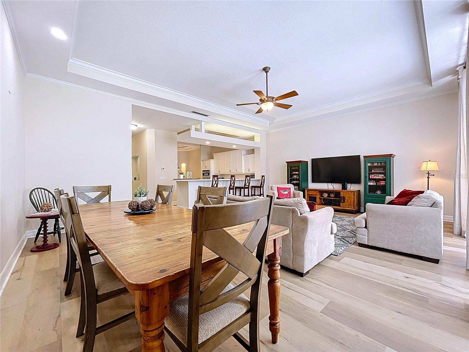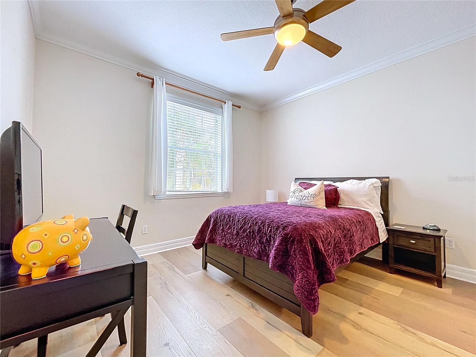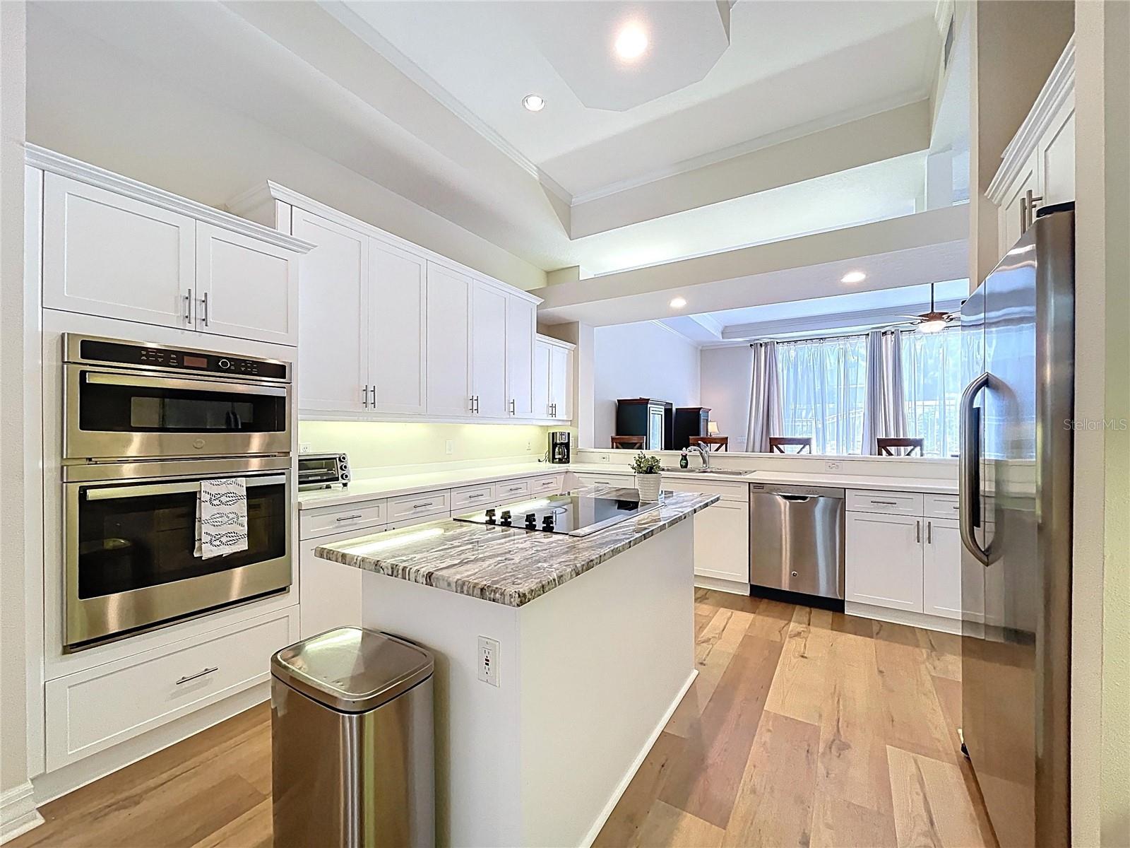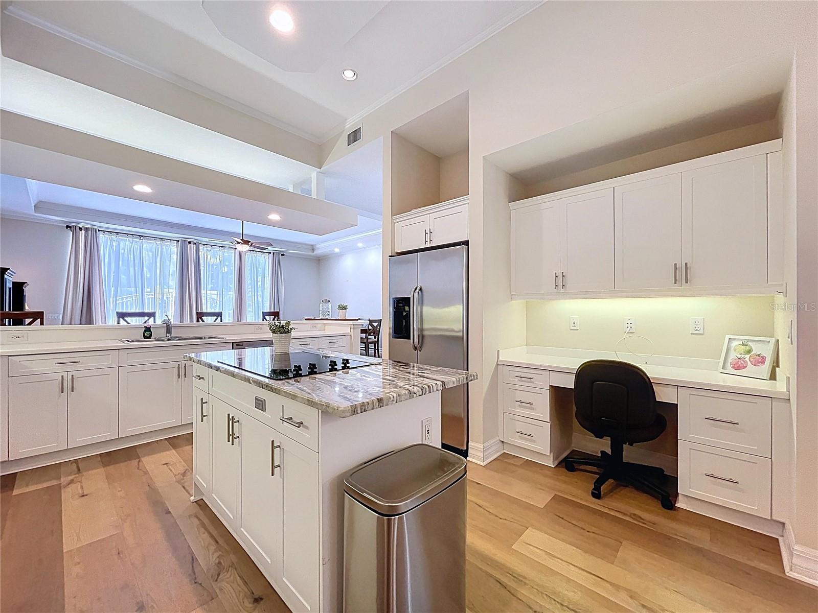 The chef’s kitchen is a culinary delight, equipped with high-end stainless steel appliances, corian countertops featuring granite island, and a welcoming breakfast bar that flows into the elegant dining area. The adjoining family room is the heart of the home, featuring tall sliding doors that open to one of the largest tiled patios in the community, creating a seamless indoor-outdoor flow.