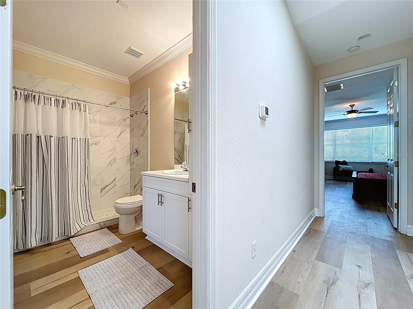 Convenience is key with a large home office, a well-appointed laundry room with built-in cabinetry, and a half bath, all located on the ground floor. The villa also includes two dedicated covered carport spaces and extra guest parking.