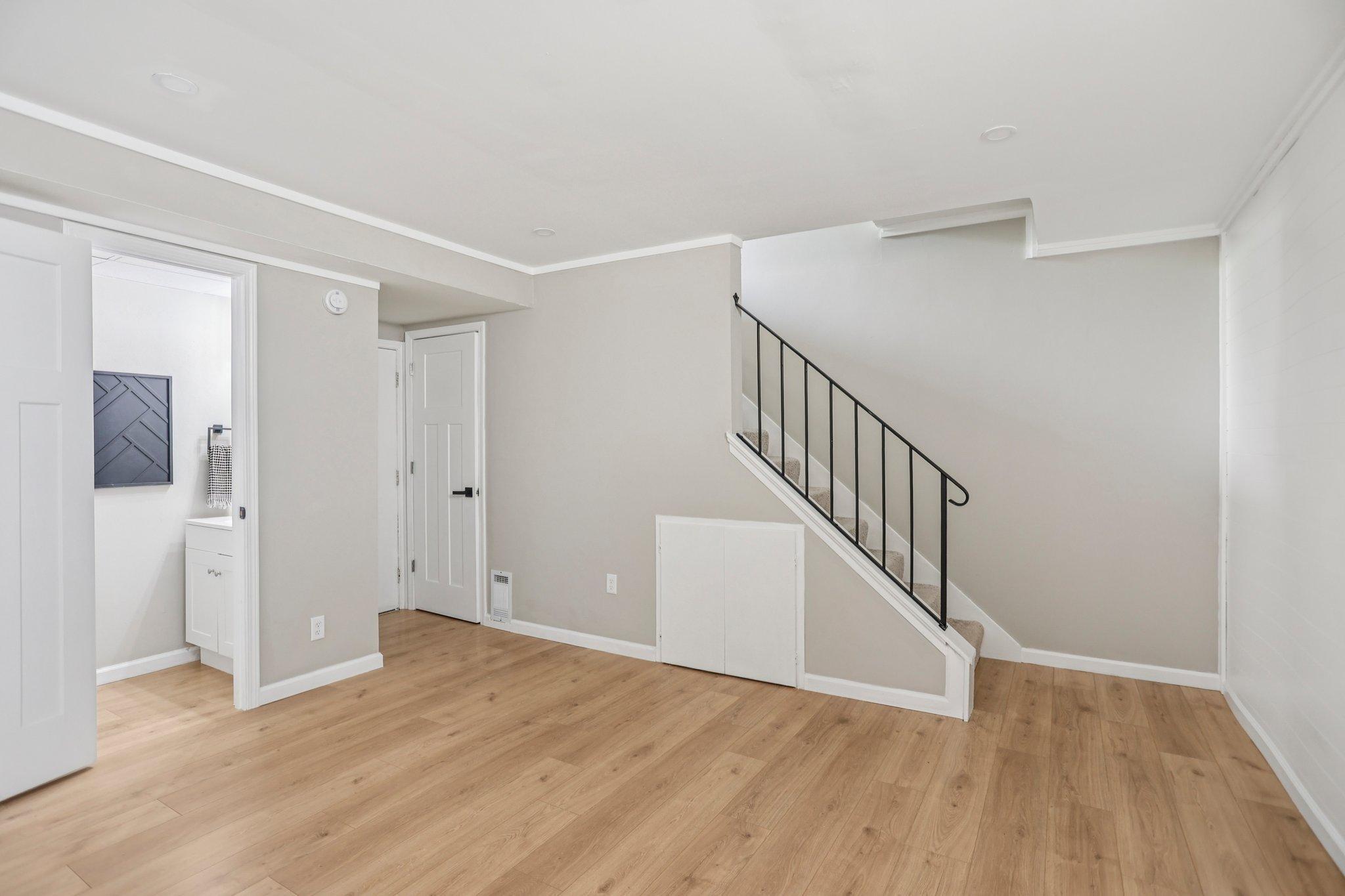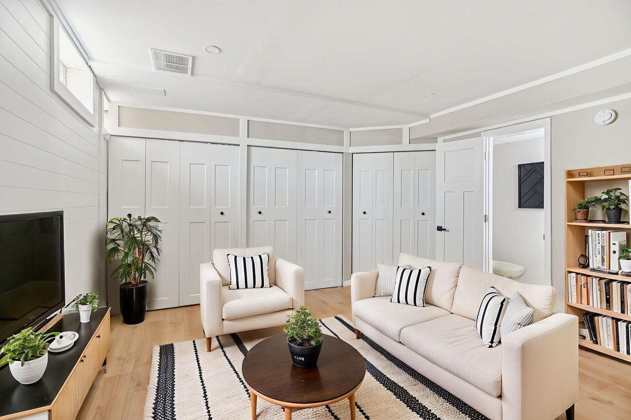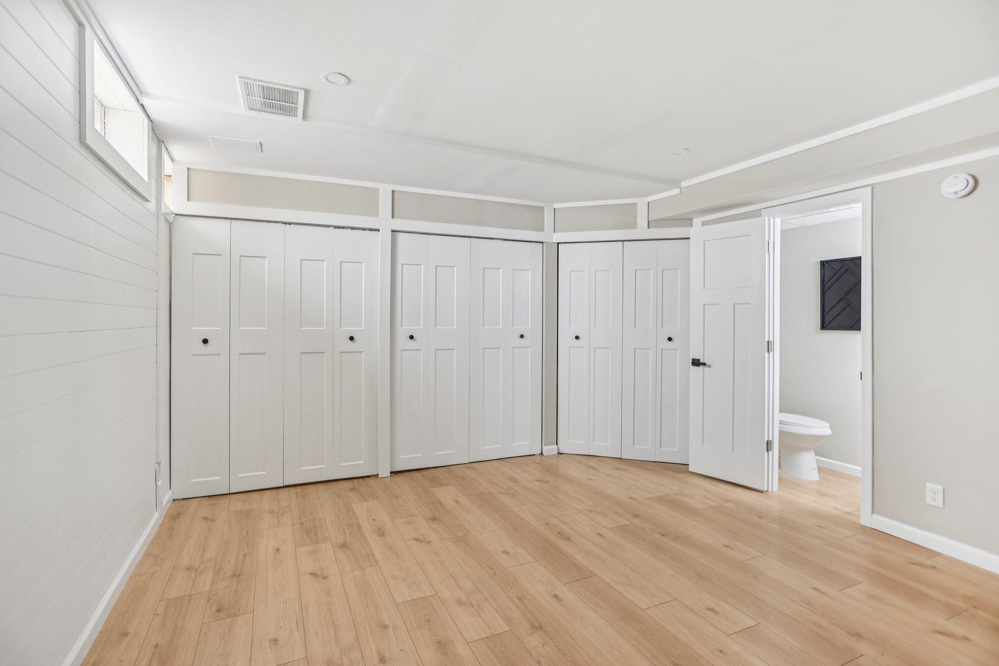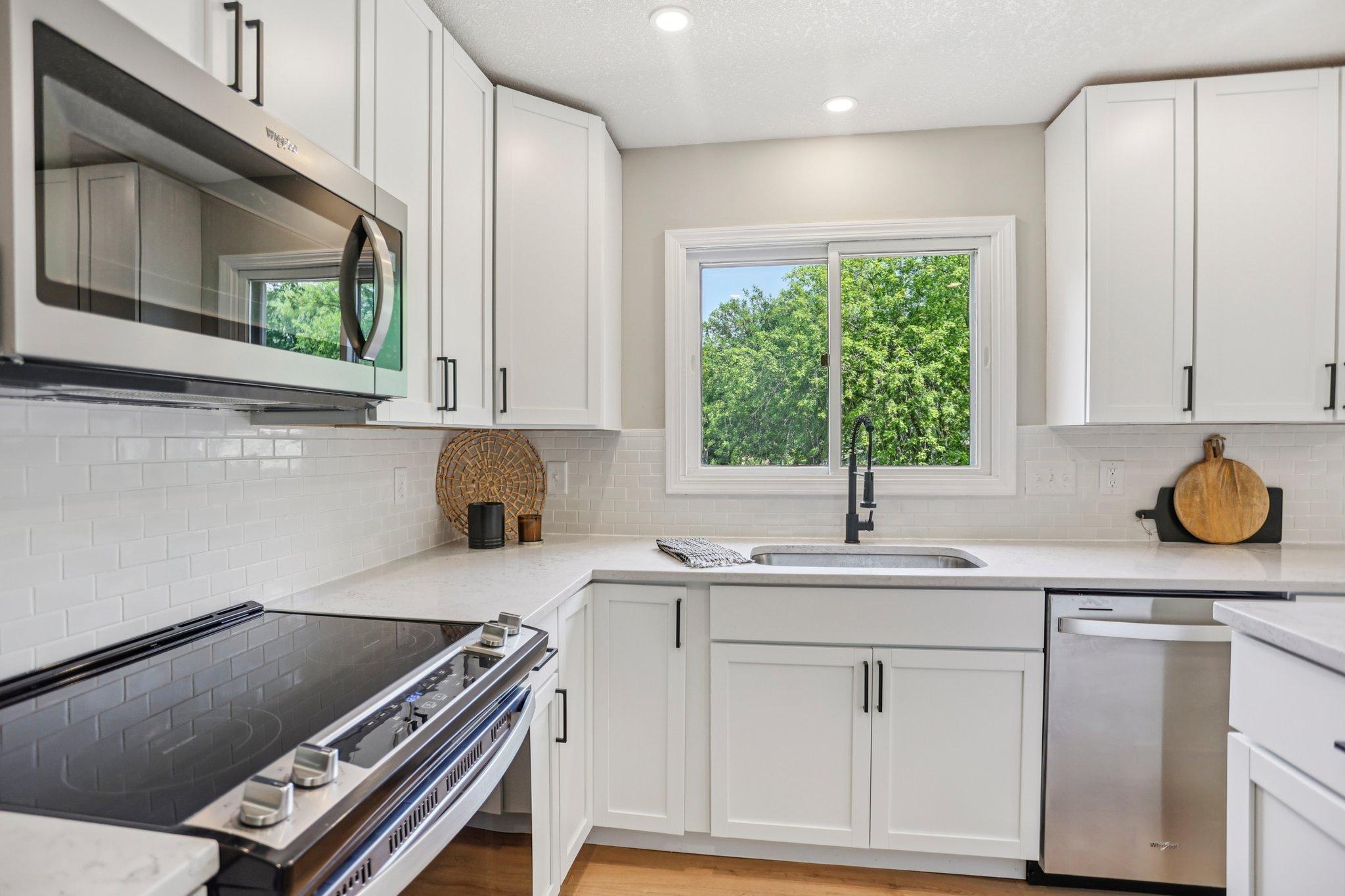 The kitchen is a showstopper, boasting white enameled cabinetry, stainless steel appliances, granite countertops, recessed lighting, and a movable center island for flexible use and entertaining. All appliances are brand new, adding to the modern and fresh feel of the home.
