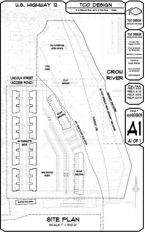 Delano River Bluffs features 10 acres; 6 additional acres available. Ideal for senior housing potential for apartments, townhomes, single family mix. Zoned commercial guided for residential and allowing approx 84 units for development. 8 units per one acre usable high ground. Crow River frontage with city park trail connection to the north and easy access to downtown Delano. Access to County Road 16 from Lincoln Street and emergency access to Highway 12 to the north.