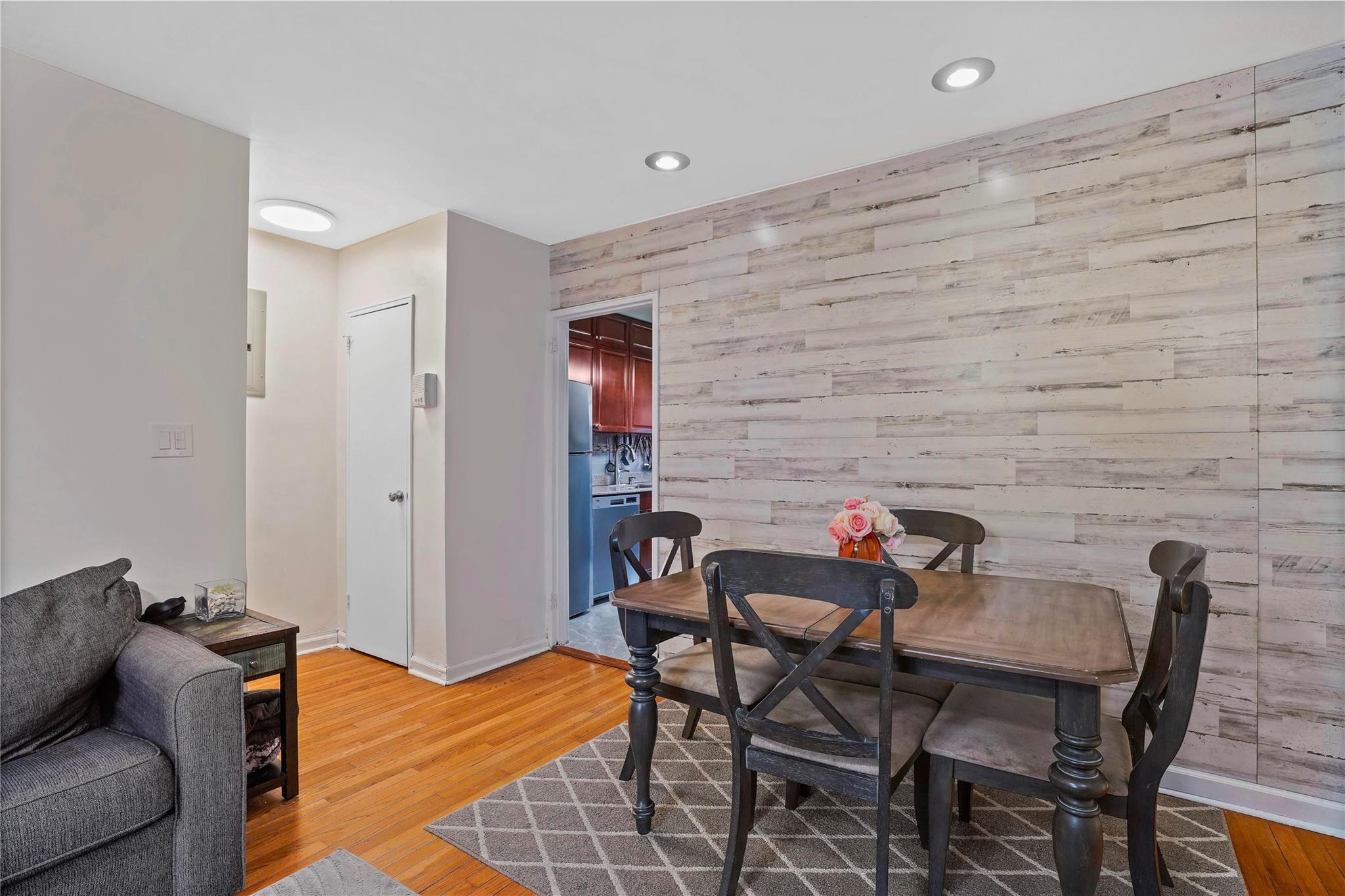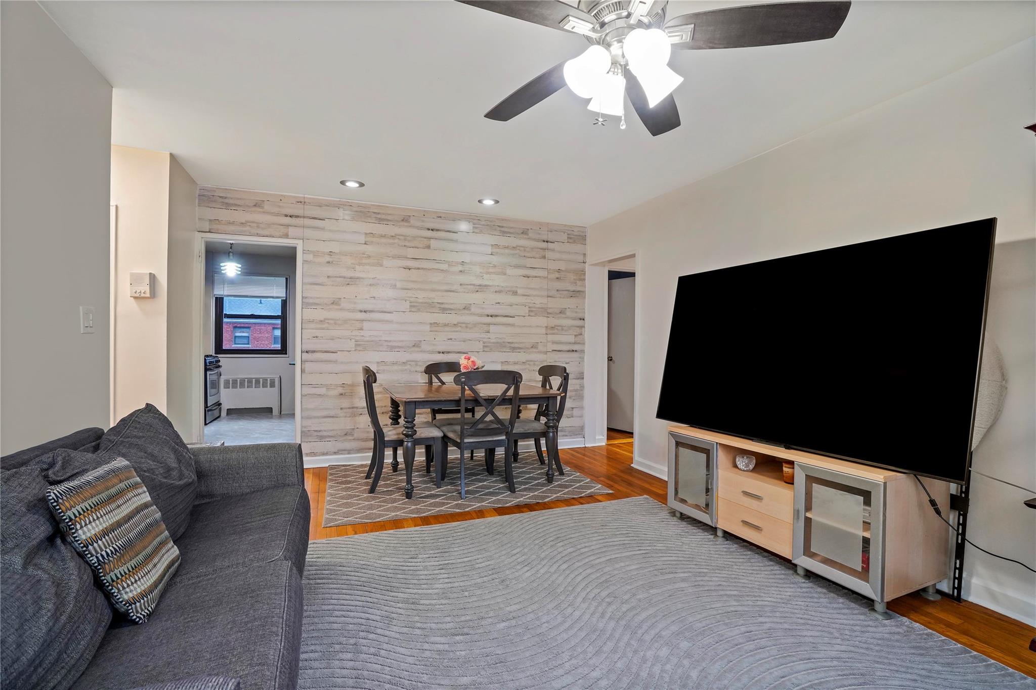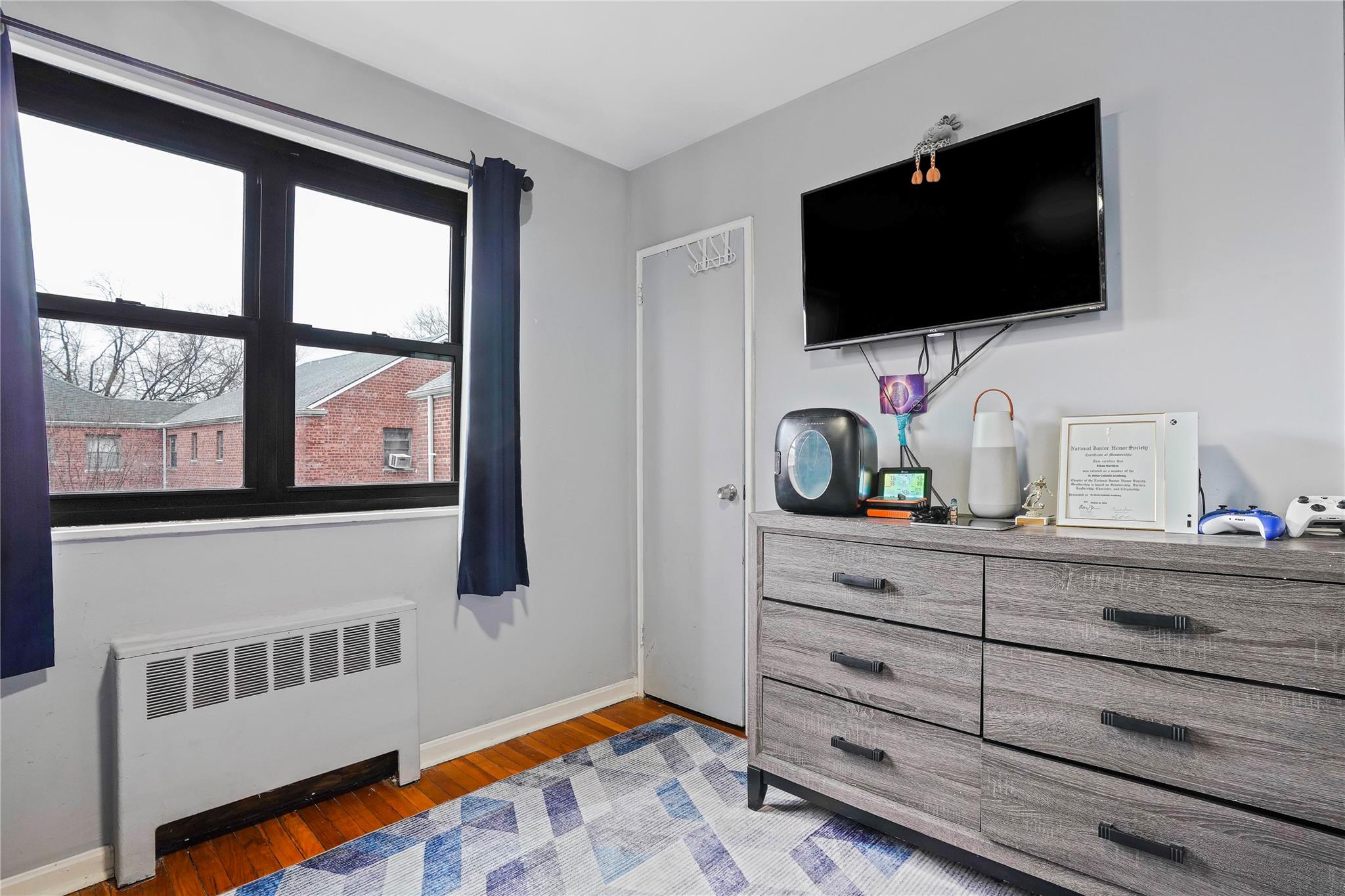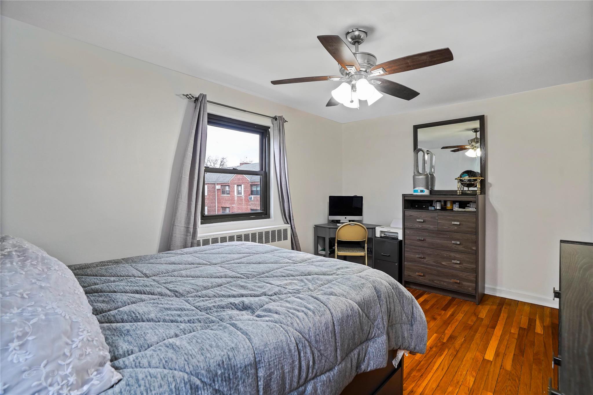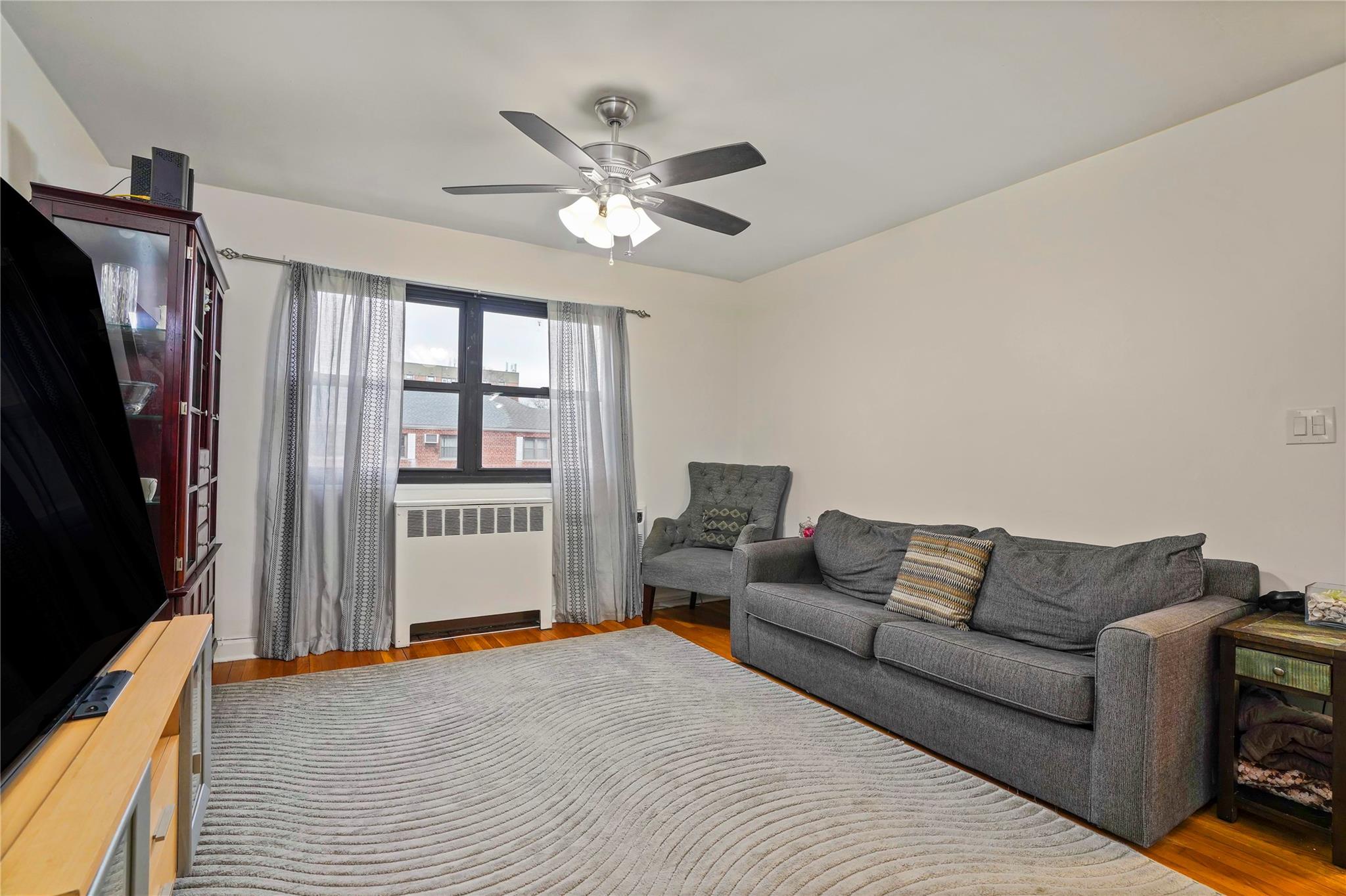 This second-floor garden apartment offers 3 bedrooms and 1 bath in a quiet, courtyard-style cooperative. The unit has just been freshly painted and features overhead light fixtures in every room. The bathroom has been updated and includes a modern vanity. The layout is flexible — keep it as a 3-bedroom, or convert one room into a formal dining area or open up the space between the kitchen and dining area for a more open feel. Plenty of windows throughout the apartment bring in great natural light. Monthly maintenance includes heat, hot water, cooking gas, electric, real estate taxes, and a bulk cable package through Spectrum- offering exceptional value and convenience. The complex is dog-friendly (weight restrictions apply) and has benches out front in the courtyard, perfect for relaxing outdoors. Don’t miss this great opportunity to make this well-maintained home your own! 340 shares, $30/share flip tax.