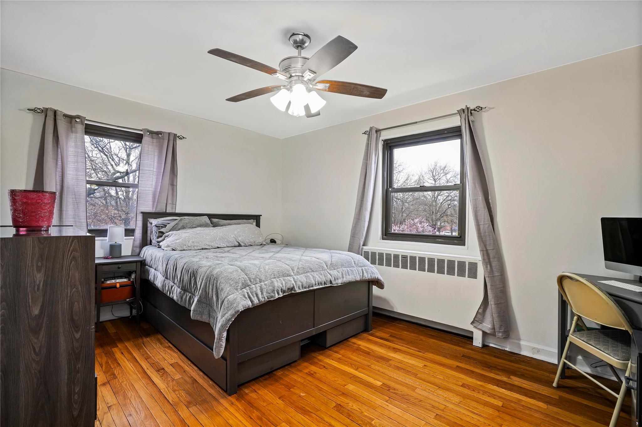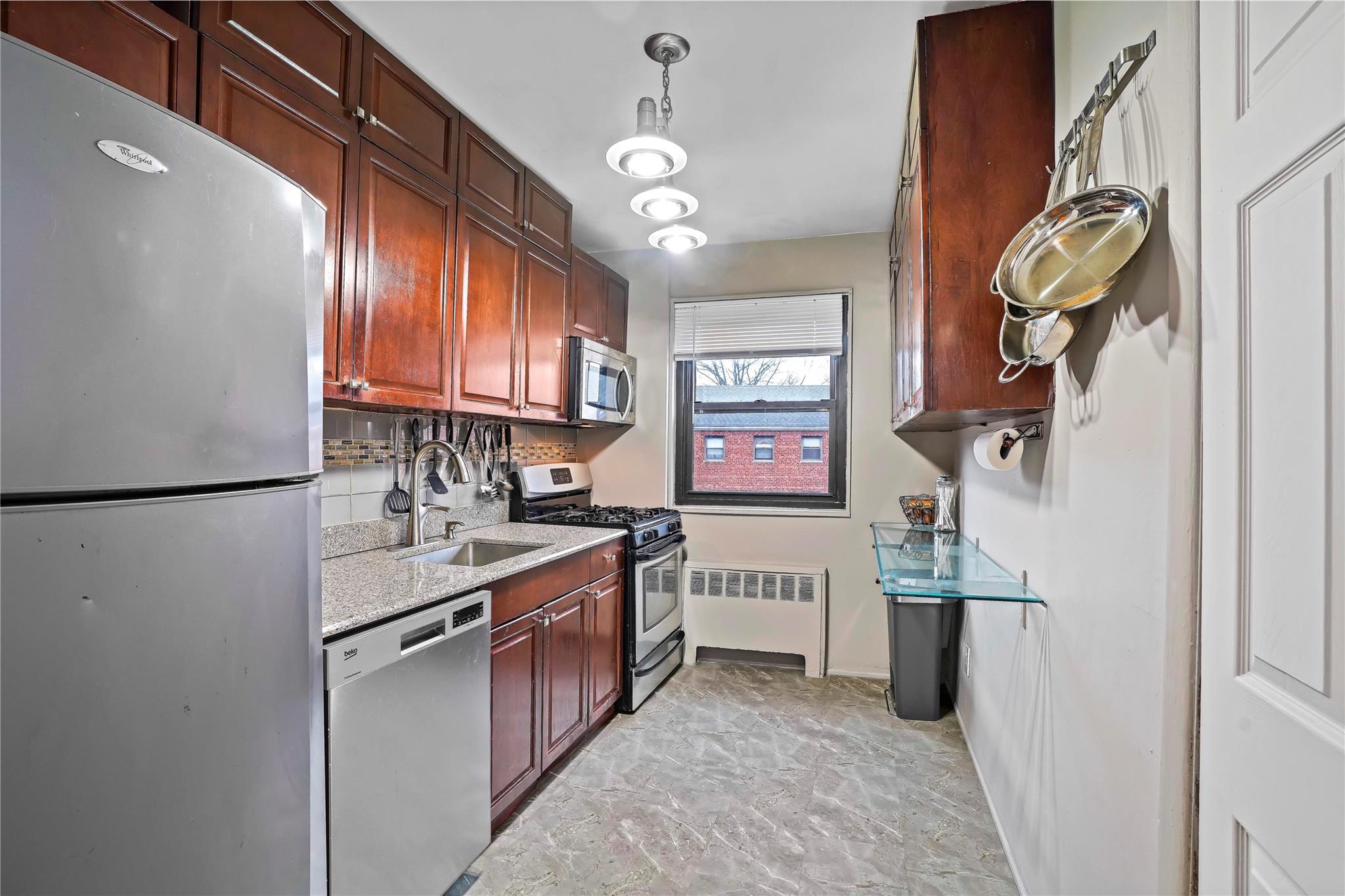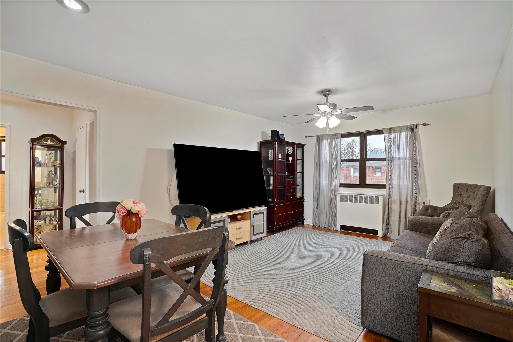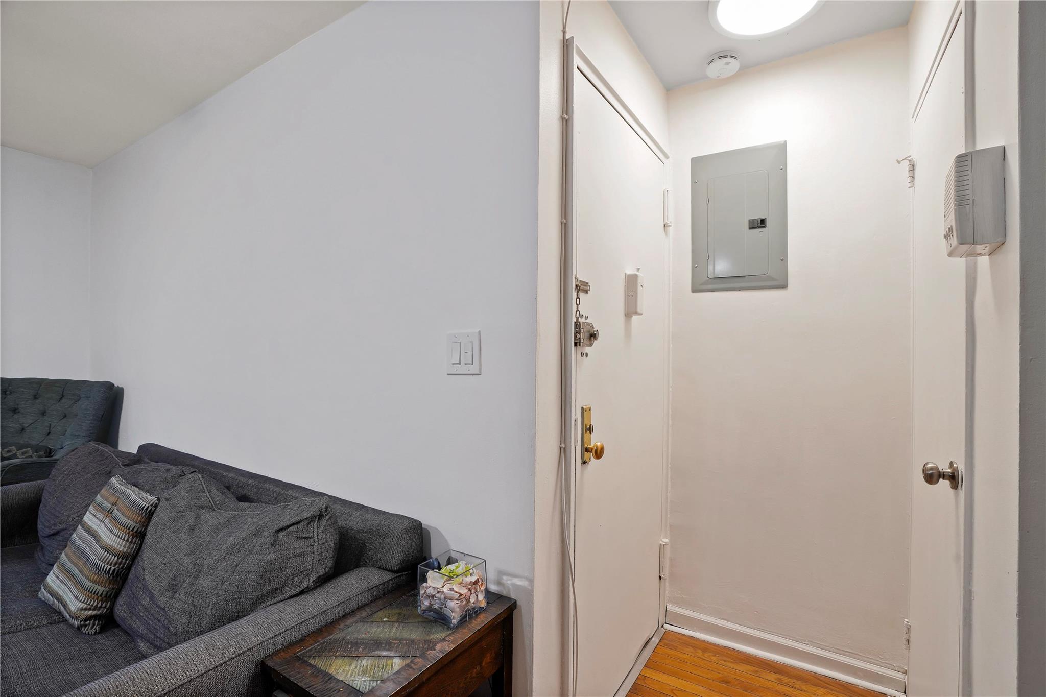 This second-floor garden apartment offers 3 bedrooms and 1 bath in a quiet, courtyard-style cooperative. The unit has just been freshly painted and features overhead light fixtures in every room. The bathroom has been updated and includes a modern vanity. The layout is flexible — keep it as a 3-bedroom, or convert one room into a formal dining area or open up the space between the kitchen and dining area for a more open feel. Plenty of windows throughout the apartment bring in great natural light. Monthly maintenance includes heat, hot water, cooking gas, electric, real estate taxes, and a bulk cable package through Spectrum- offering exceptional value and convenience. The complex is dog-friendly (weight restrictions apply) and has benches out front in the courtyard, perfect for relaxing outdoors. Don’t miss this great opportunity to make this well-maintained home your own! 340 shares, $30/share flip tax.