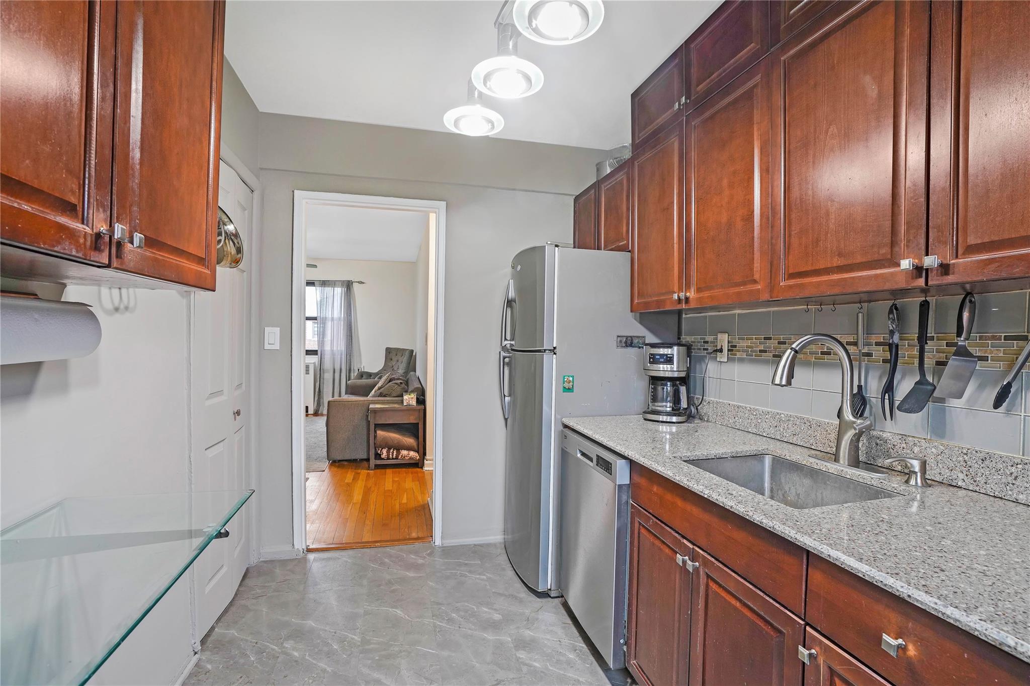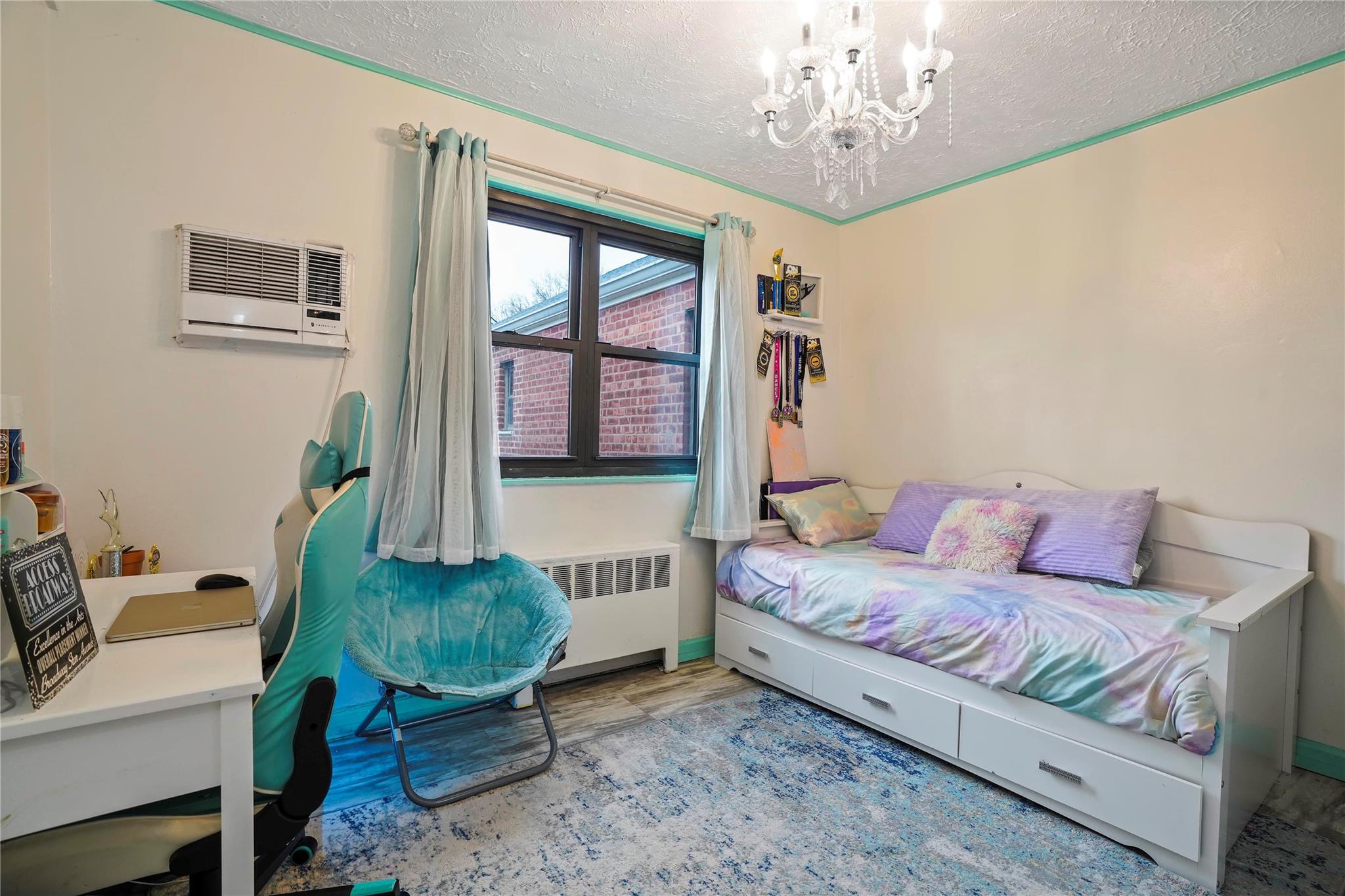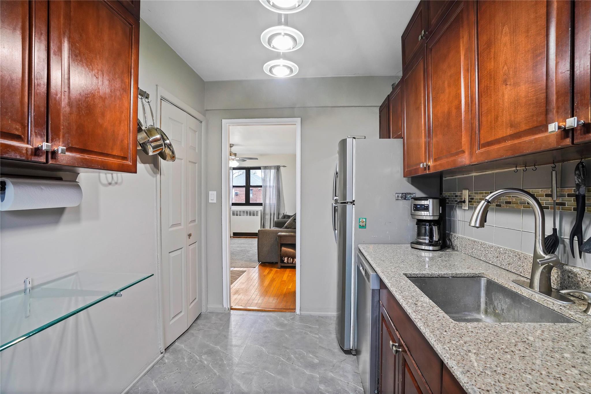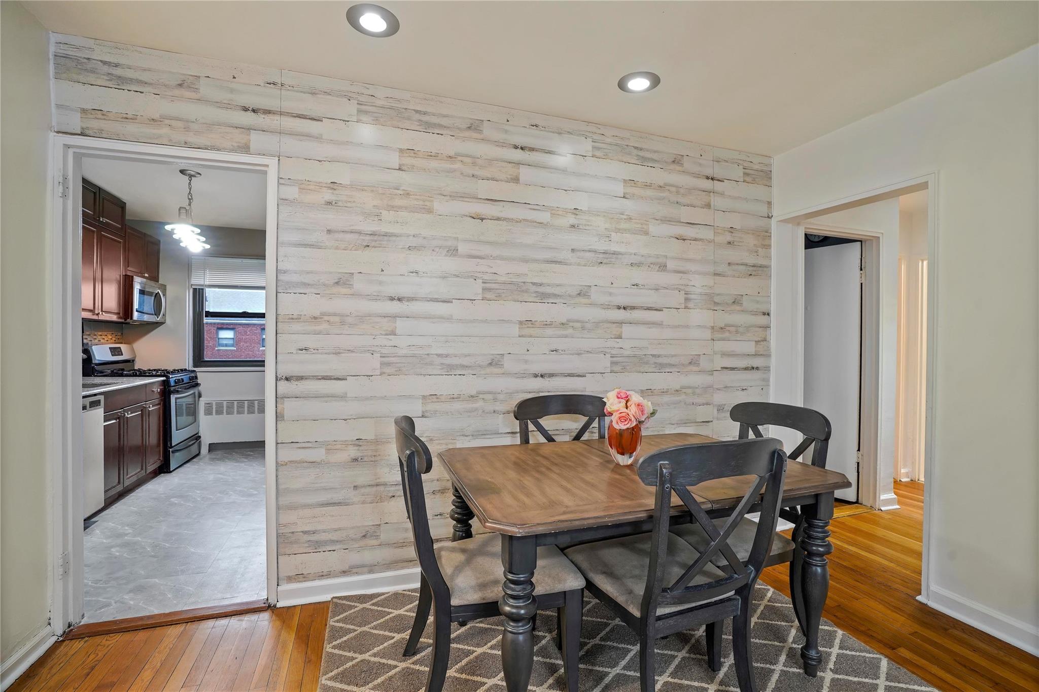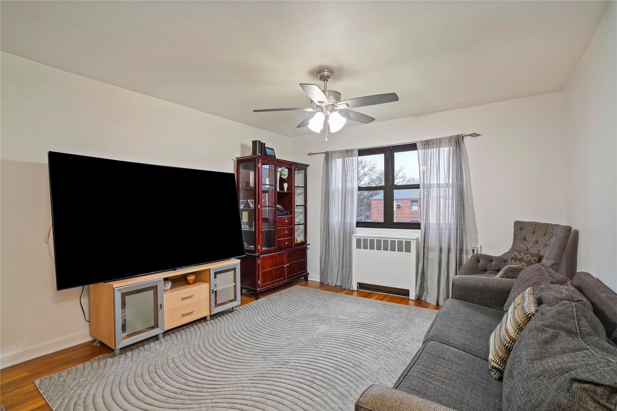 This second-floor garden apartment offers 3 bedrooms and 1 bath in a quiet, courtyard-style cooperative. The unit has just been freshly painted and features overhead light fixtures in every room. The bathroom has been updated and includes a modern vanity. The layout is flexible — keep it as a 3-bedroom, or convert one room into a formal dining area or open up the space between the kitchen and dining area for a more open feel. Plenty of windows throughout the apartment bring in great natural light. Monthly maintenance includes heat, hot water, cooking gas, electric, real estate taxes, and a bulk cable package through Spectrum- offering exceptional value and convenience. The complex is dog-friendly (weight restrictions apply) and has benches out front in the courtyard, perfect for relaxing outdoors. Don’t miss this great opportunity to make this well-maintained home your own! 340 shares, $30/share flip tax.