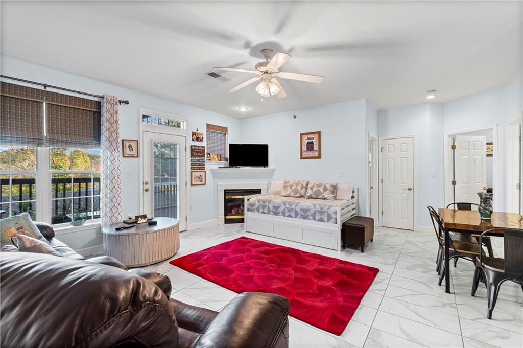 Welcome to this beautifully remodeled 2-bedroom, 1-bath condo in the highly desirable Stonegate community, where modern finishes meet low-maintenance living in a prime location. The open-concept layout features soaring ceilings, abundant natural light, elegant tile flooring, an inviting gas fireplace, and a stylish kitchen with quartz countertops. The spacious living area extends to a private deck—perfect for morning coffee, evening unwinding, or entertaining guests.
