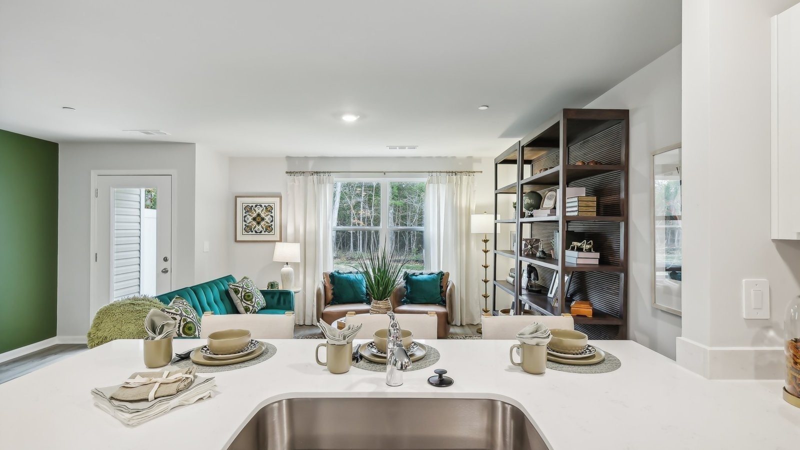 The Pearson is one of our newest townhomes at Saddle Trace in Lewisburg, Tennessee. This modern, open-concept floorplan features 3 bedrooms, 2.5 bathrooms, and a 1-car garage within 1,418 sq. ft. Enjoy low-maintenance townhome living paired with elegant design found only in the Pearson. Upon entering, a foyer and powder room welcome you before opening into the spacious kitchen and living area. The kitchen offers quartz countertop seating and plenty of room for a dining table. Upstairs, the primary bedroom boasts a walk-in closet and an ensuite bathroom with a double-bowl vanity. Two additional bedrooms provide ideal space for children, nurseries, or offices, each with ample closet space. The hallway includes a full bathroom and a convenient upstairs laundry room. Like all Nashville D.R. Horton homes, the Pearson comes equipped with the Home is