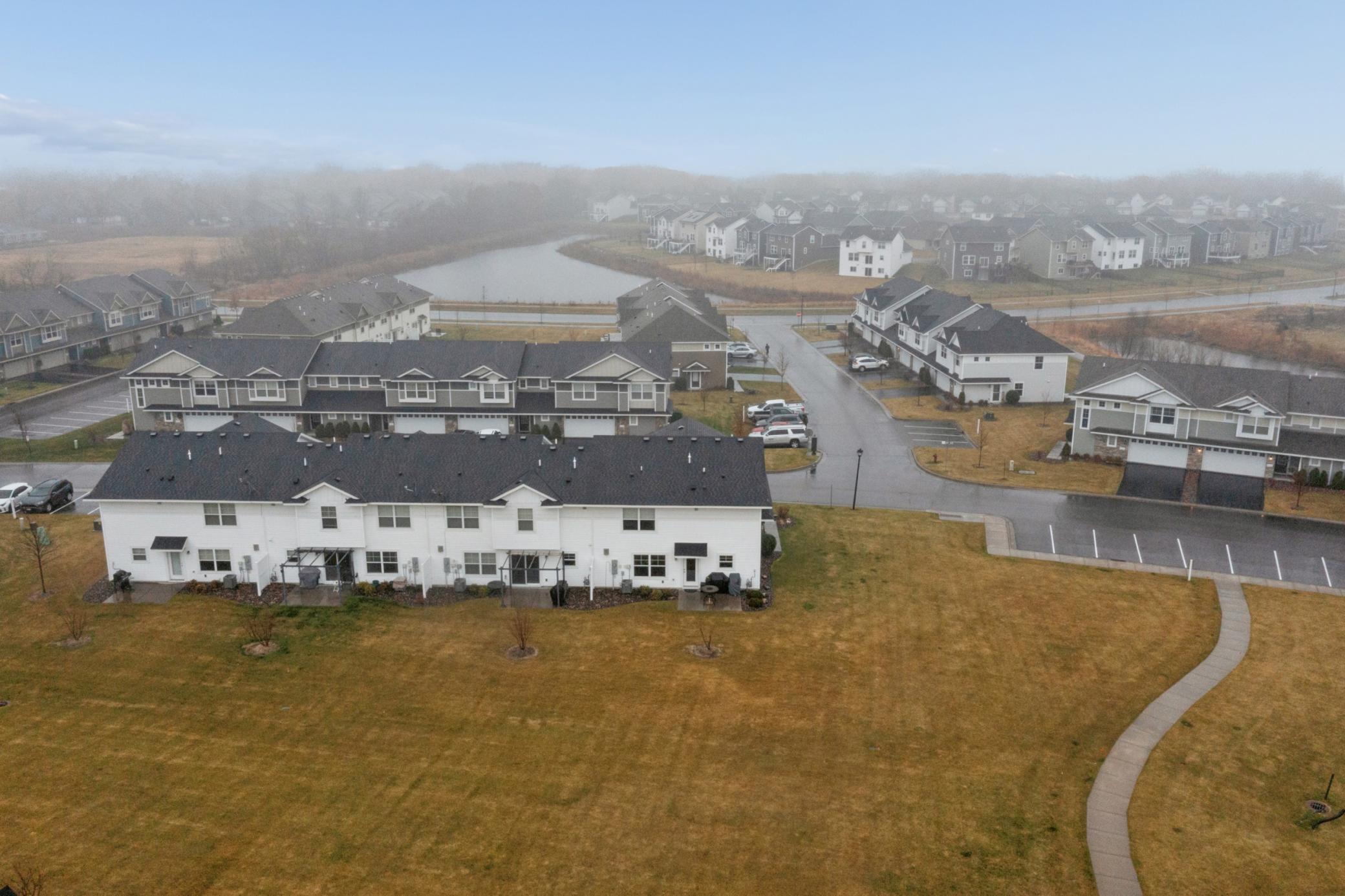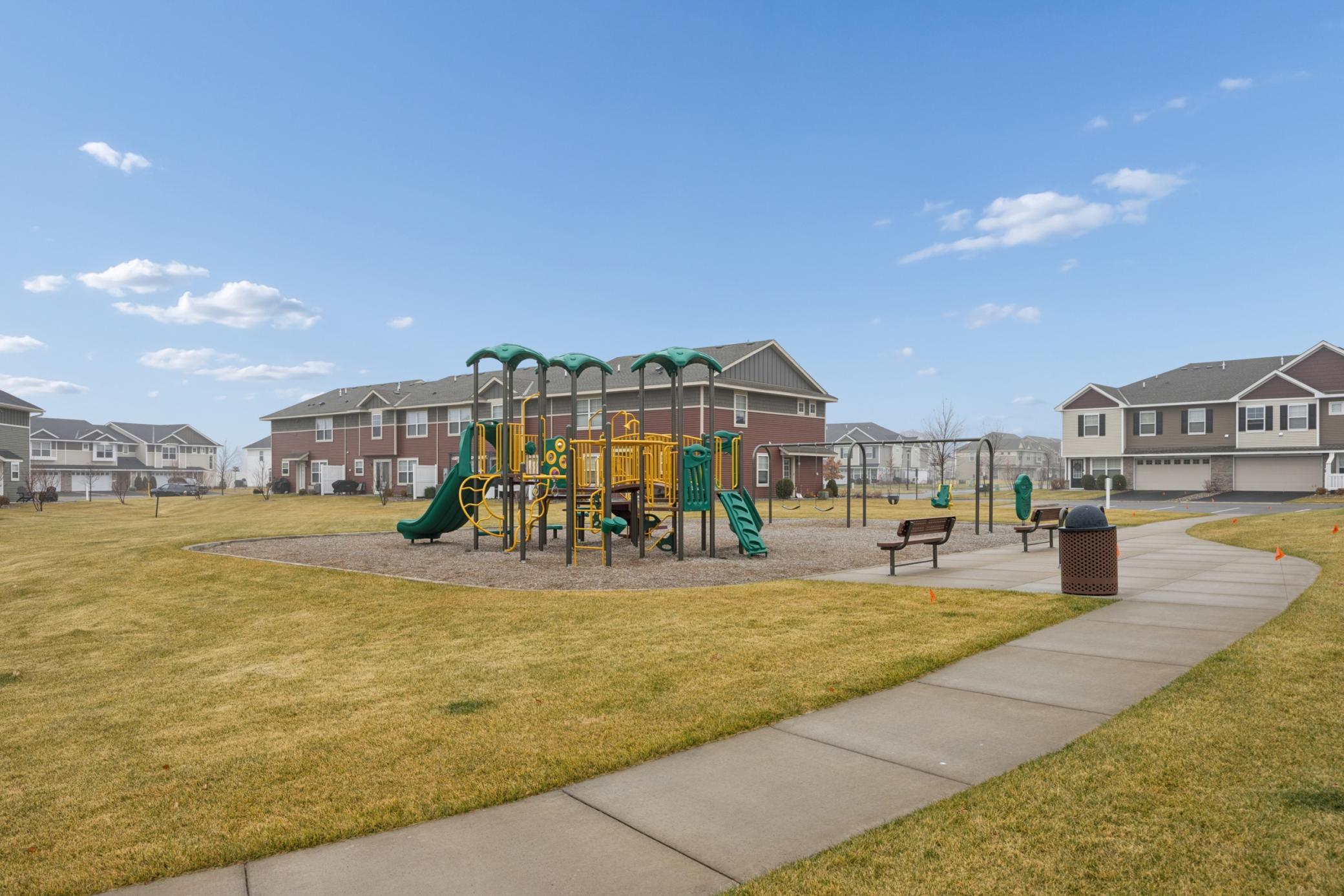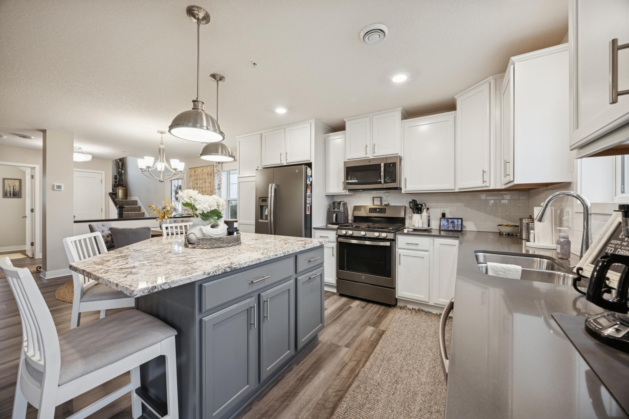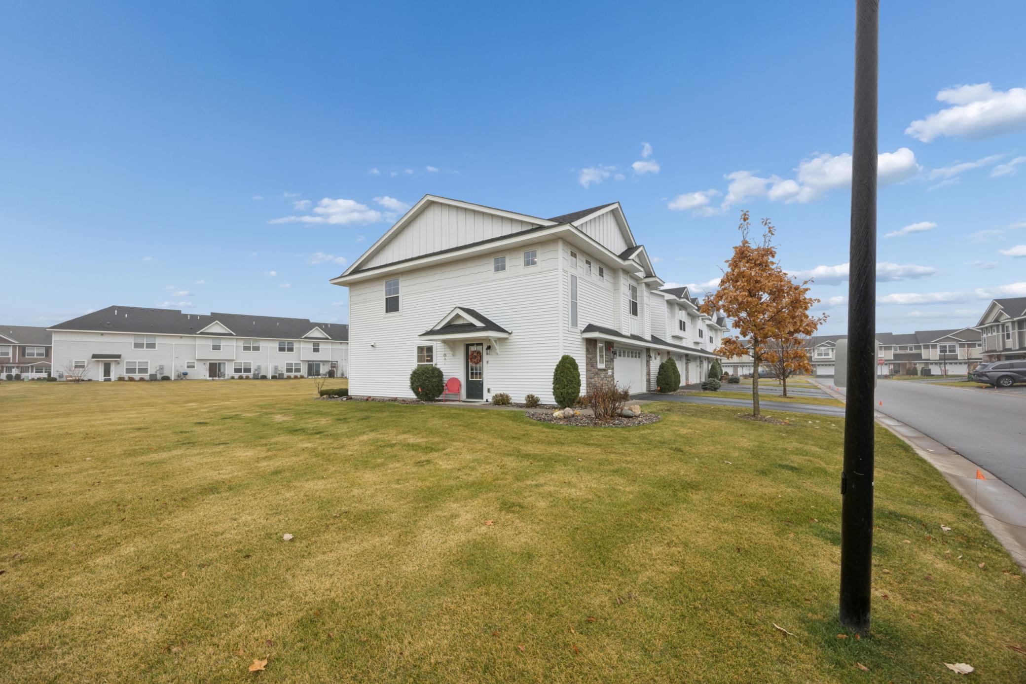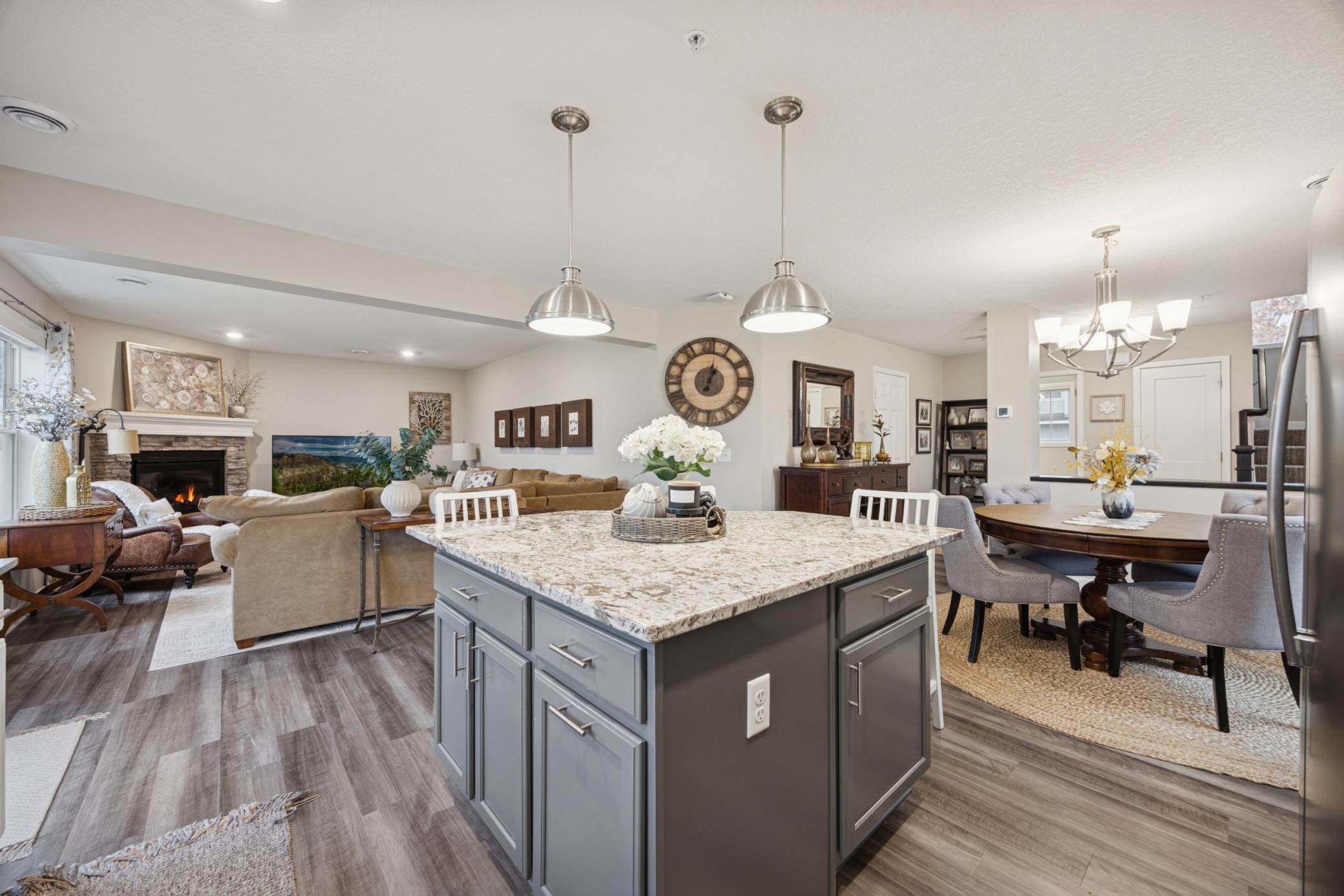Beautifully maintained end-unit townhome located in the sought after Watermark neighborhood in Lino Lakes! The main level features a cozy living room with a stunning stone-accented corner fireplace. Enjoy a bright dining area and an updated kitchen with a sunrise-facing window, ample cabinet space, stainless steel appliances, a modern island with granite countertops, and stylish lighting throughout. Step out to the east-facing patio and enjoy a spacious, private-feeling yard thanks to the generous distance between neighboring townhomes. Upstairs, a versatile loft provides space for an office or additional living area, and the large primary suite includes a ceiling fan, custom closet organizer, and private ¾ bath! Fresh Sherwin Williams paint throughout! Updated dark vinyl plank flooring! Enjoy overhead storage space in the garage! Located close to Centerville Lake, shopping, dining, and quick access to 35E, this home also includes Watermark’s impressive amenities - two playgrounds, pickleball courts, basketball court, a fully equipped fitness center, a rentable clubhouse with fireplace and meeting rooms, and miles of scenic walkways surrounding a pond with its own dock!