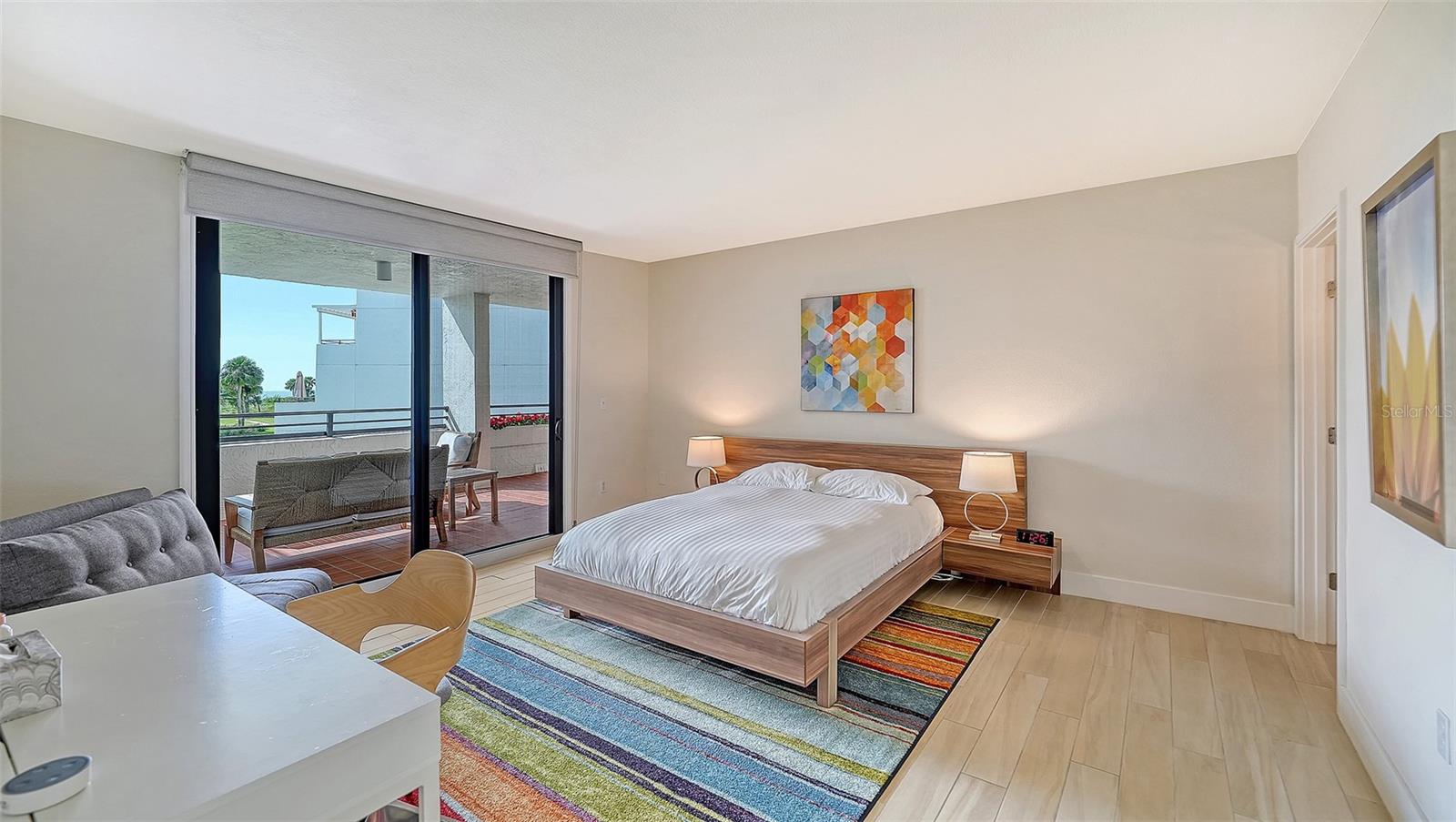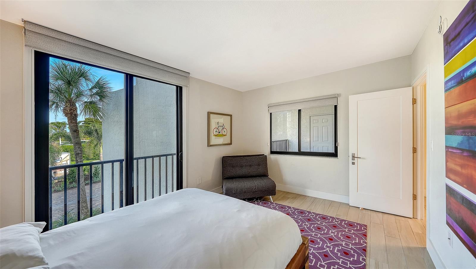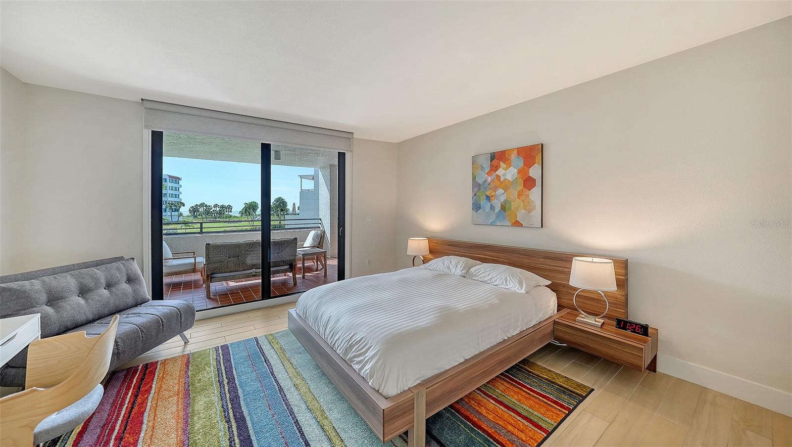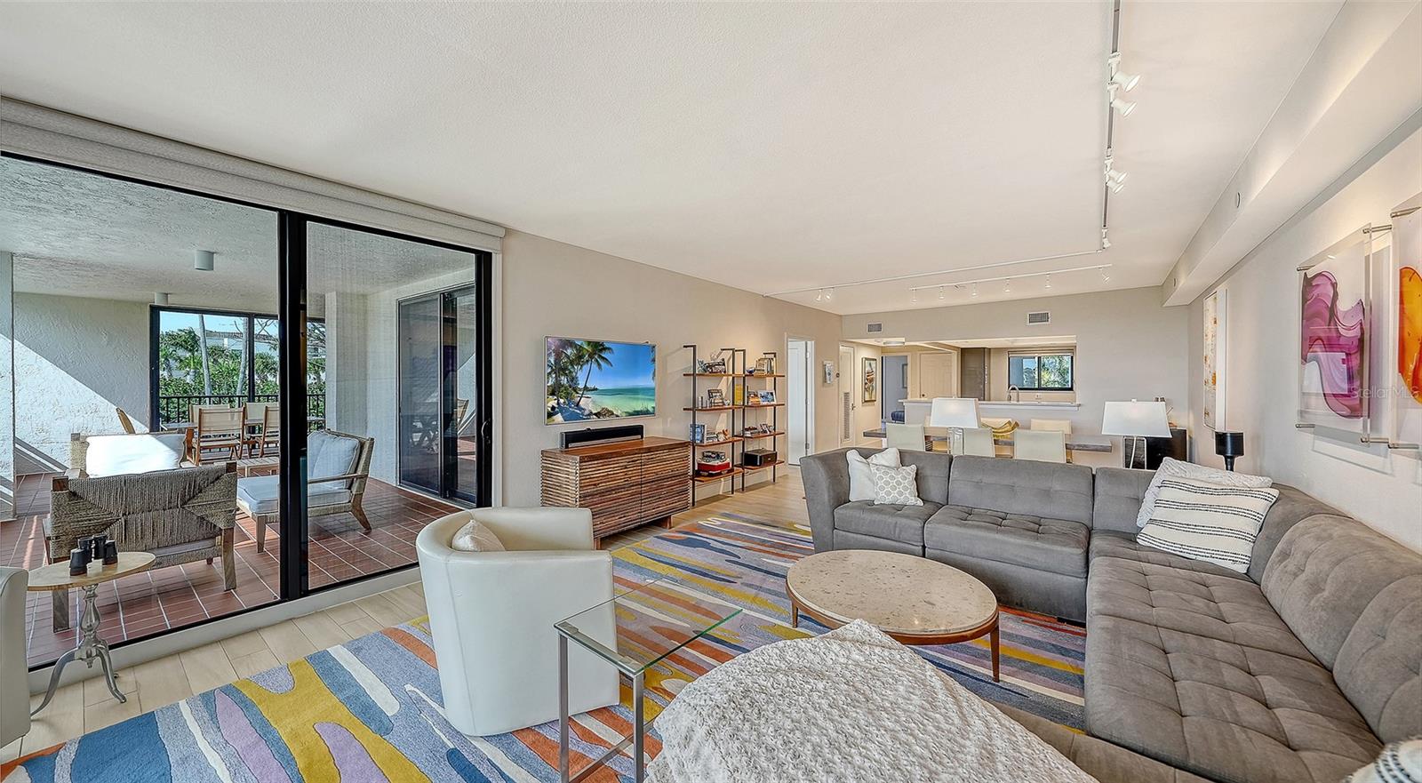 The great room layout with two master suites, each providing water views and private access to the extended terrace. Impact-resistant windows and sliding doors have been installed to comply with the latest building codes. For convenience, the unit includes both an assigned under-building parking space and an enclosed garage, accompanied by an external storage room.