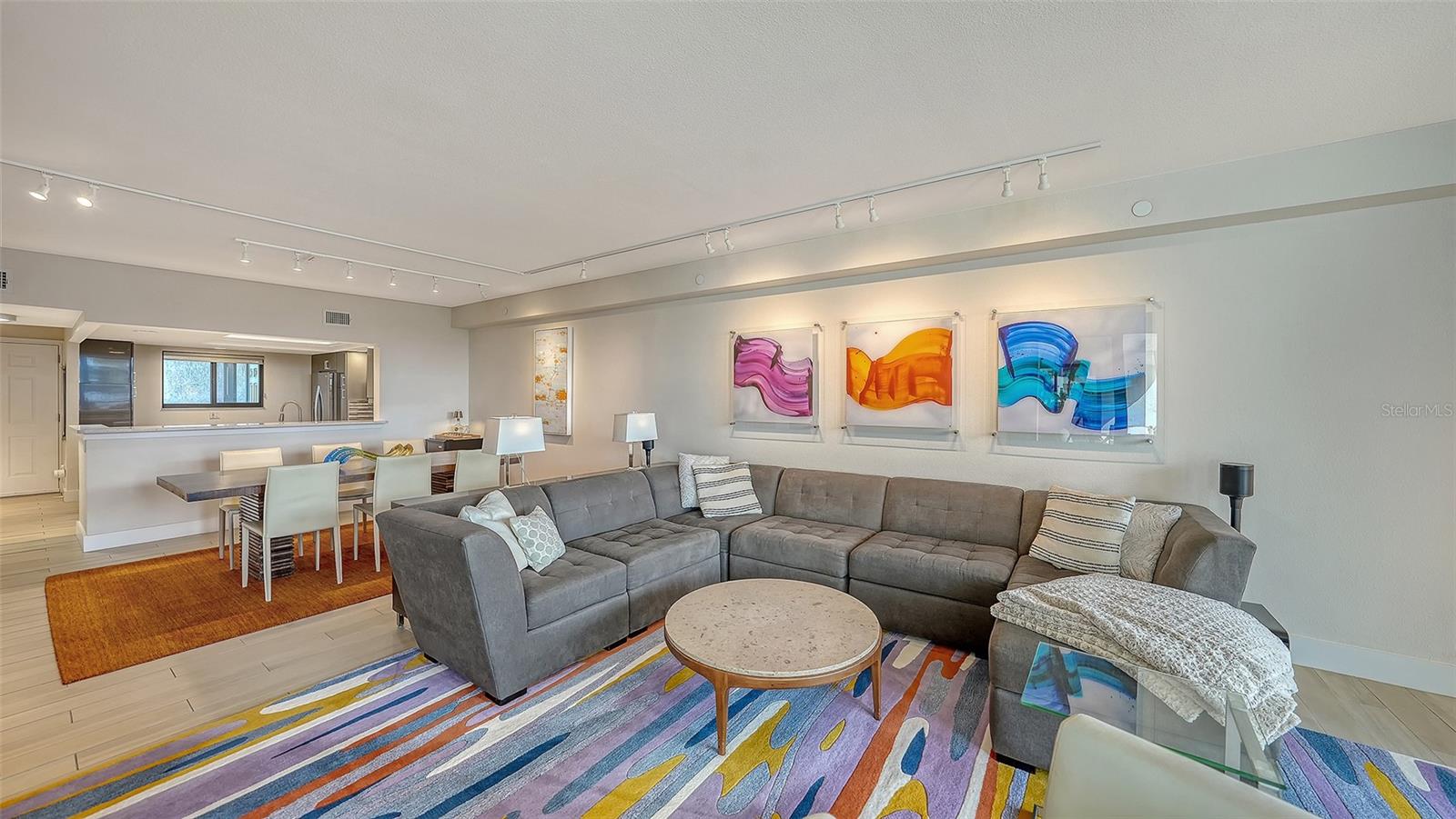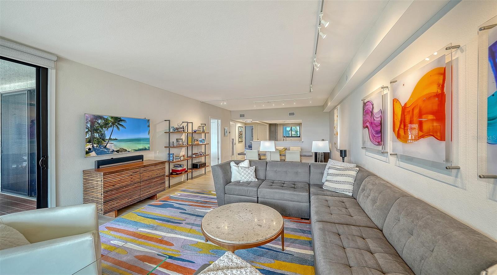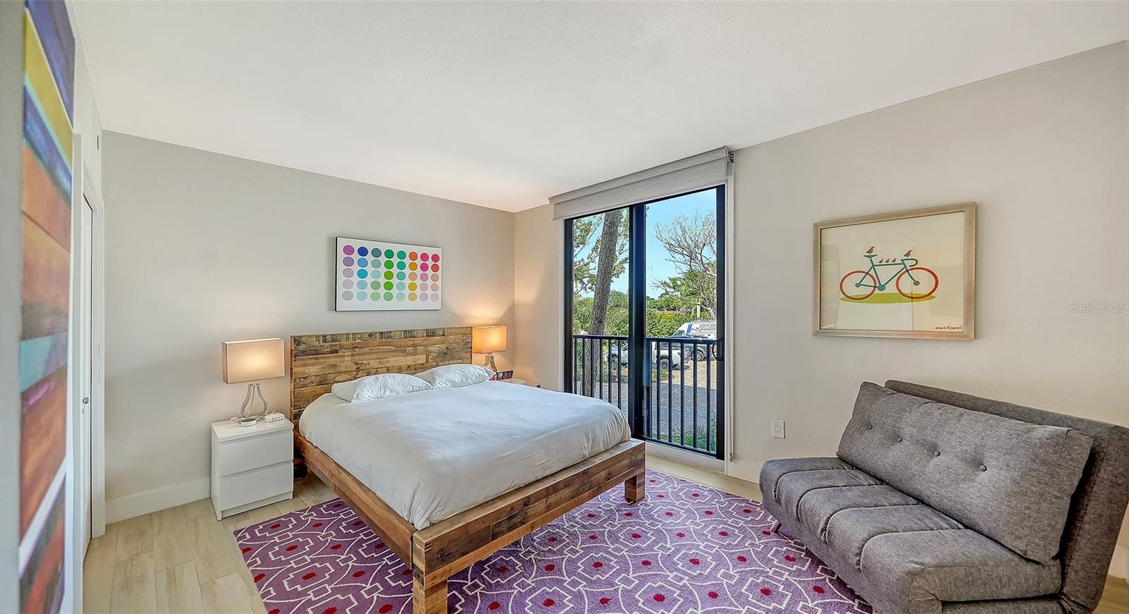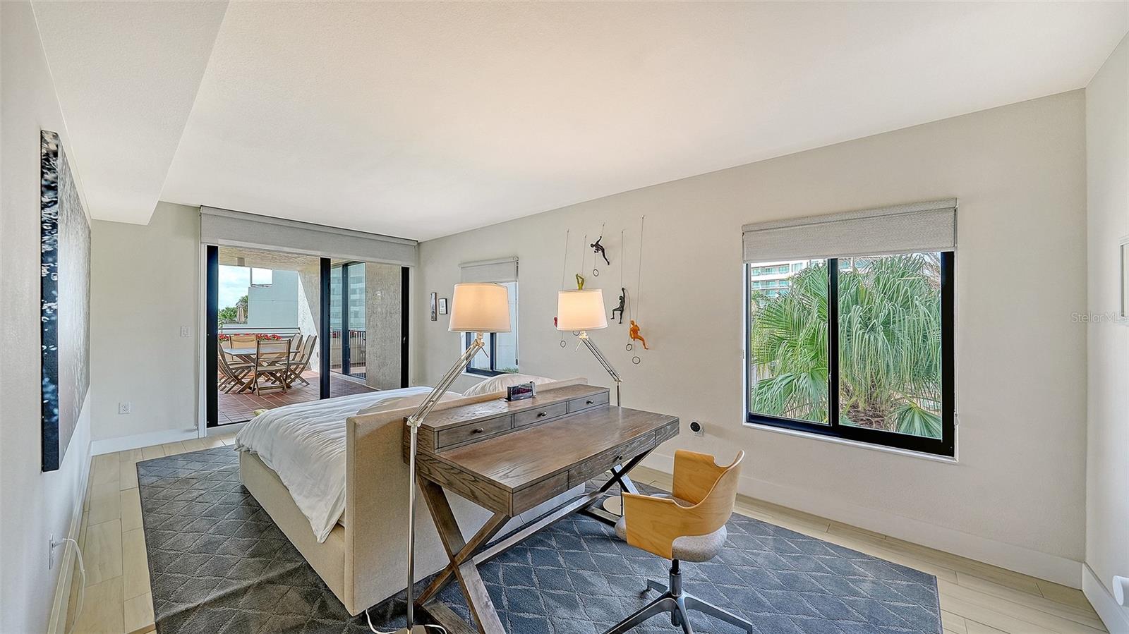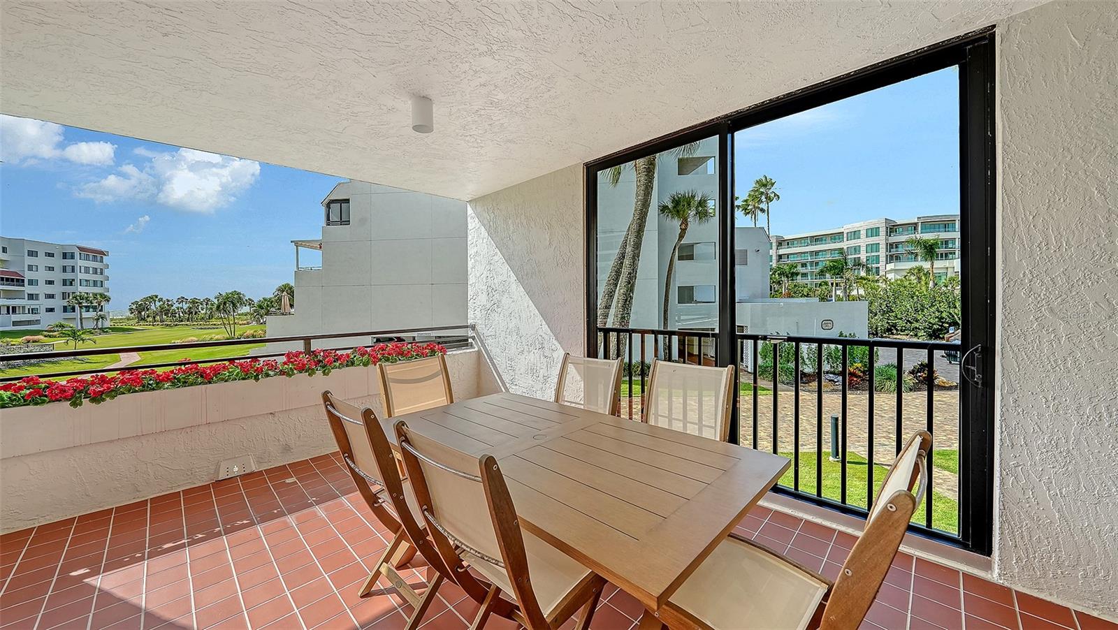 The great room layout with two master suites, each providing water views and private access to the extended terrace. Impact-resistant windows and sliding doors have been installed to comply with the latest building codes. For convenience, the unit includes both an assigned under-building parking space and an enclosed garage, accompanied by an external storage room.