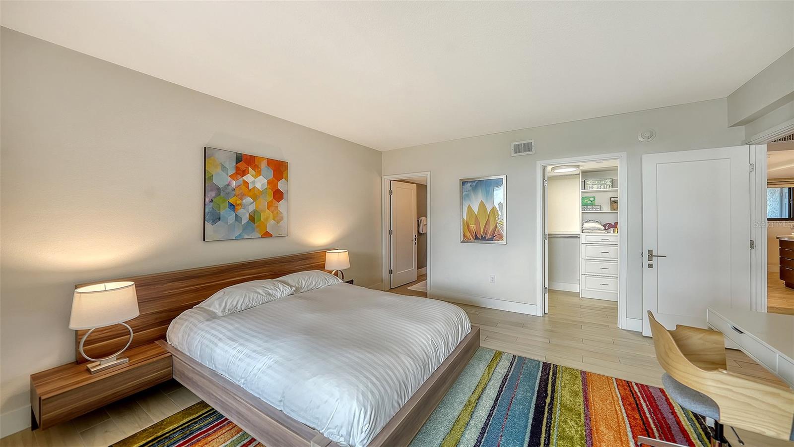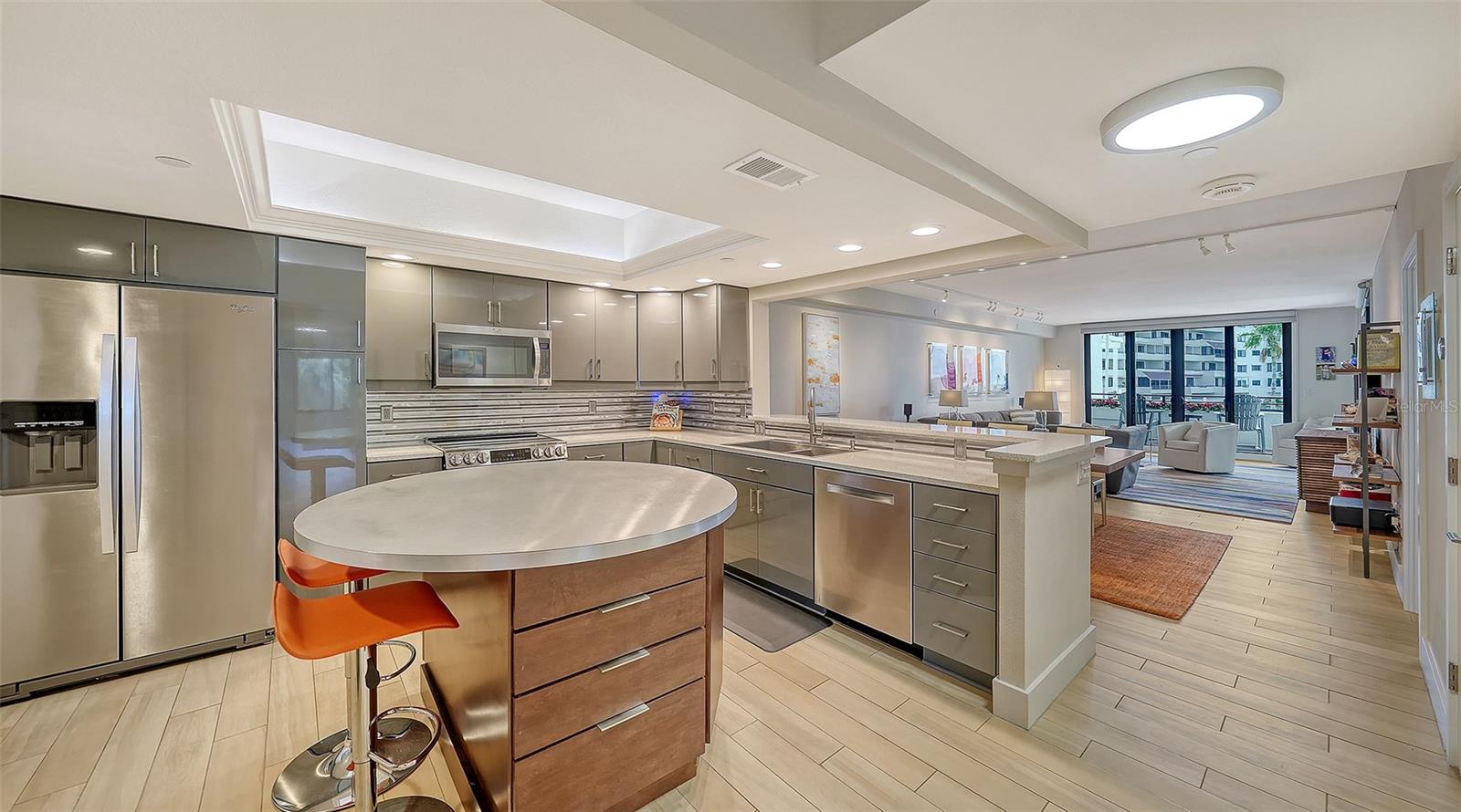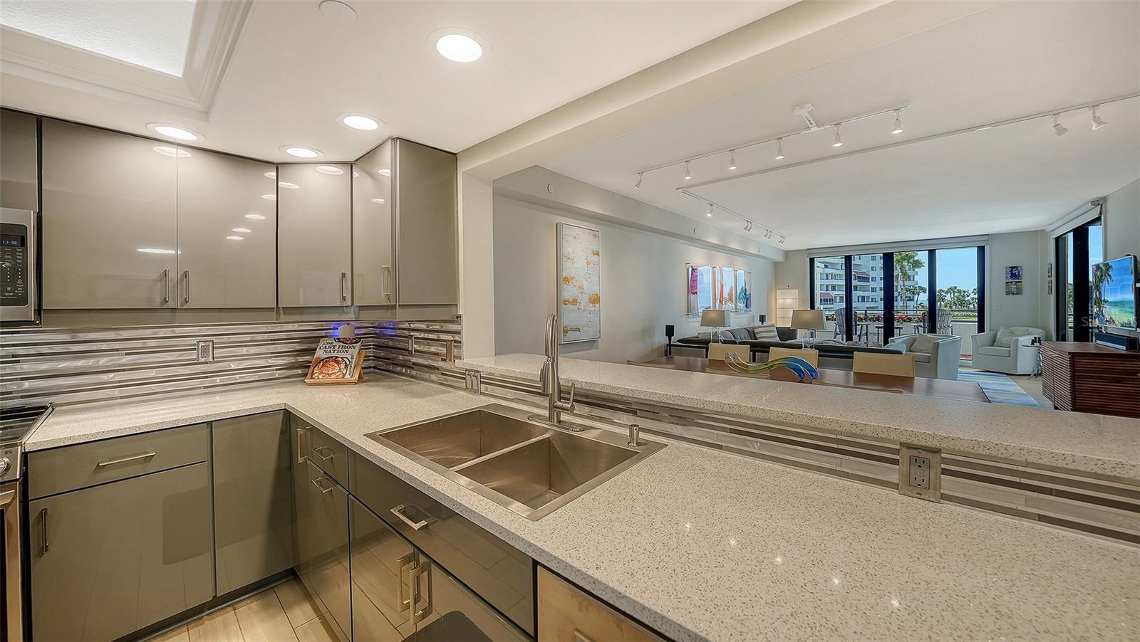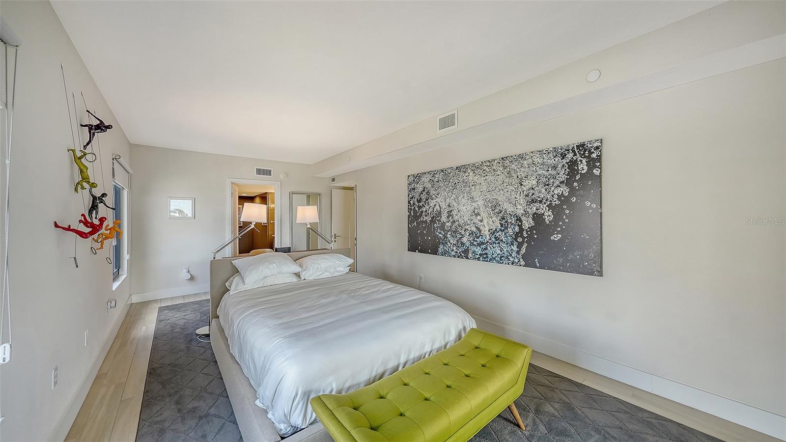 The great room layout with two master suites, each providing water views and private access to the extended terrace. Impact-resistant windows and sliding doors have been installed to comply with the latest building codes. For convenience, the unit includes both an assigned under-building parking space and an enclosed garage, accompanied by an external storage room.