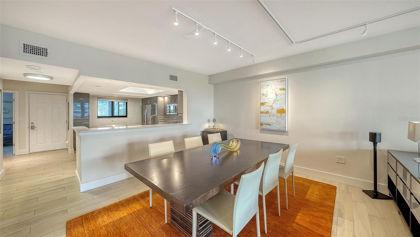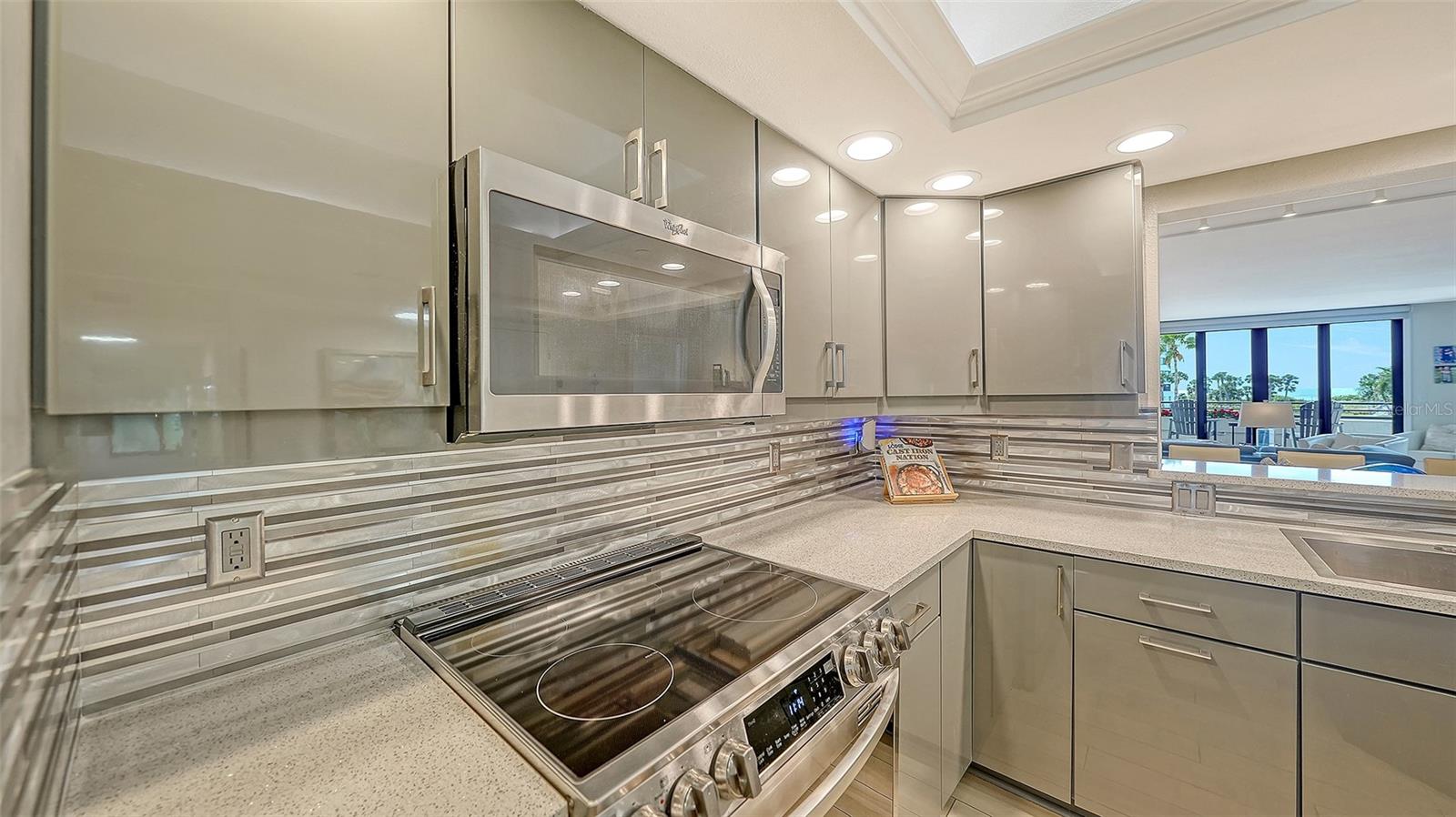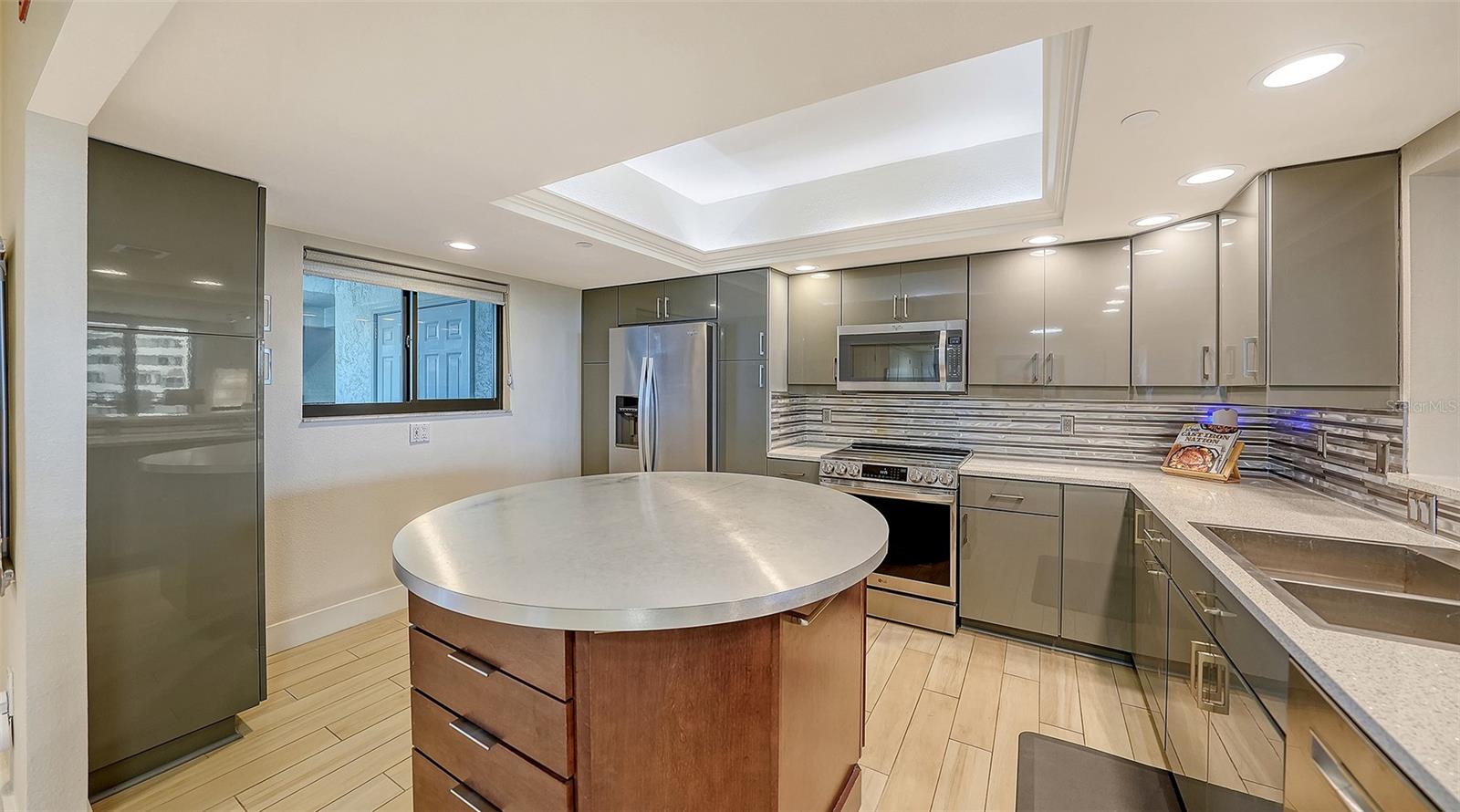 The residence has undergone a comprehensive renovation, featuring a modern kitchen outfitted with custom cabinetry, quartz countertops, a center island adorned with stainless steel and espresso wood base cabinets, as well as a contemporary tile backsplash and high-end appliances. Additional upgrades include new porcelain plank flooring, freshly painted walls, updated baseboards, designer window treatments, and enhanced lighting throughout. All bathrooms have been beautifully updated with new cabinetry, countertops, tile, and premium fixtures.