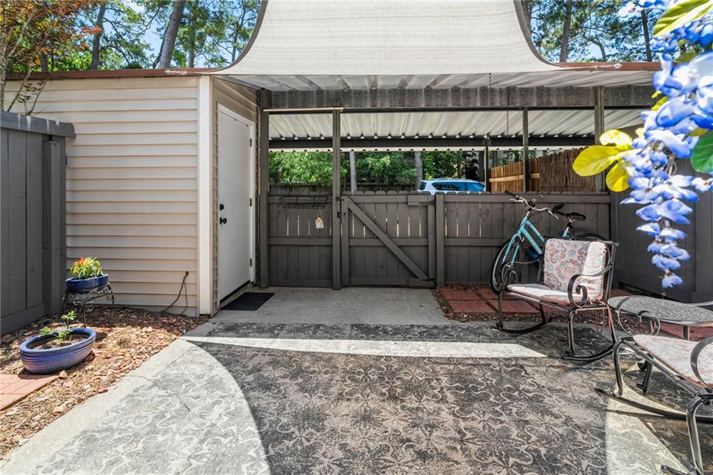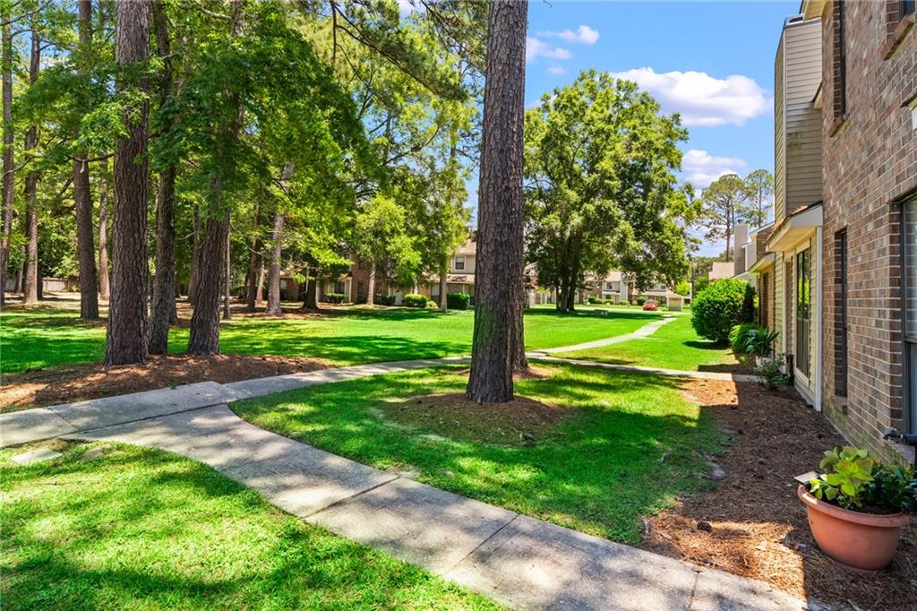 MOVE IN READY! This clean 2 bed/ 2 bath has a 20' ceiling with skylight, gas fireplace, popcorn ceilings removed, wood blinds, cute cabinets in the foyer, peaceful patio fountain (yes, it can stay!) and a lovely view of the pool and park area. Covered parking for two cars, outdoor storage. A/C condenser is 6 yrs old. Walk-in attic storage and pull-down stair storage too. You'll have DIRECT access to bike the 31-mile Tammany Trace from your back gate as well as access to the pool out your front door. Club house available for your free use. The Manor subdivision in Greenleaves is a gated 60 unit community. Condo fee includes exterior insurance, termite treatment, clubhouse use, lawn care, garbage, pine straw removal (roof), pressure washing and pool maintenance. Flood Zone X. Owner is a licensed real estate agent.