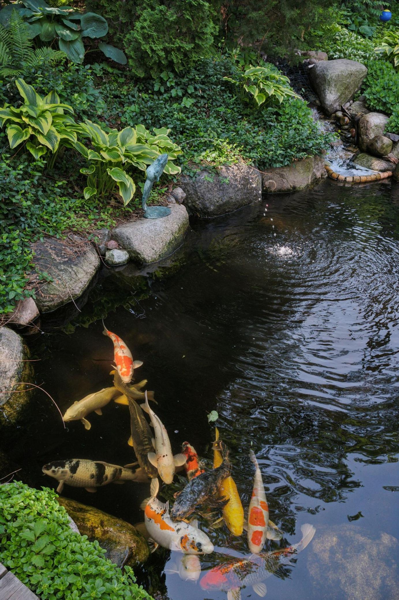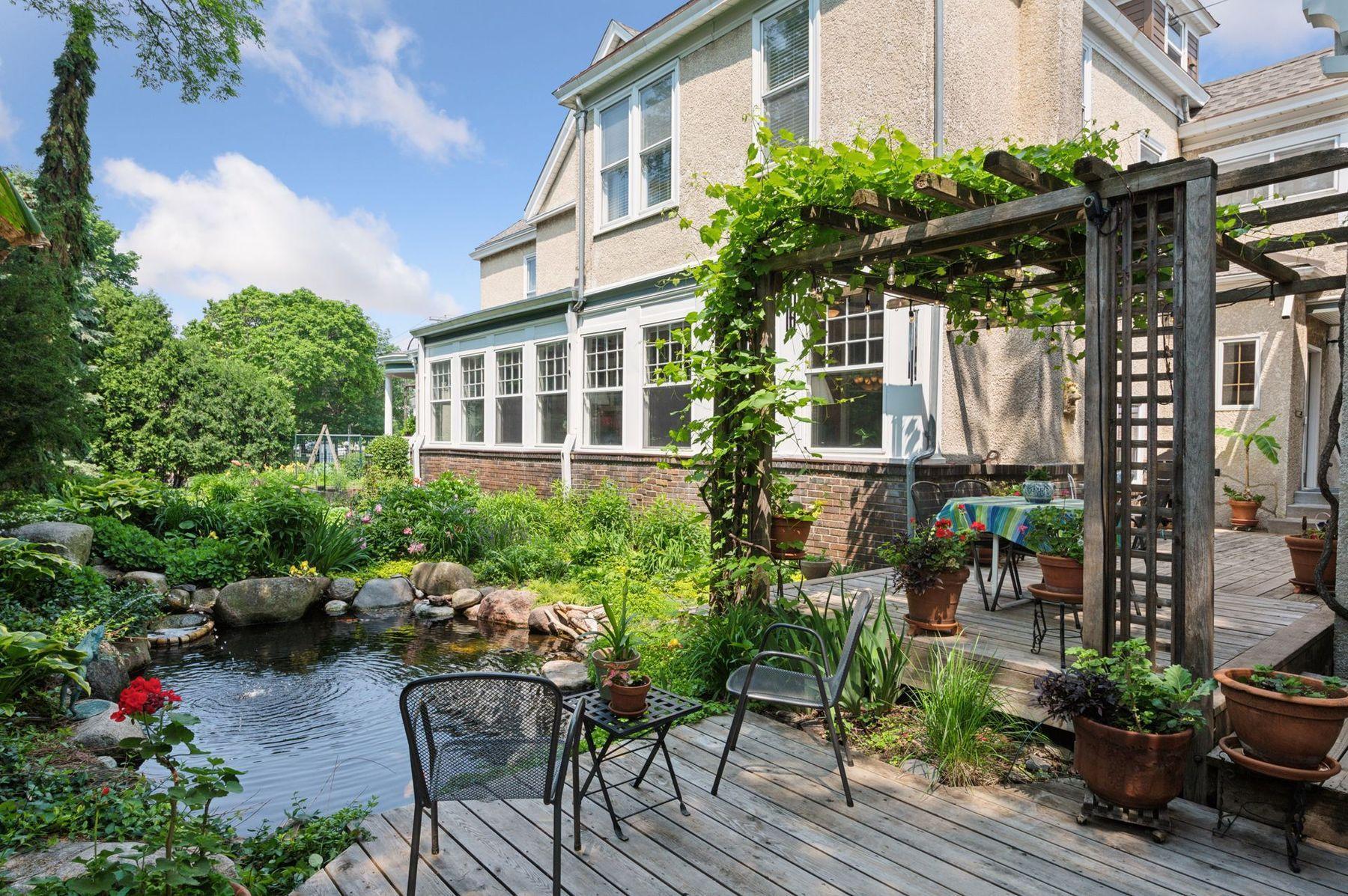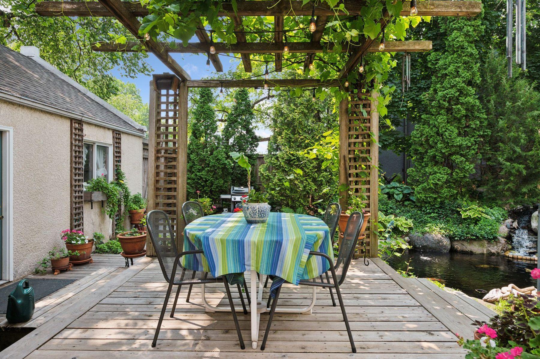 Private Garden: Lush, serene backyard with koi pond.