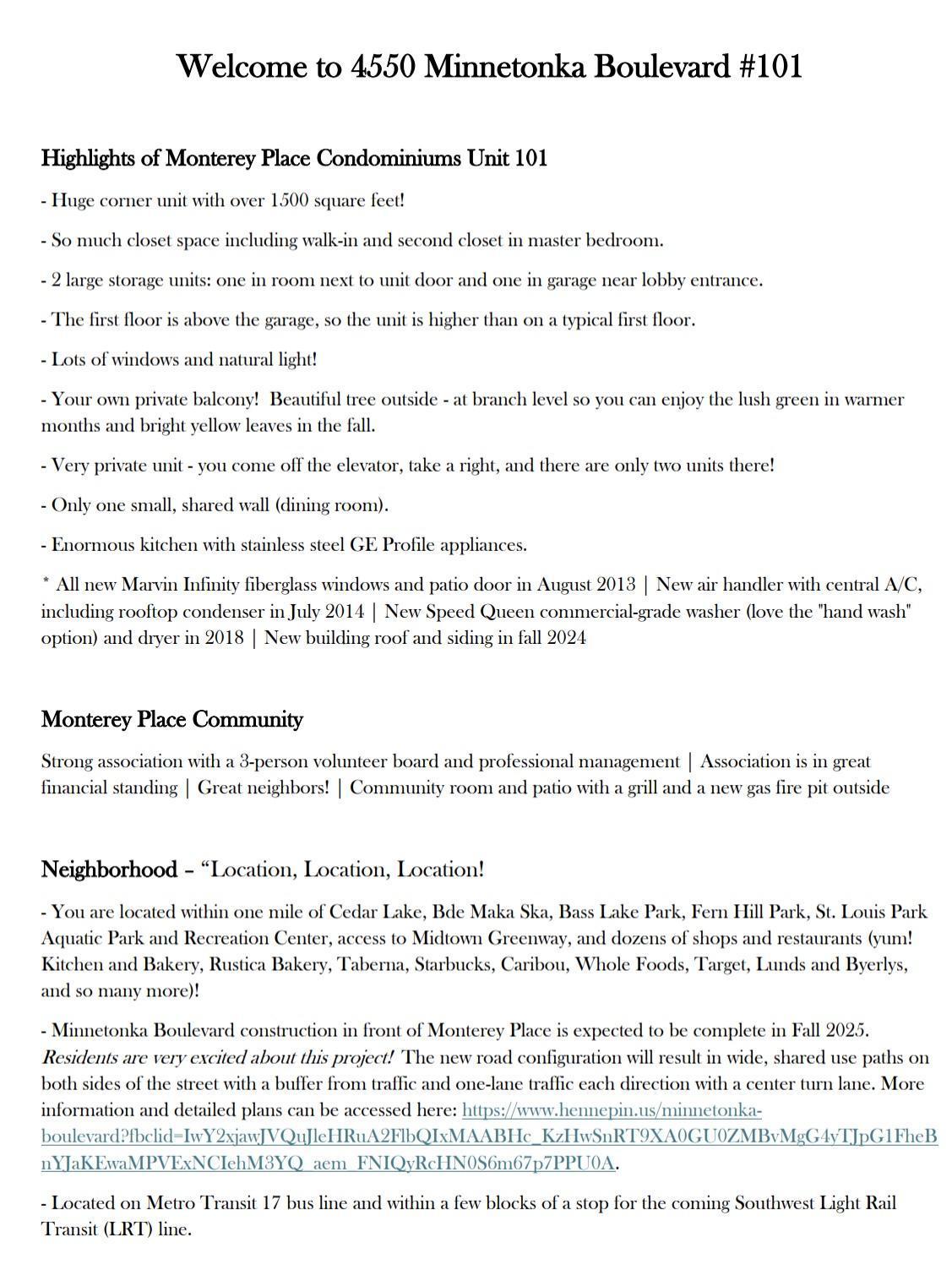 This condo feels like a single-family home – without the outside maintenance. Bright corner unit facing east & south with views of shade trees that turn a fantastic yellow in the Fall. Originally converted to a condo in 2006, this unit was a model with all the bells & whistles in the upgrades! There is only one small, shared wall - the dining room. Other perks include a huge bay window, knock down ceilings, a private balcony, a sunroom, double parking space, owner’s suite with 2 closets, and 2 extra storage units. Recent building updates include new roof, siding & gutters in 2024, shared patio with grill & a new gas fire pit, & Reznor® heaters in the garage. Seller improvements include Marvin Infinity® fiberglass windows and patio door with ‘invisible screens’, updated air handler and rooftop central A/C unit, & Speed Queen® commercial grade washer & dryer the sellers are sad to be leaving behind. Don’t let the unit number (101) fool you – the ground floor is the heated garage & party room, and the second floor is where this unit is located. This small association of 30 units still has many of the same owners and has had historically low turnover. The renovation happening on Minnetonka Boulevard should be completed this year and will be a huge makeover including a bike lane. Best part – no assessment to the homeowners. Come see this home today – you are going to love it!
