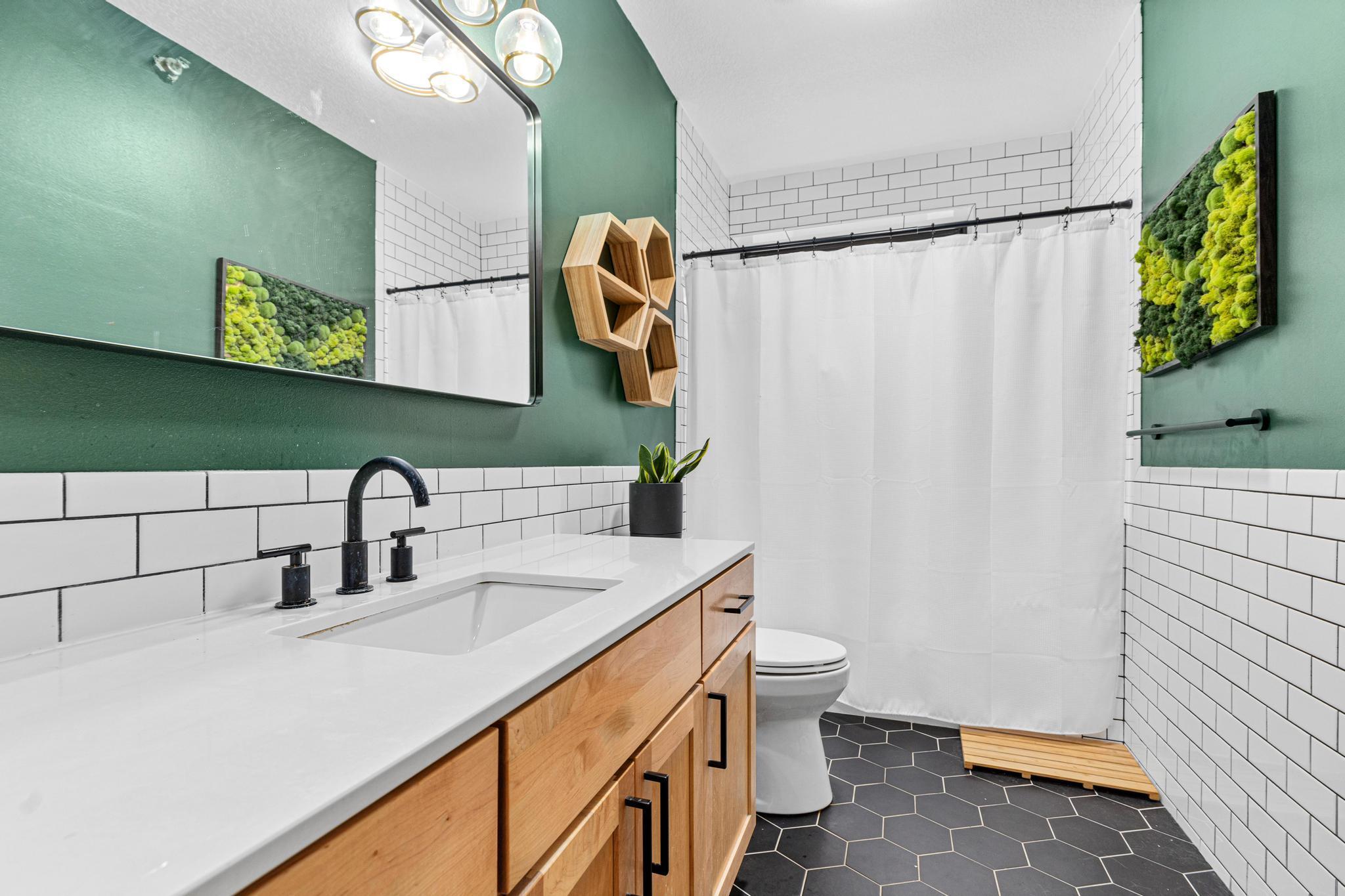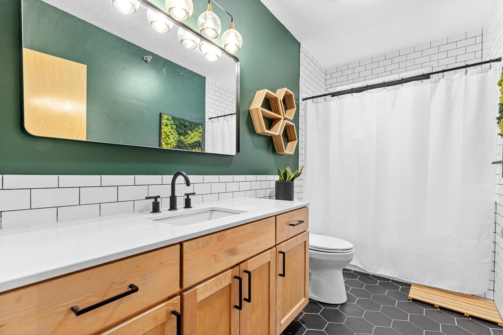 The luxurious primary bathroom was completely remodeled in 2021 with fresh tile, fixtures, lighting, countertops, and a new mirror and toilet. Tempered glass was added to the window for both style and safety.