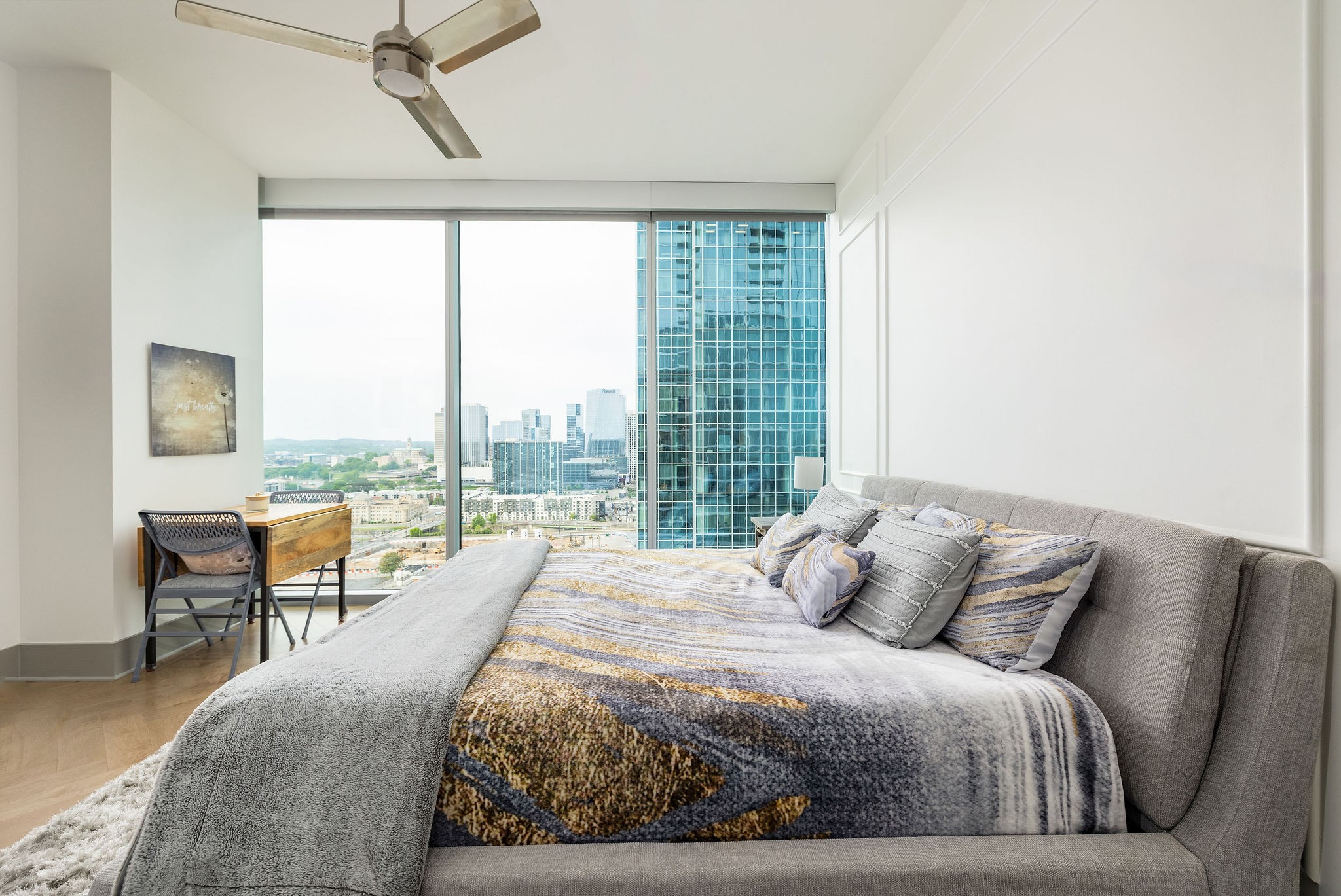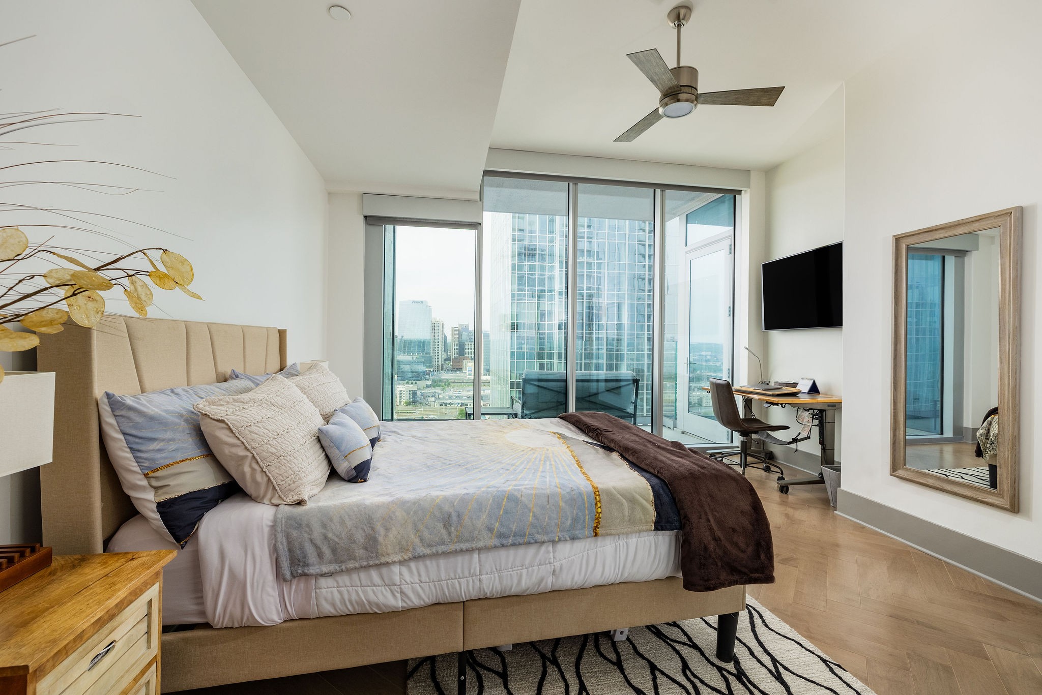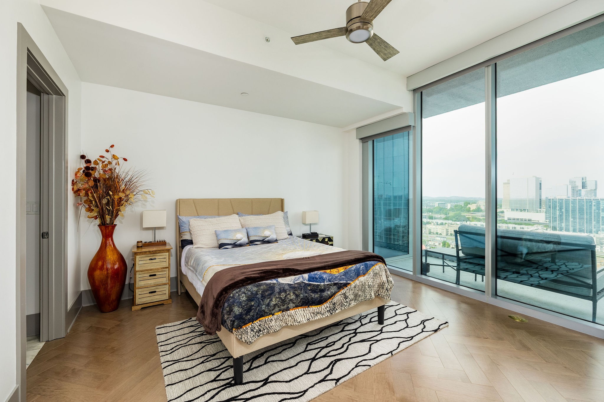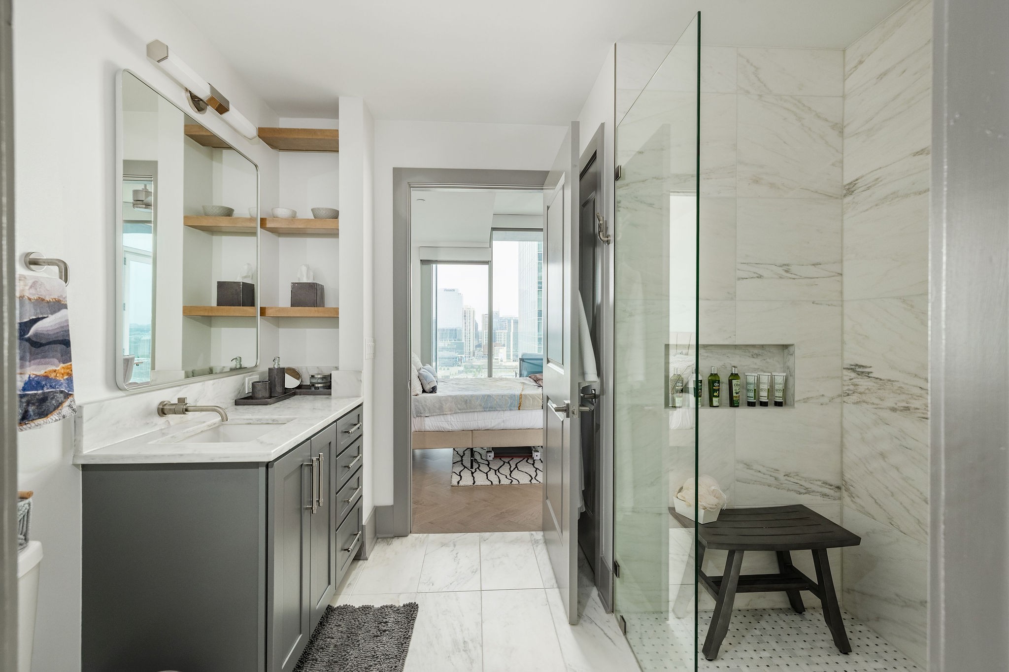 Experience luxury living in this stunning 2-bedroom, 2.5-bath high-rise condo located in the prestigious Broadwest Residences. This sophisticated midtown Nashville home features an open-concept layout designed for entertaining, highlighted by a chef’s kitchen with marble countertops, a waterfall island, and top-of-the-line Wolf and Sub-Zero appliances. The spacious living area includes a custom built-in bar and floor-to-ceiling windows that flood the space with natural light. Step out onto your private balcony to enjoy sweeping views of the Nashville skyline. The primary suite is a serene retreat, showcasing custom lighting, automated shades, a walk-in closet, and a spa-inspired bath with dual marble vanities, double rain head showers, and a luxurious soaking tub. As a resident, enjoy exclusive access to Broadwest’s Five-Star Rooftop Amenities on the 34th floor, including: Rooftop Pool, Billiards Room, Golf Simulator, Library & Meeting Rooms, State-of-the-Art Fitness Center with Sauna, Outdoor Kitchen & Fire Pit, Indoor and Outdoor Fireplaces, Elegant Bar Area