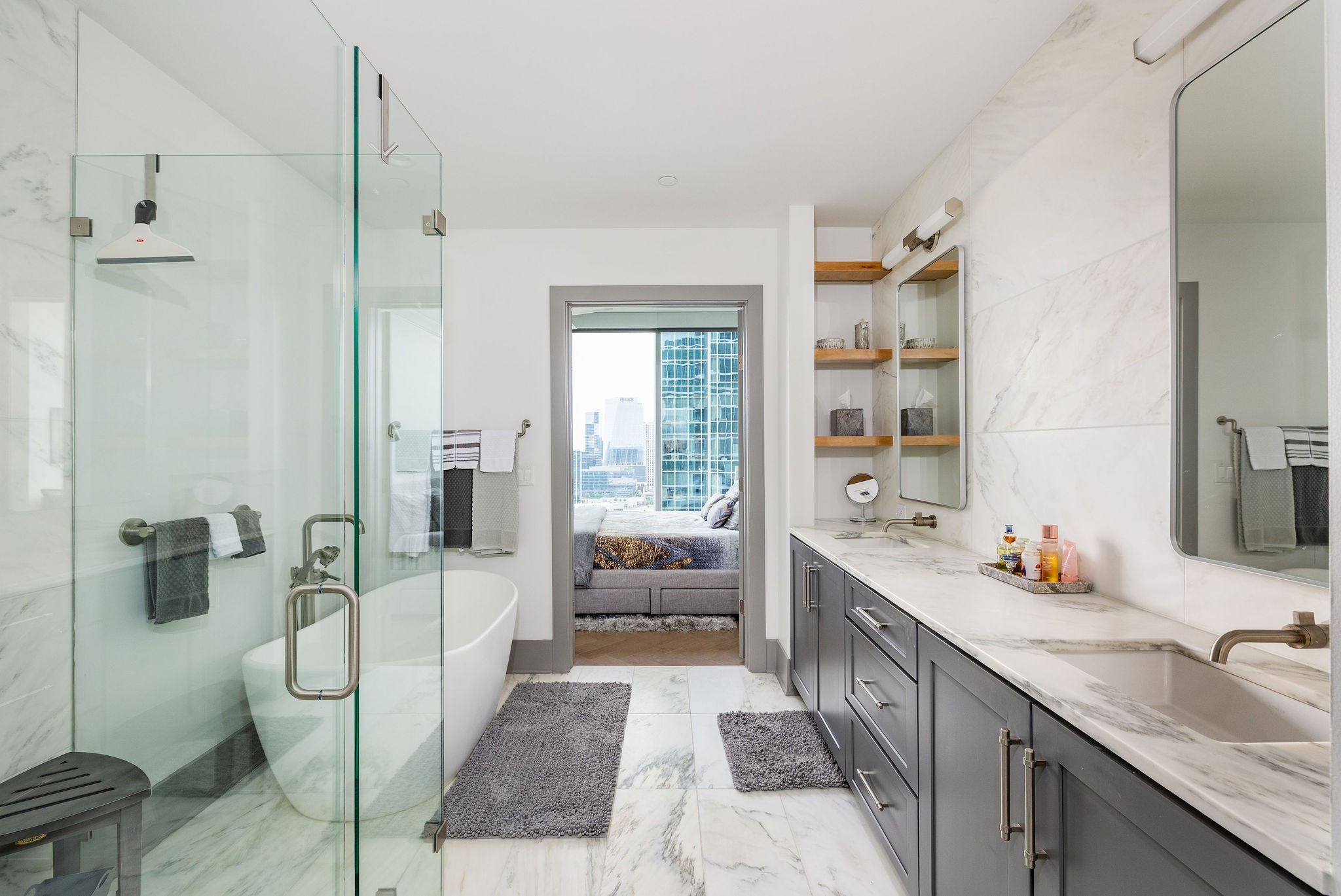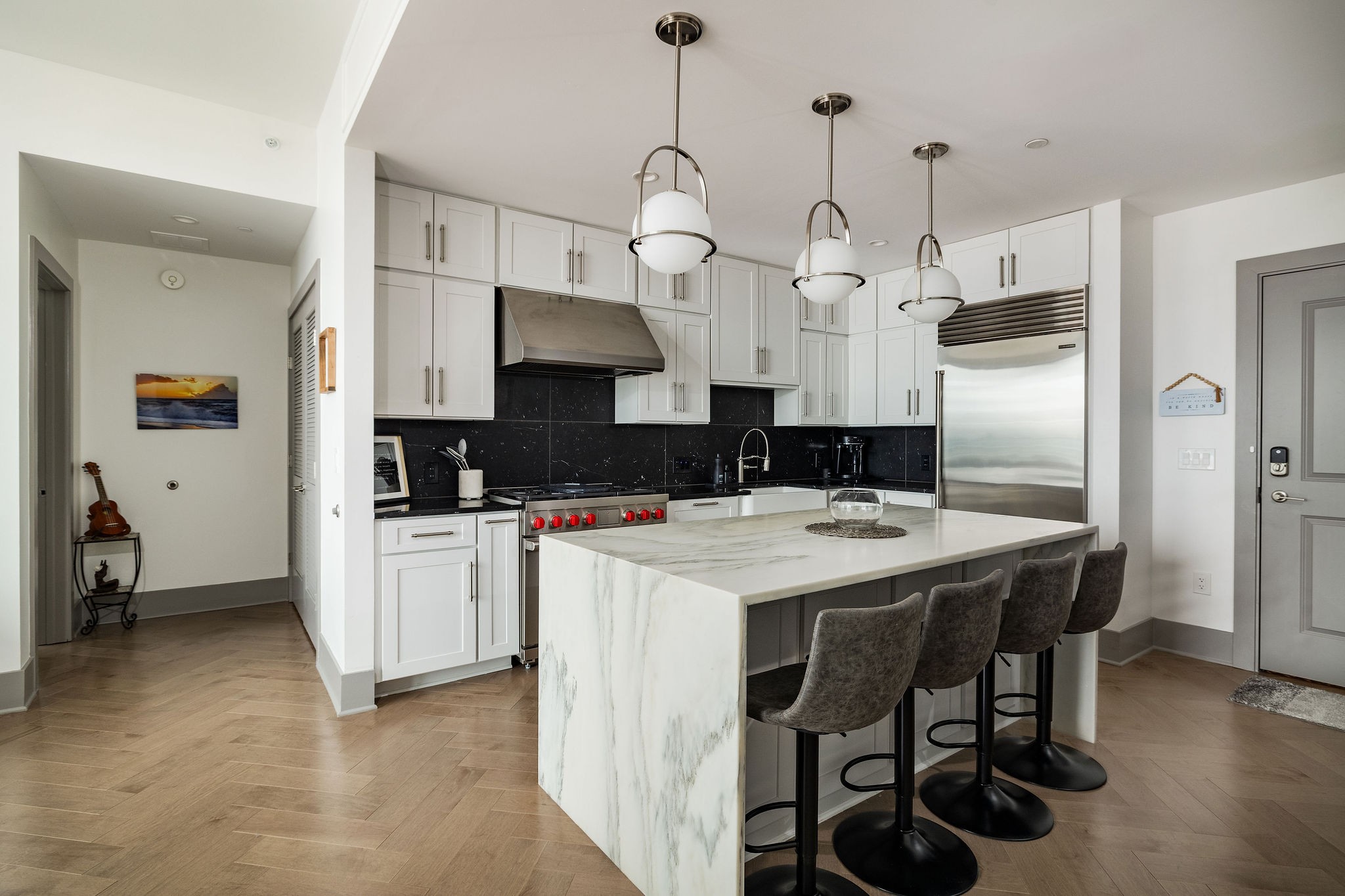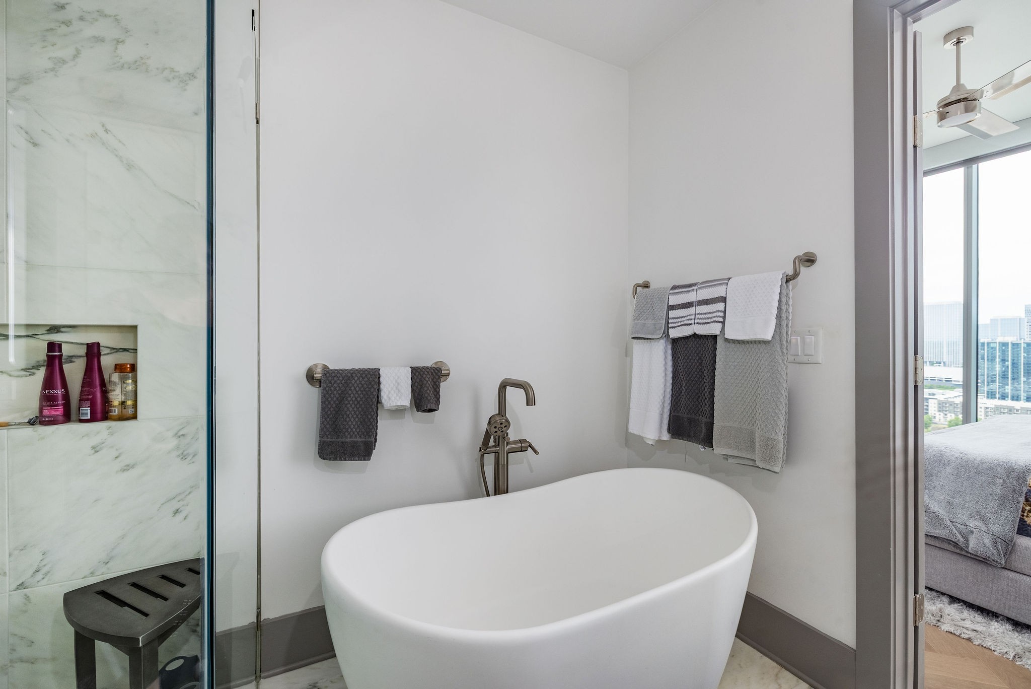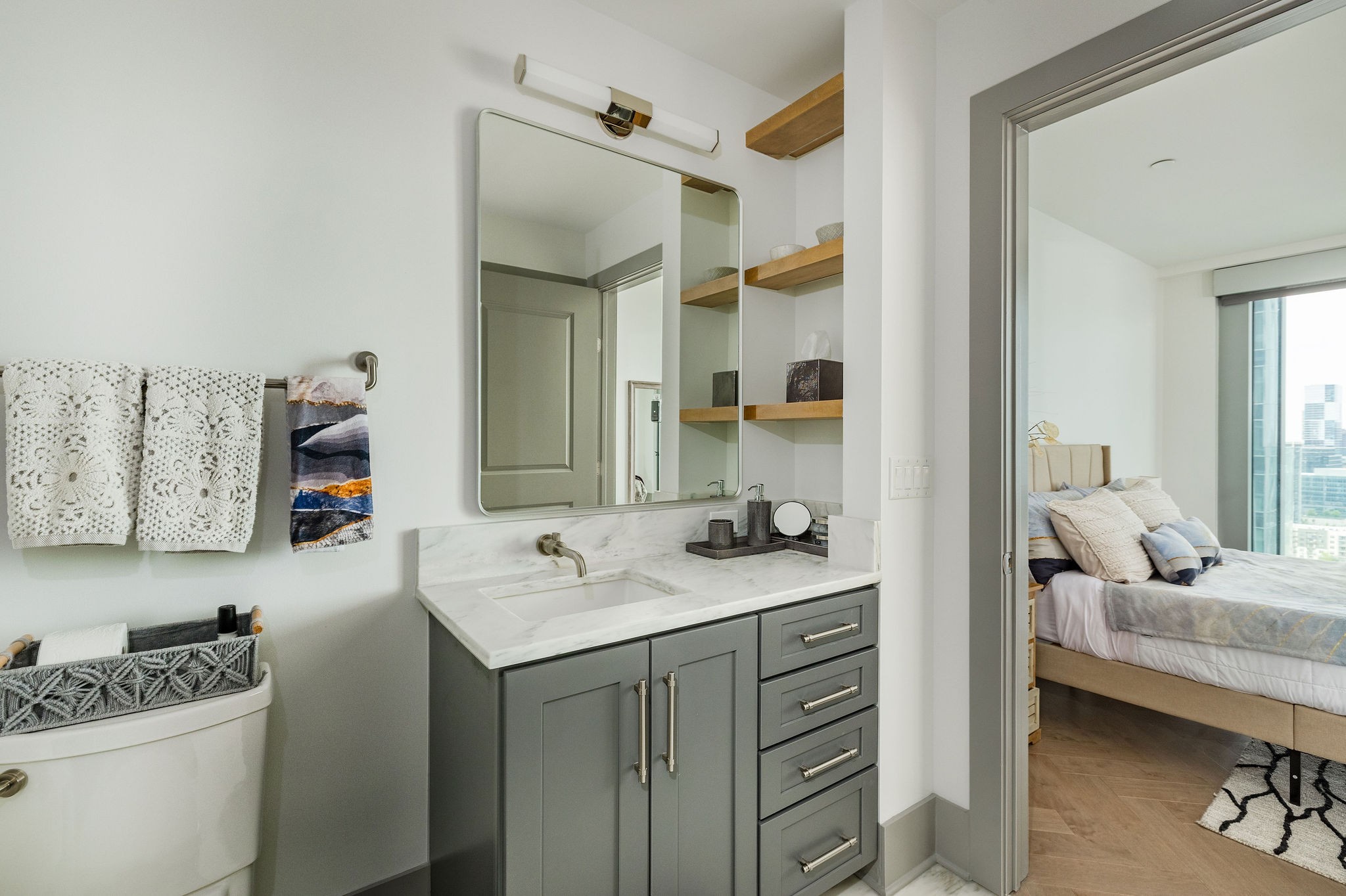 Experience luxury living in this stunning 2-bedroom, 2.5-bath high-rise condo located in the prestigious Broadwest Residences. This sophisticated midtown Nashville home features an open-concept layout designed for entertaining, highlighted by a chef’s kitchen with marble countertops, a waterfall island, and top-of-the-line Wolf and Sub-Zero appliances. The spacious living area includes a custom built-in bar and floor-to-ceiling windows that flood the space with natural light. Step out onto your private balcony to enjoy sweeping views of the Nashville skyline. The primary suite is a serene retreat, showcasing custom lighting, automated shades, a walk-in closet, and a spa-inspired bath with dual marble vanities, double rain head showers, and a luxurious soaking tub. As a resident, enjoy exclusive access to Broadwest’s Five-Star Rooftop Amenities on the 34th floor, including: Rooftop Pool, Billiards Room, Golf Simulator, Library & Meeting Rooms, State-of-the-Art Fitness Center with Sauna, Outdoor Kitchen & Fire Pit, Indoor and Outdoor Fireplaces, Elegant Bar Area