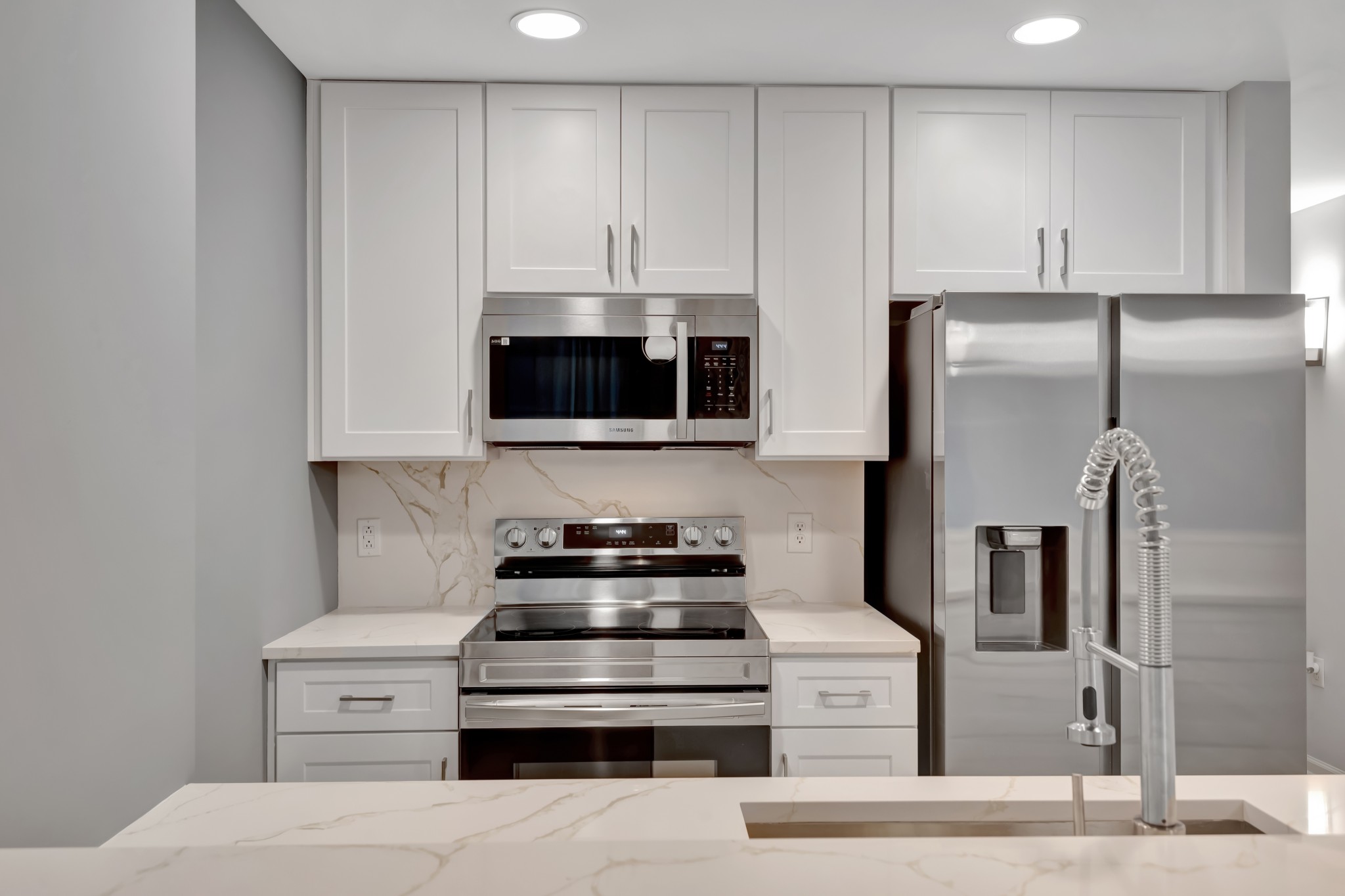 Fully remodeled kitchen with custom cabinetry, quartz countertops with bar seating, elegant backsplash, and premium stainless appliances