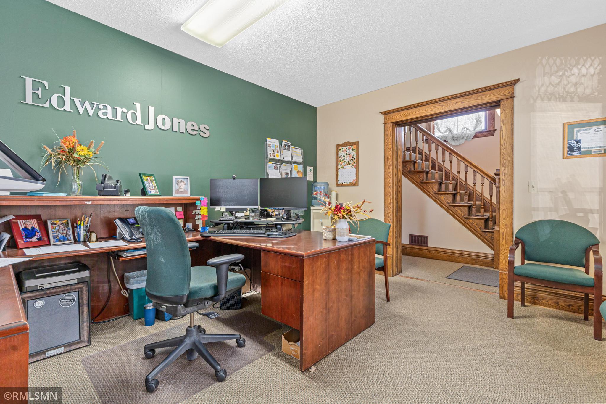 The ground level features a welcoming commercial suite currently occupied by Edward Jones, showcasing original pocket doors, wide trim, and ADA-compliant upgrades including a ramp and restroom. The second level includes one office and a one-bedroom, one-bath apartment, with shared access to the living room and restroom—perfect for continued mixed-use or full office conversion.