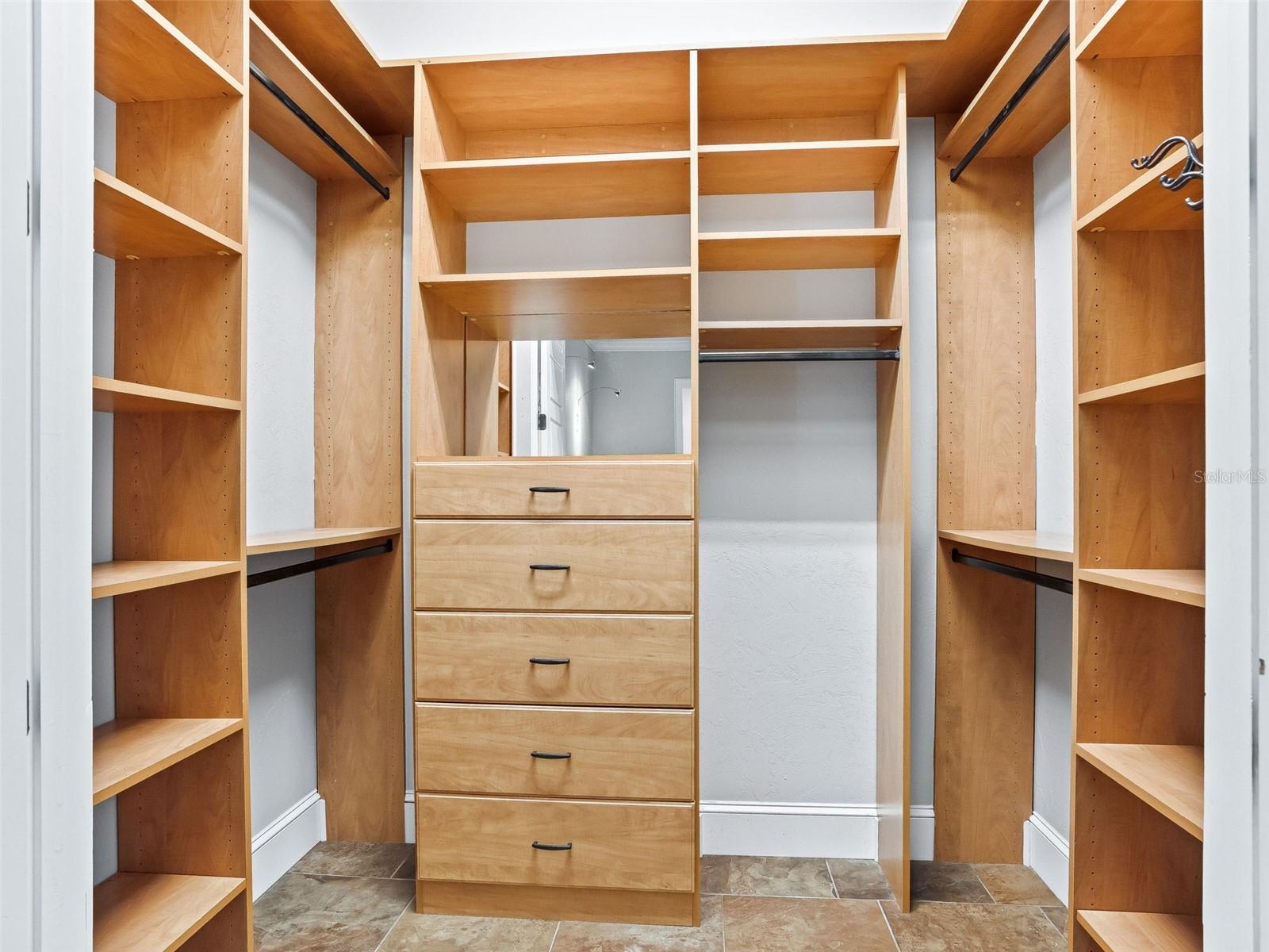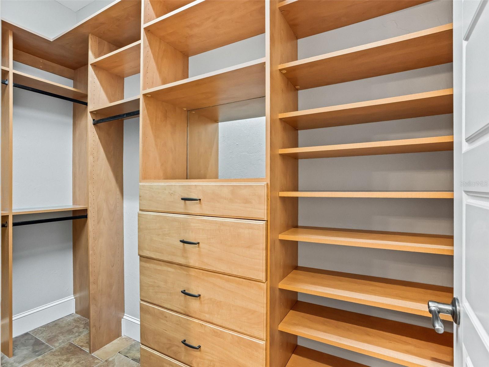 An open-concept kitchen with 42” cherry cabinets, granite counters, deep base drawer storage, large pantry, and a solar tube for natural light. Elegant art lighting throughout for showcasing collections. A laundry room with deep sink, oak cabinetry, and stacked washer/dryer, conveniently located near the half bath and screened rear porch. Enjoy relaxing on the back screened-in porch complete with a 2022 Caldera 7-person spa with waterfall, and an outdoor shower—ideal for Florida living.