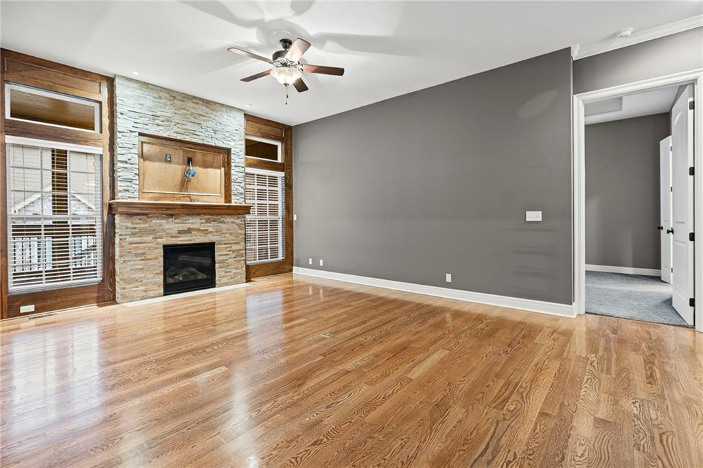 Rich hardwood floors, soaring 10-foot ceilings, and elegant crown molding set an elevated tone the moment you enter. The spacious living area is centered around a dramatic stone fireplace, creating a warm and refined focal point ideal for both intimate evenings and elegant entertaining.