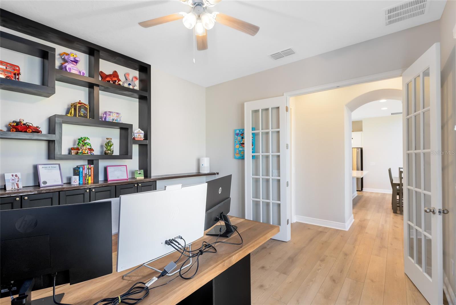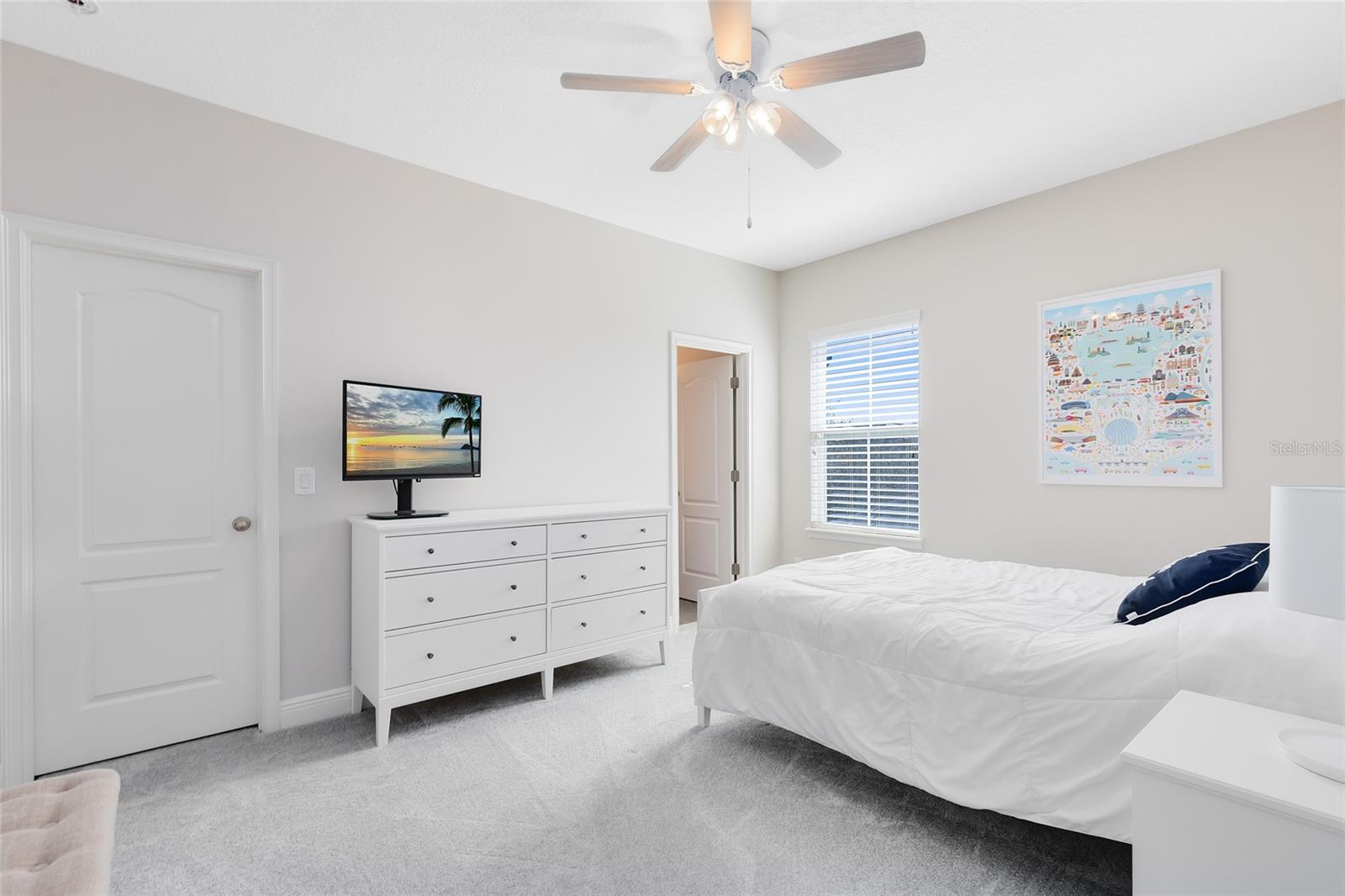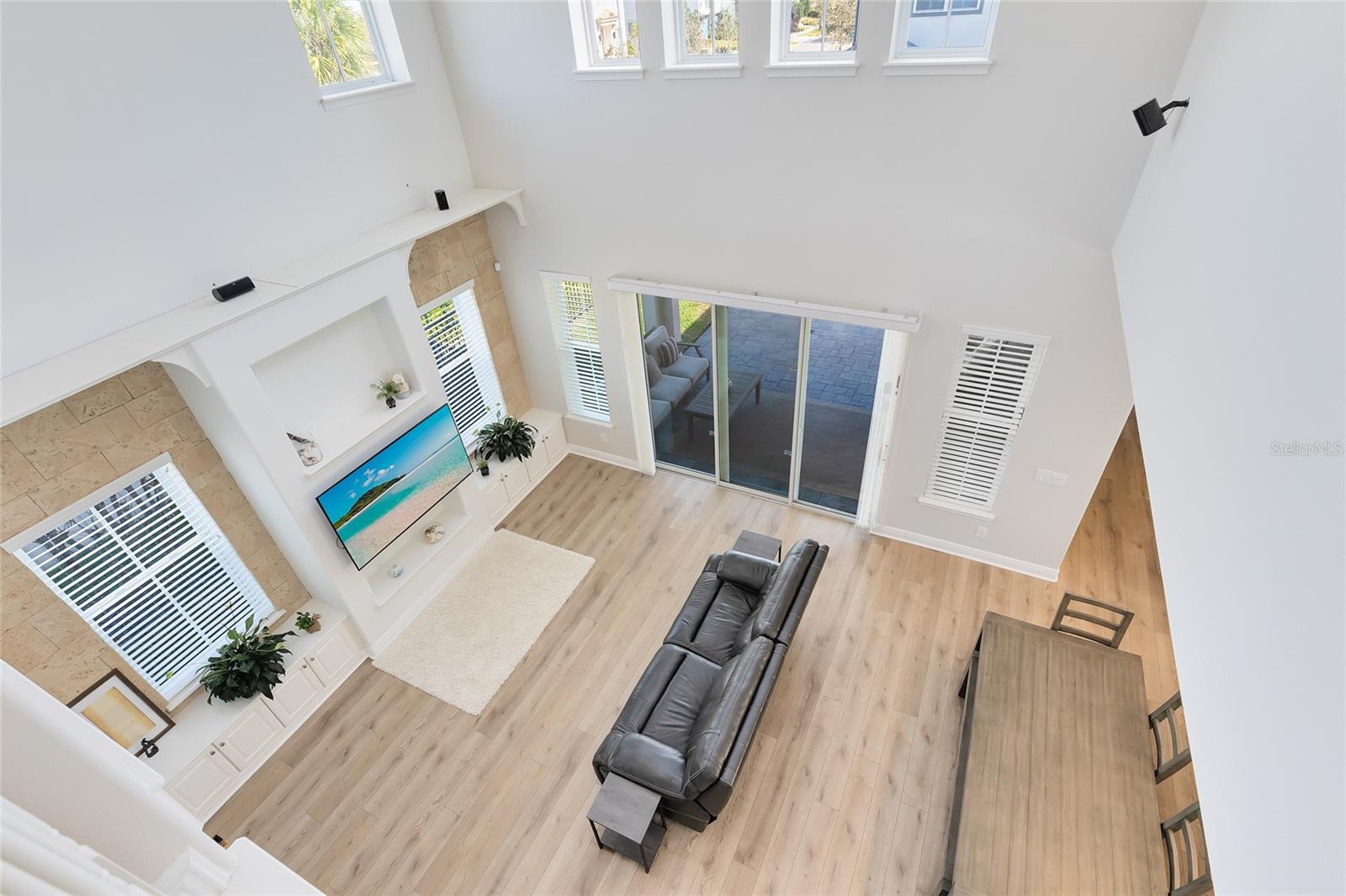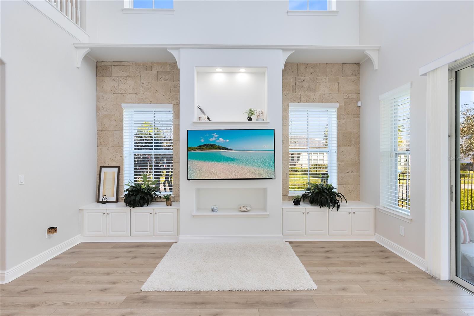 Inside, a fresh, modern palette and white oak-style LVP flooring flow seamlessly throughout the first floor, complementing the open-concept layout and upgraded finishes. The ground-level primary suite enhances accessibility and comfort, while the sun-filled two-story great room impresses with large windows that bathe the space in natural light. The chef’s kitchen showcases pristine quartz countertops, a spacious island, a gourmet wall oven, and designer lighting—ideal for both casual meals and formal entertaining.