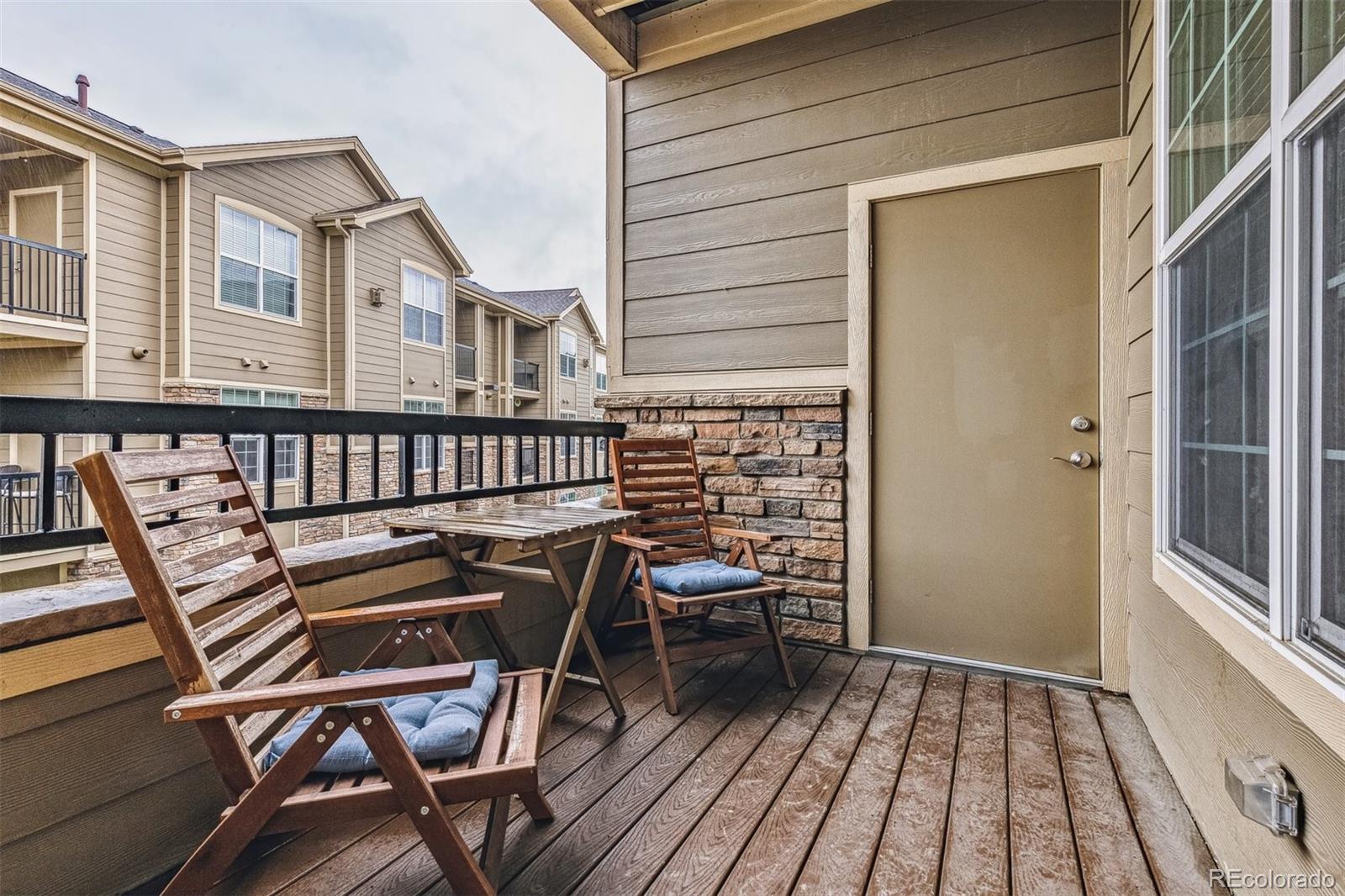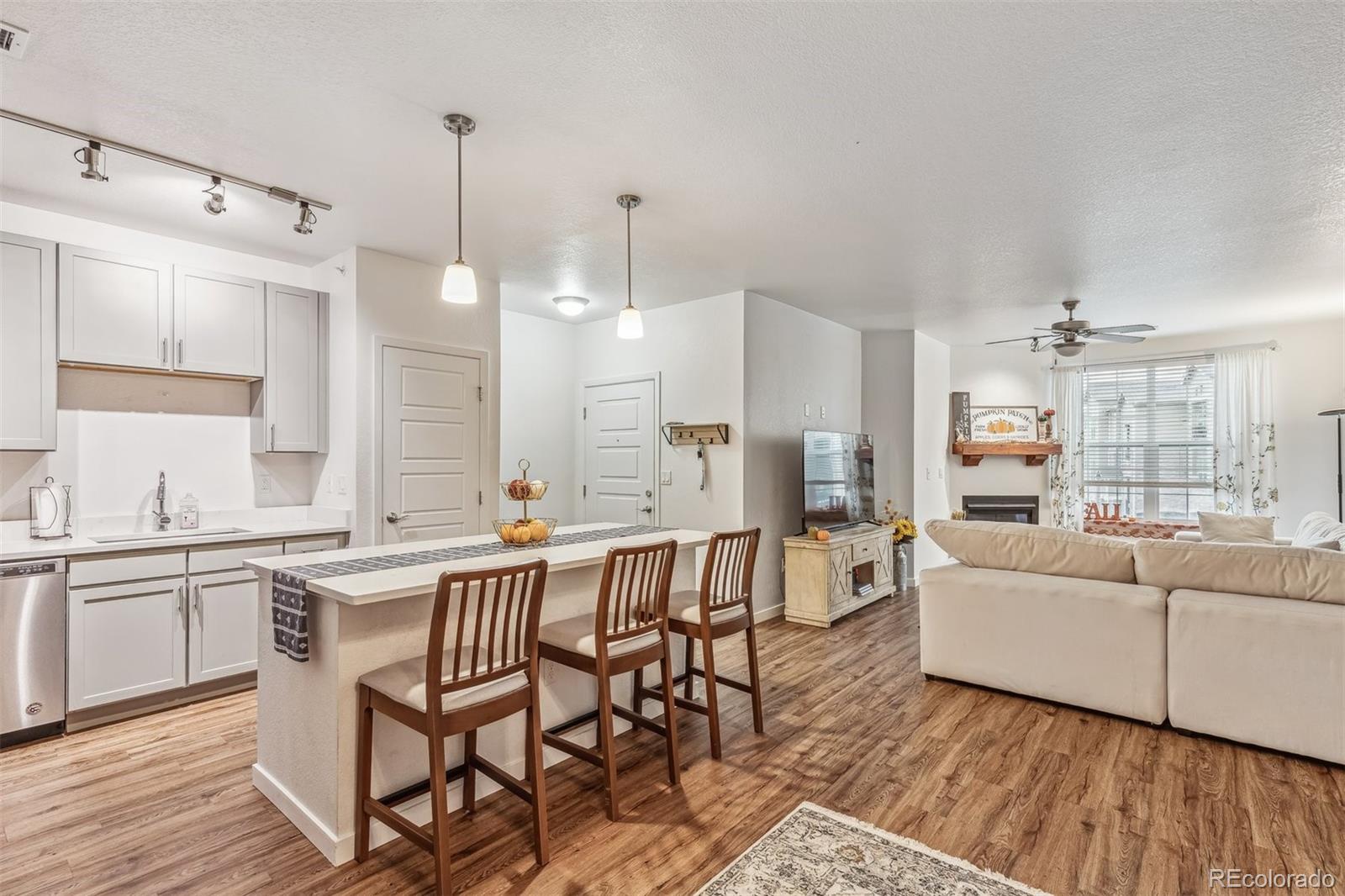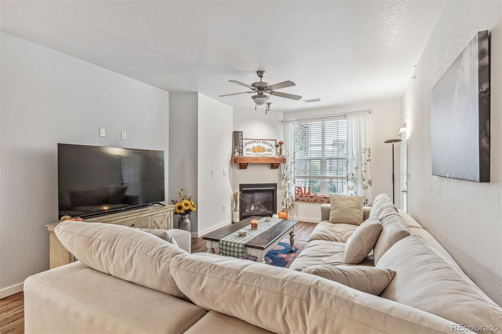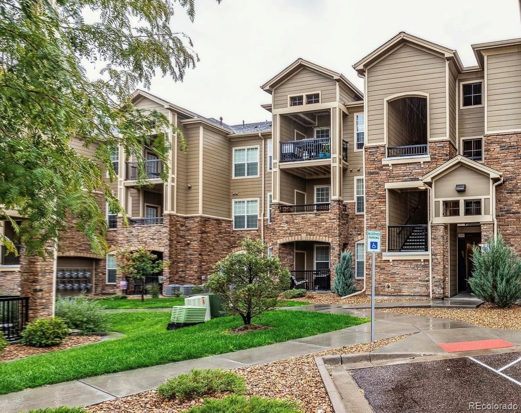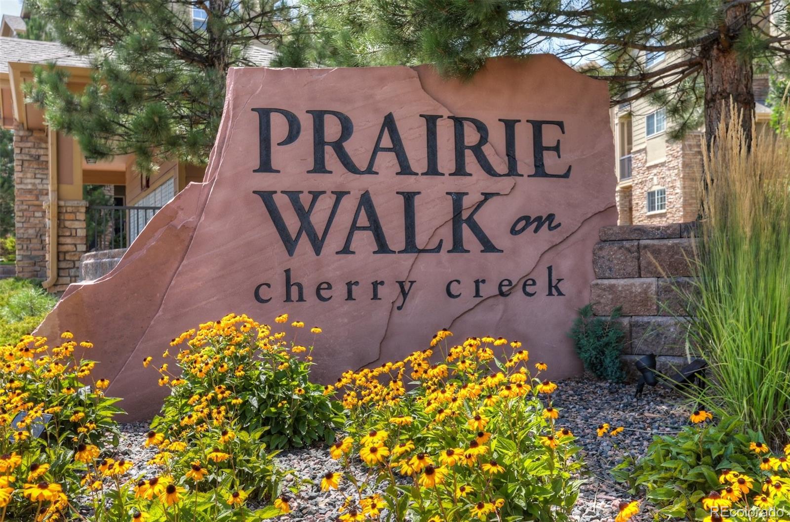 Welcome home to this elegantly appointed second-floor condo which offers beautiful and contemporary craftsmanship along with exceptional amenities-all nestled in a prime Parker location just steps from the Cherry Creek bike path. This home was METICULOUSLY CRAFTED IN 2019 & features an open floor plan with great natural light. The centerpiece of the home, the kitchen, has gorgeous charcoal cabinets, soft white and hazy grey quartz countertops, stainless steel appliances, and fabulous wood-grained luxury plank vinyl. The focal point of the kitchen is a beautiful and expansive kitchen island that includes extra cabinets and a contemporary breakfast bar. The open floor plan seamlessly blends the kitchen, dining, and living spaces, accentuated by the warm and contemporary gas fireplace. Conveniently extend your living space outdoors by stepping onto your covered patio - a peaceful place to enjoy your morning coffee or curl up with a good book in the afternoon. The primary bedroom has an oversized walk-in closet with a significant wow factor, new carpet, and a primary bathroom featuring a double sink vanity with quartz countertop, a spacious walk-in shower with built in bench and an extra linen closet. This home also features a secondary bedroom with brand new carpet and a full guest bathroom with beautiful quartz countertops. Storage is a huge plus with this home with a 1-car detached garage with built-in storage shelves AND an extra patio storage unit. When it is time for a break, the community offers its luxurious pool, soothing hot tub, state-of-the-art fitness center, sand volleyball courts, and a lush park for recreation and relaxation. All of this is situated with quick access to the amazing 40-mile Cherry Creek trail which offers endless opportunity for biking, jogging, or leisurely walks. This home is also strategically positioned close to downtown Parker, DTC, E470, and DIA. Don't miss this amazing opportunity to live with comfort and convenience.