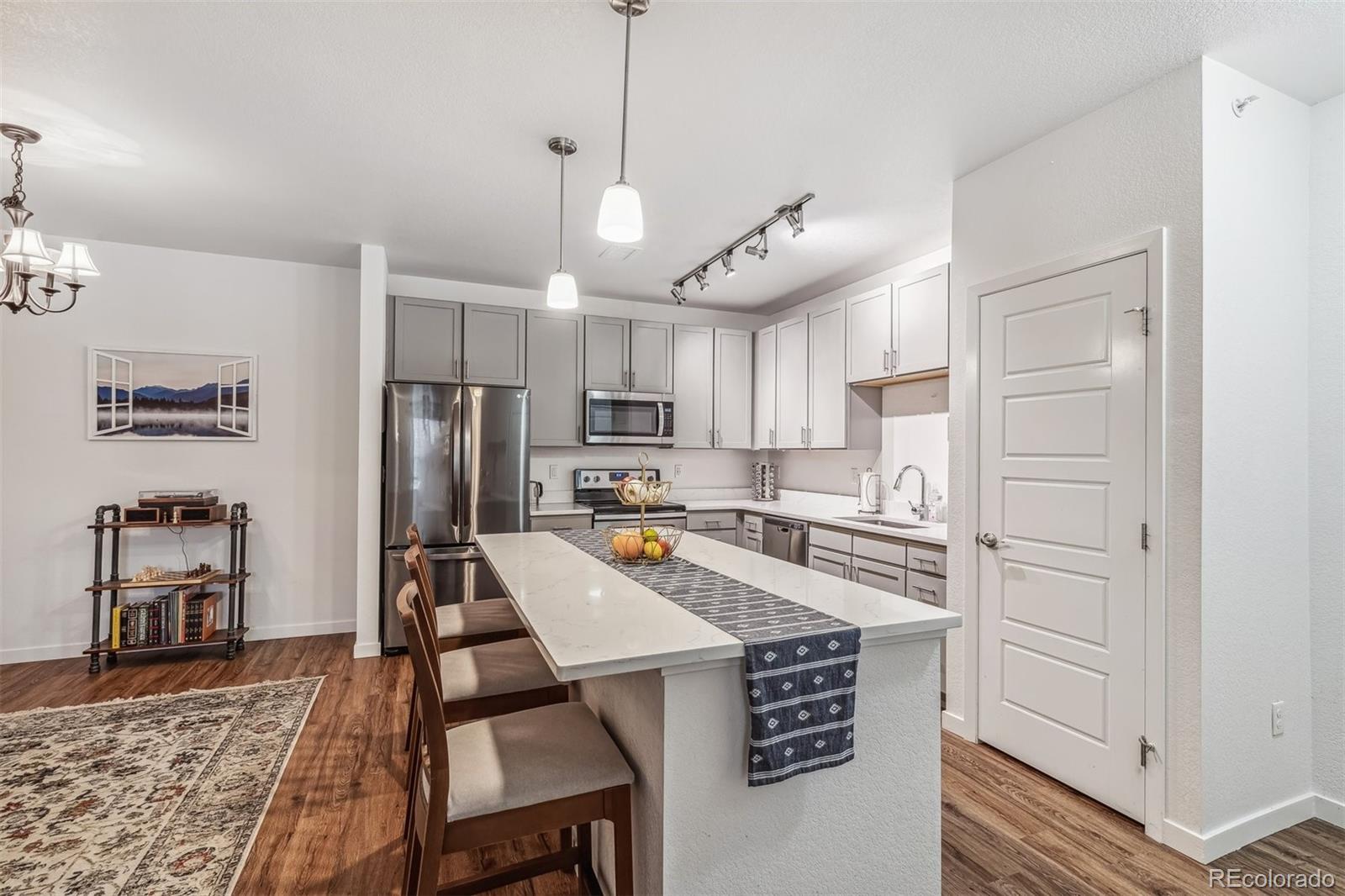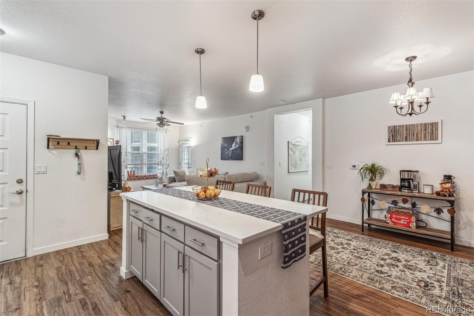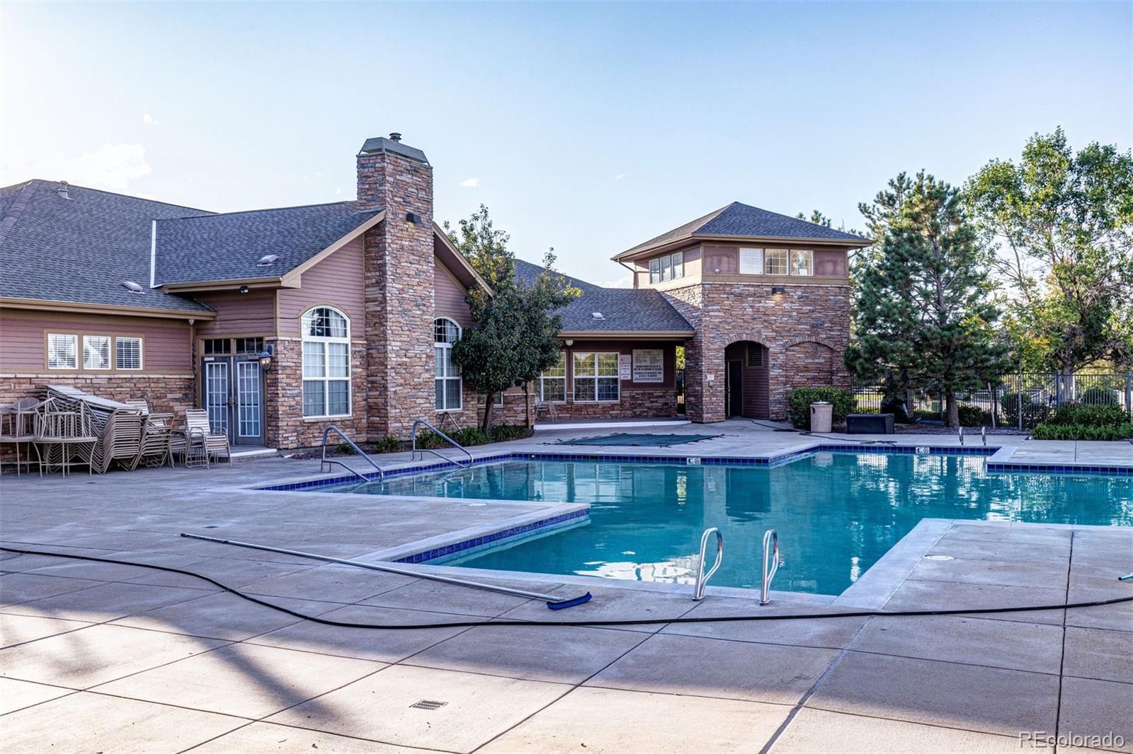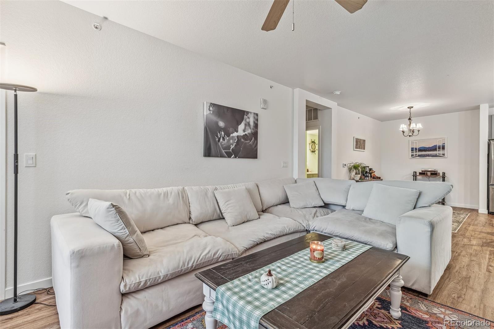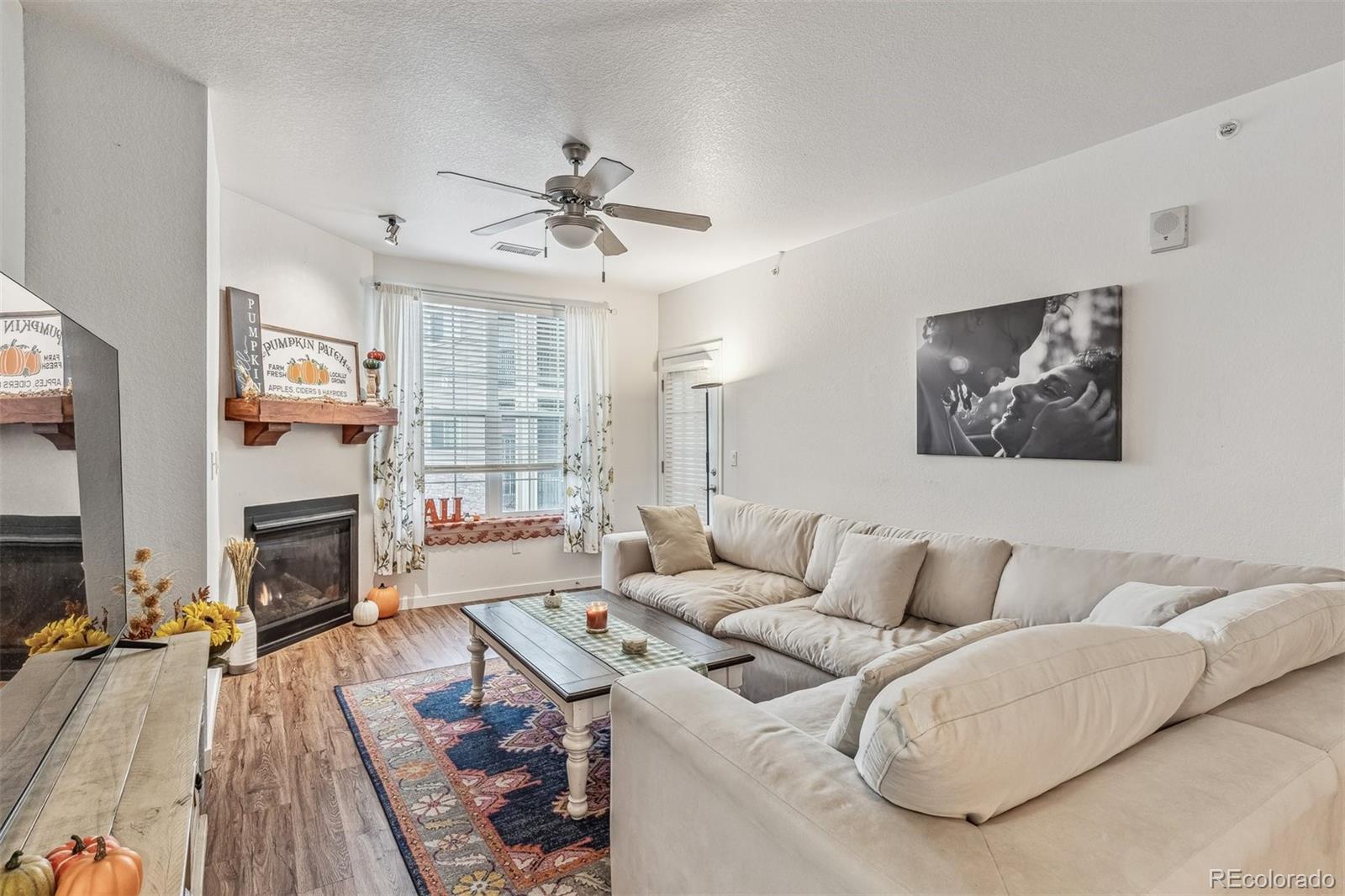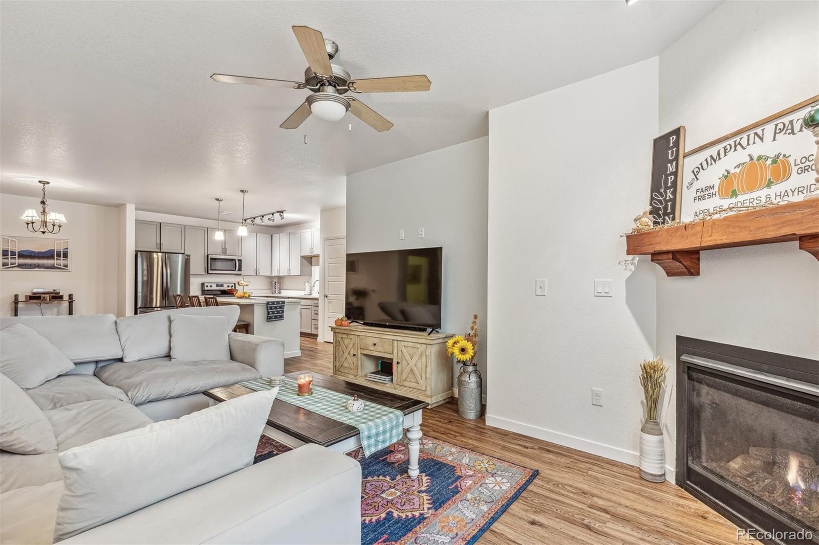 Welcome home to this elegantly appointed second-floor condo which offers beautiful and contemporary craftsmanship along with exceptional amenities-all nestled in a prime Parker location just steps from the Cherry Creek bike path. This home was METICULOUSLY CRAFTED IN 2019 & features an open floor plan with great natural light. The centerpiece of the home, the kitchen, has gorgeous charcoal cabinets, soft white and hazy grey quartz countertops, stainless steel appliances, and fabulous wood-grained luxury plank vinyl. The focal point of the kitchen is a beautiful and expansive kitchen island that includes extra cabinets and a contemporary breakfast bar. The open floor plan seamlessly blends the kitchen, dining, and living spaces, accentuated by the warm and contemporary gas fireplace. Conveniently extend your living space outdoors by stepping onto your covered patio - a peaceful place to enjoy your morning coffee or curl up with a good book in the afternoon. The primary bedroom has an oversized walk-in closet with a significant wow factor, new carpet, and a primary bathroom featuring a double sink vanity with quartz countertop, a spacious walk-in shower with built in bench and an extra linen closet. This home also features a secondary bedroom with brand new carpet and a full guest bathroom with beautiful quartz countertops. Storage is a huge plus with this home with a 1-car detached garage with built-in storage shelves AND an extra patio storage unit. When it is time for a break, the community offers its luxurious pool, soothing hot tub, state-of-the-art fitness center, sand volleyball courts, and a lush park for recreation and relaxation. All of this is situated with quick access to the amazing 40-mile Cherry Creek trail which offers endless opportunity for biking, jogging, or leisurely walks. This home is also strategically positioned close to downtown Parker, DTC, E470, and DIA. Don't miss this amazing opportunity to live with comfort and convenience.