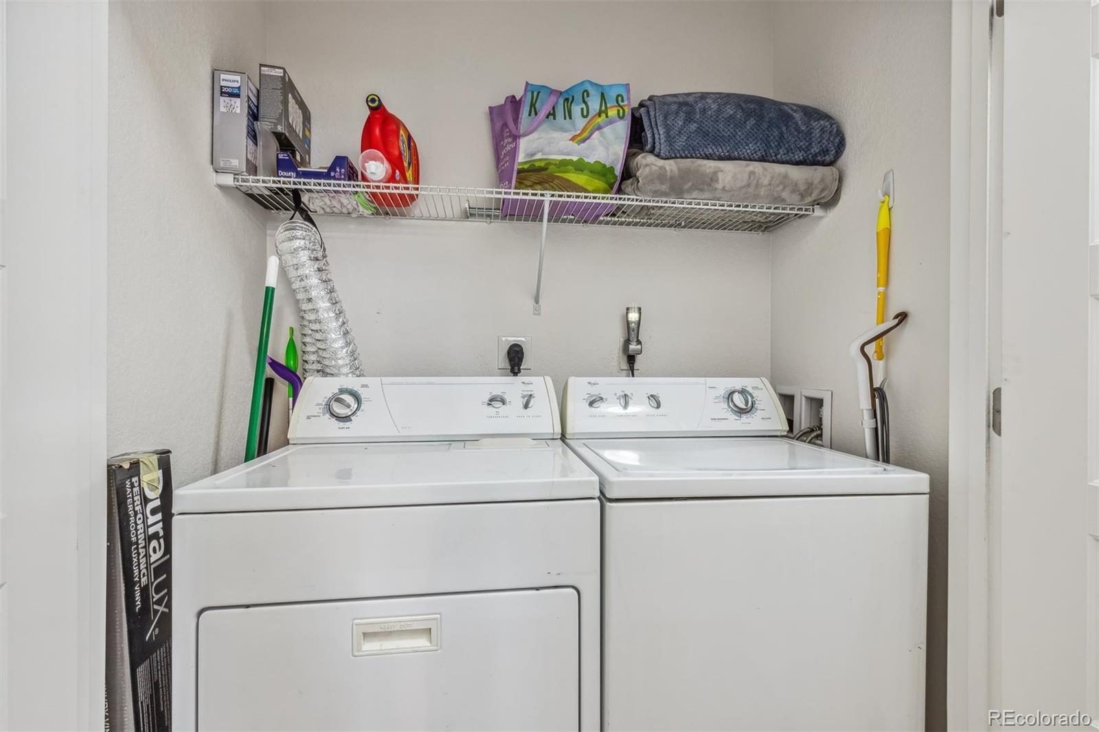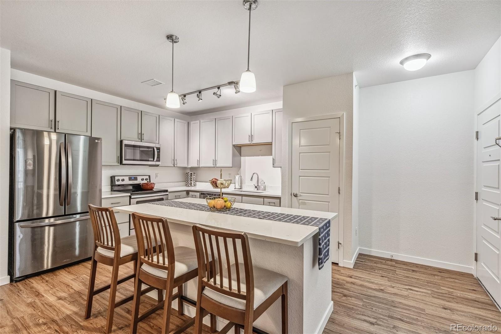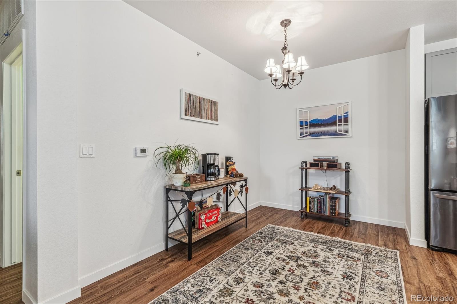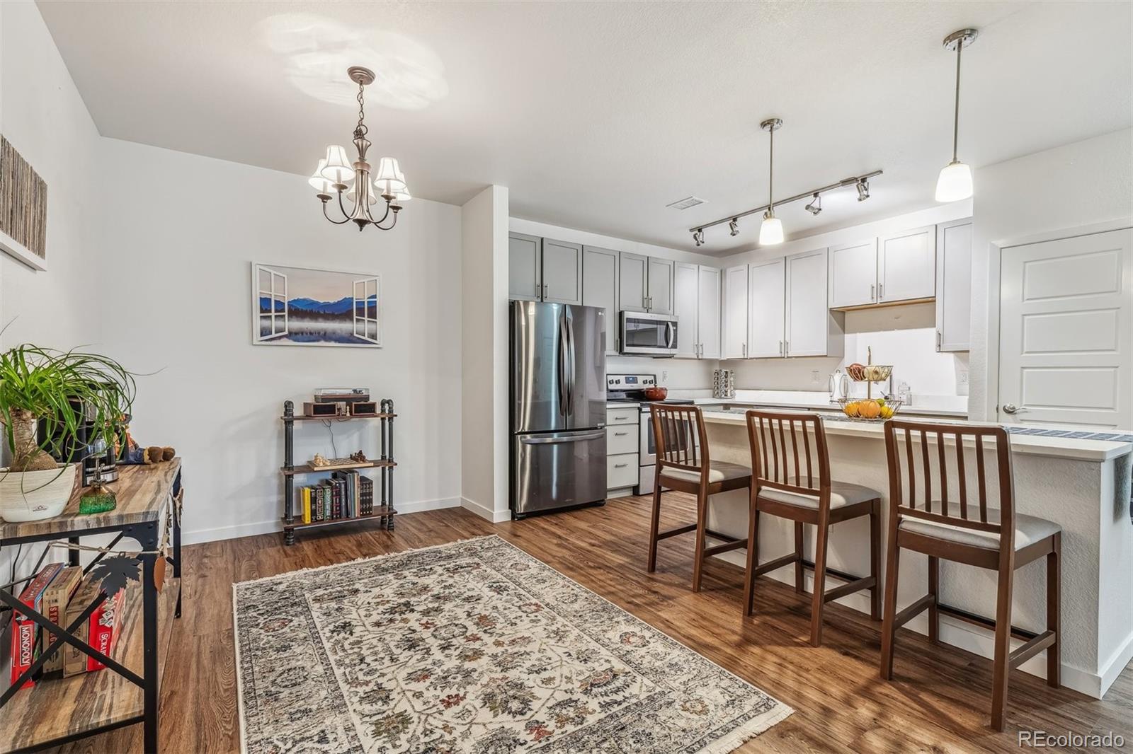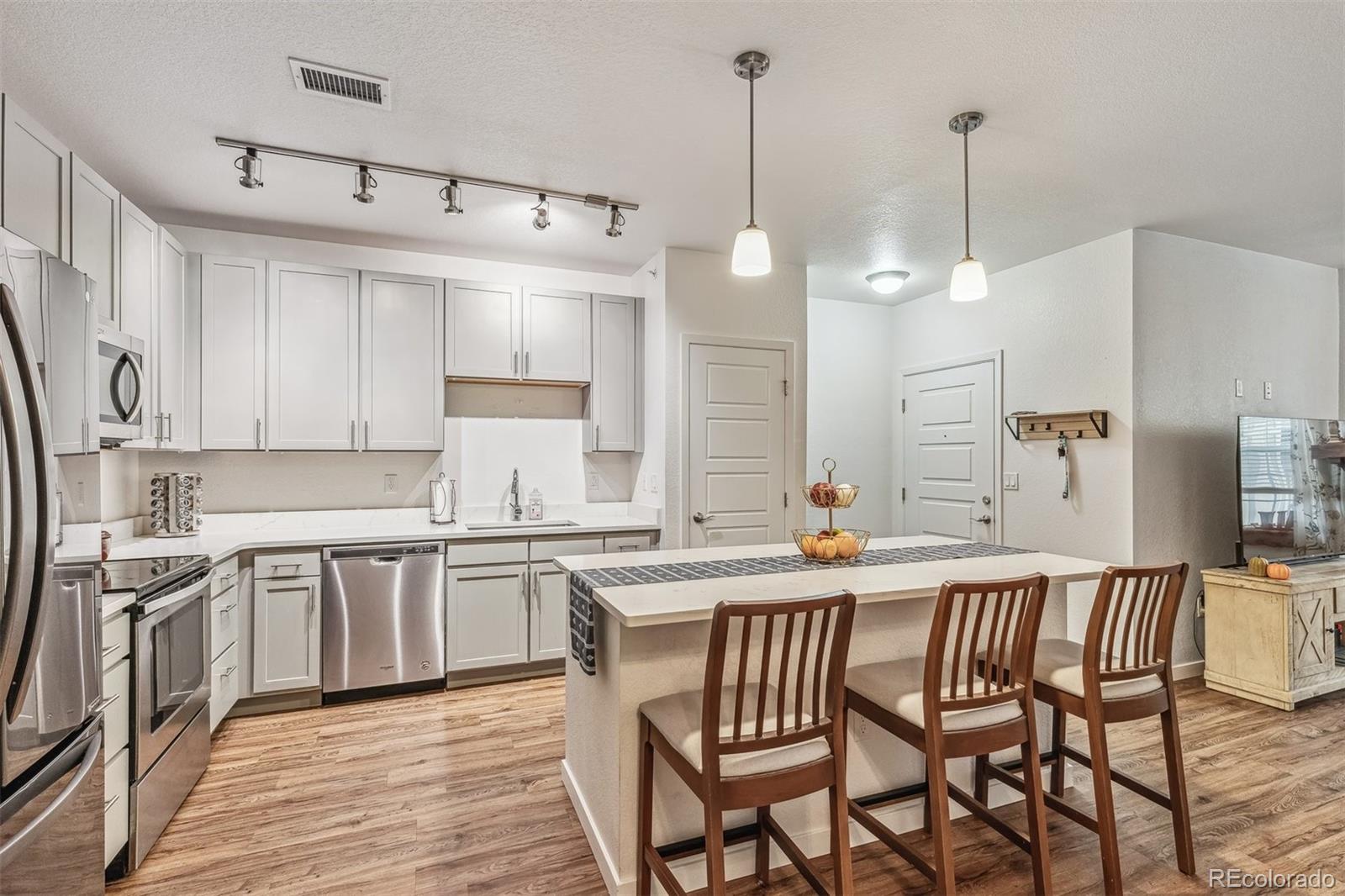 Welcome home to this elegantly appointed second-floor condo which offers beautiful and contemporary craftsmanship along with exceptional amenities-all nestled in a prime Parker location just steps from the Cherry Creek bike path. This home was METICULOUSLY CRAFTED IN 2019 & features an open floor plan with great natural light. The centerpiece of the home, the kitchen, has gorgeous charcoal cabinets, soft white and hazy grey quartz countertops, stainless steel appliances, and fabulous wood-grained luxury plank vinyl. The focal point of the kitchen is a beautiful and expansive kitchen island that includes extra cabinets and a contemporary breakfast bar. The open floor plan seamlessly blends the kitchen, dining, and living spaces, accentuated by the warm and contemporary gas fireplace. Conveniently extend your living space outdoors by stepping onto your covered patio - a peaceful place to enjoy your morning coffee or curl up with a good book in the afternoon. The primary bedroom has an oversized walk-in closet with a significant wow factor, new carpet, and a primary bathroom featuring a double sink vanity with quartz countertop, a spacious walk-in shower with built in bench and an extra linen closet. This home also features a secondary bedroom with brand new carpet and a full guest bathroom with beautiful quartz countertops. Storage is a huge plus with this home with a 1-car detached garage with built-in storage shelves AND an extra patio storage unit. When it is time for a break, the community offers its luxurious pool, soothing hot tub, state-of-the-art fitness center, sand volleyball courts, and a lush park for recreation and relaxation. All of this is situated with quick access to the amazing 40-mile Cherry Creek trail which offers endless opportunity for biking, jogging, or leisurely walks. This home is also strategically positioned close to downtown Parker, DTC, E470, and DIA. Don't miss this amazing opportunity to live with comfort and convenience.