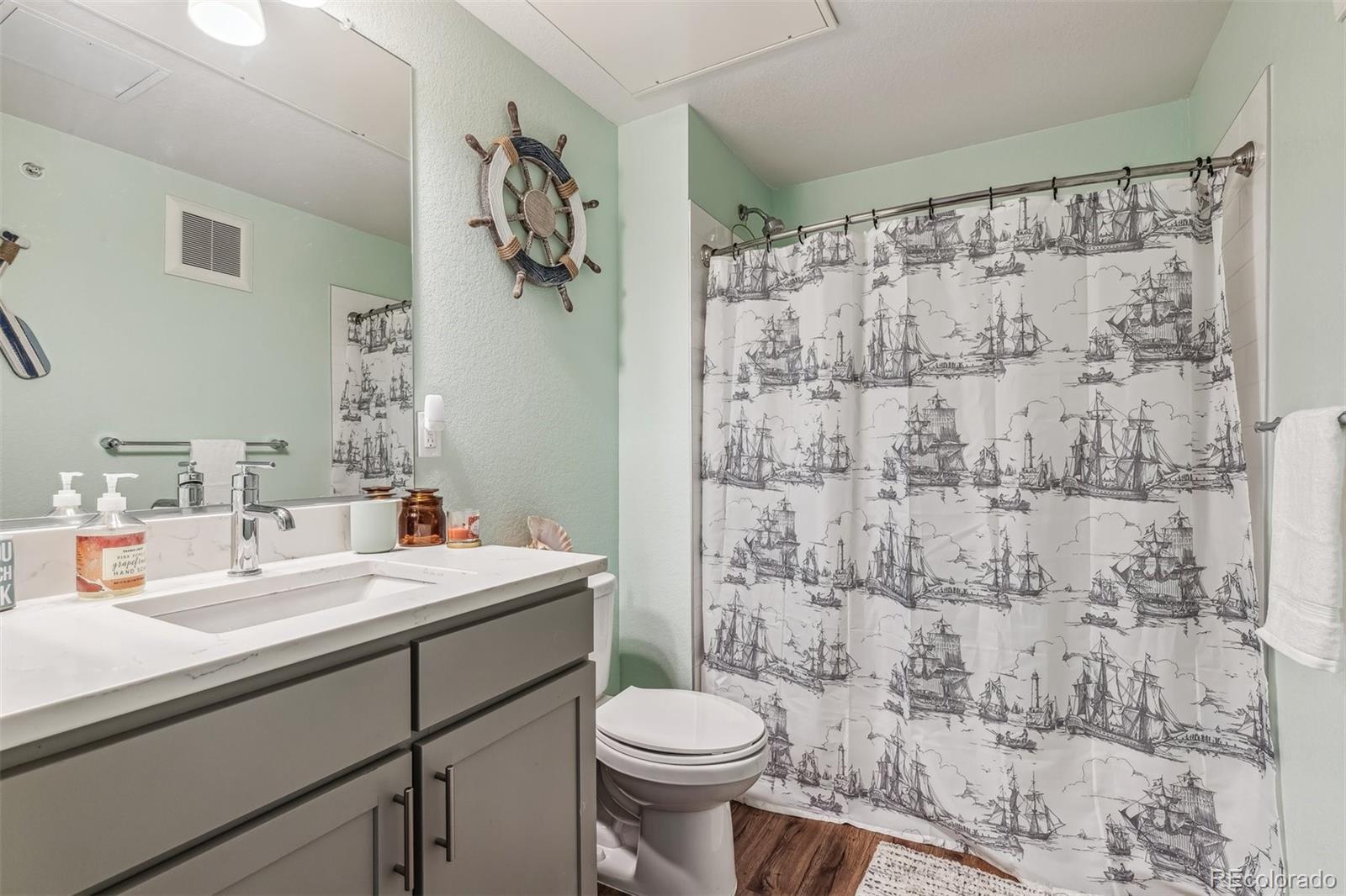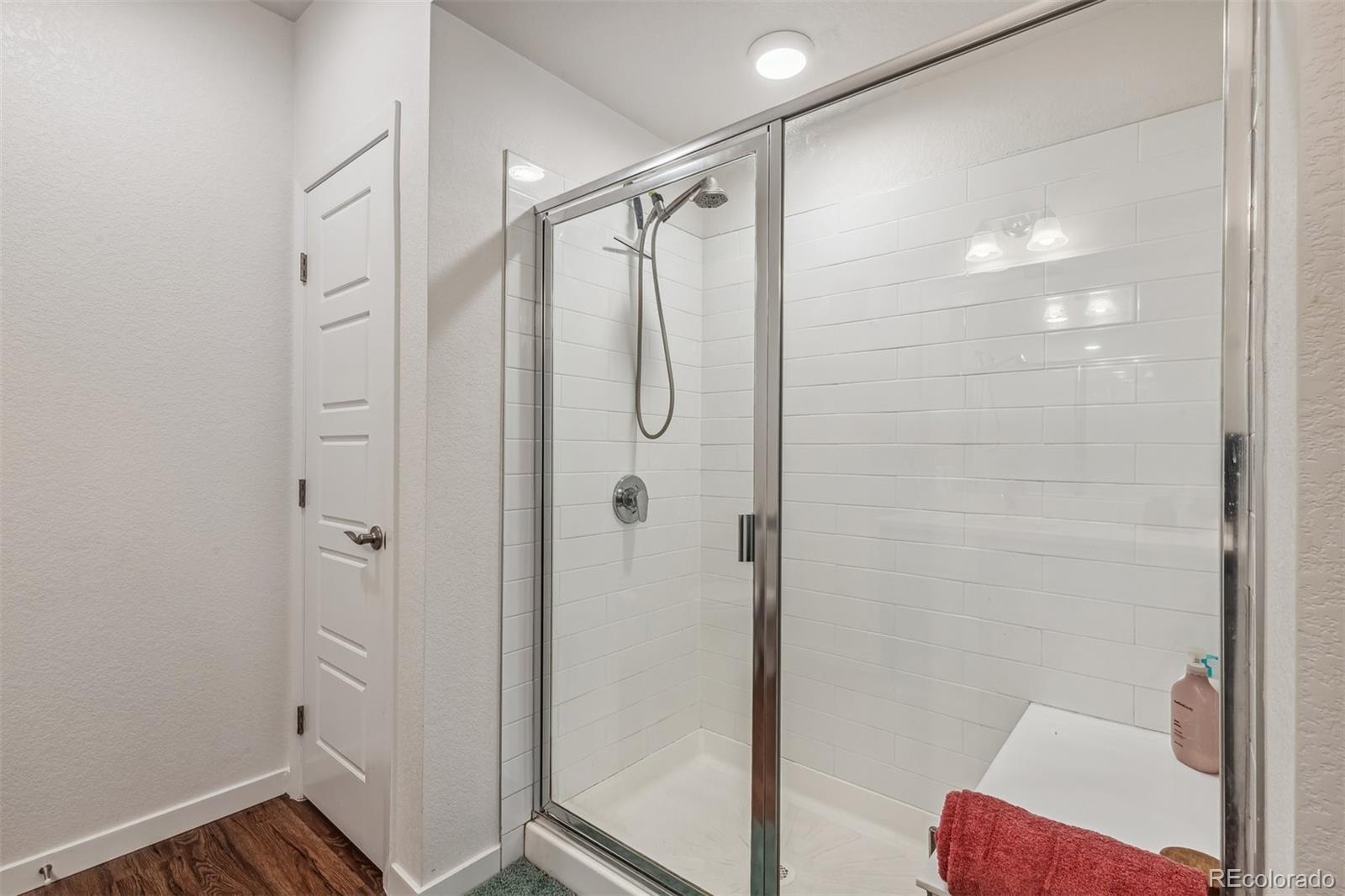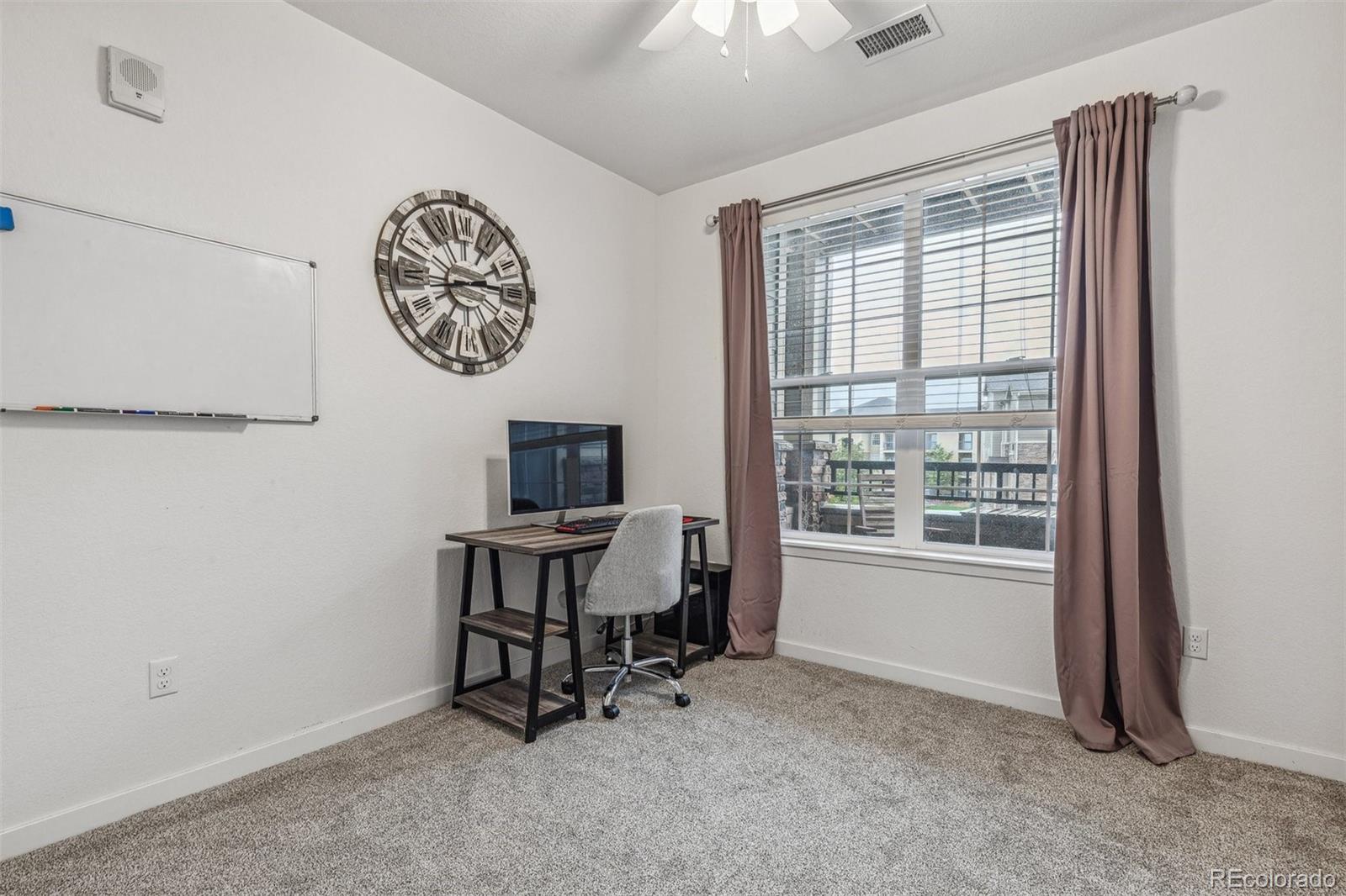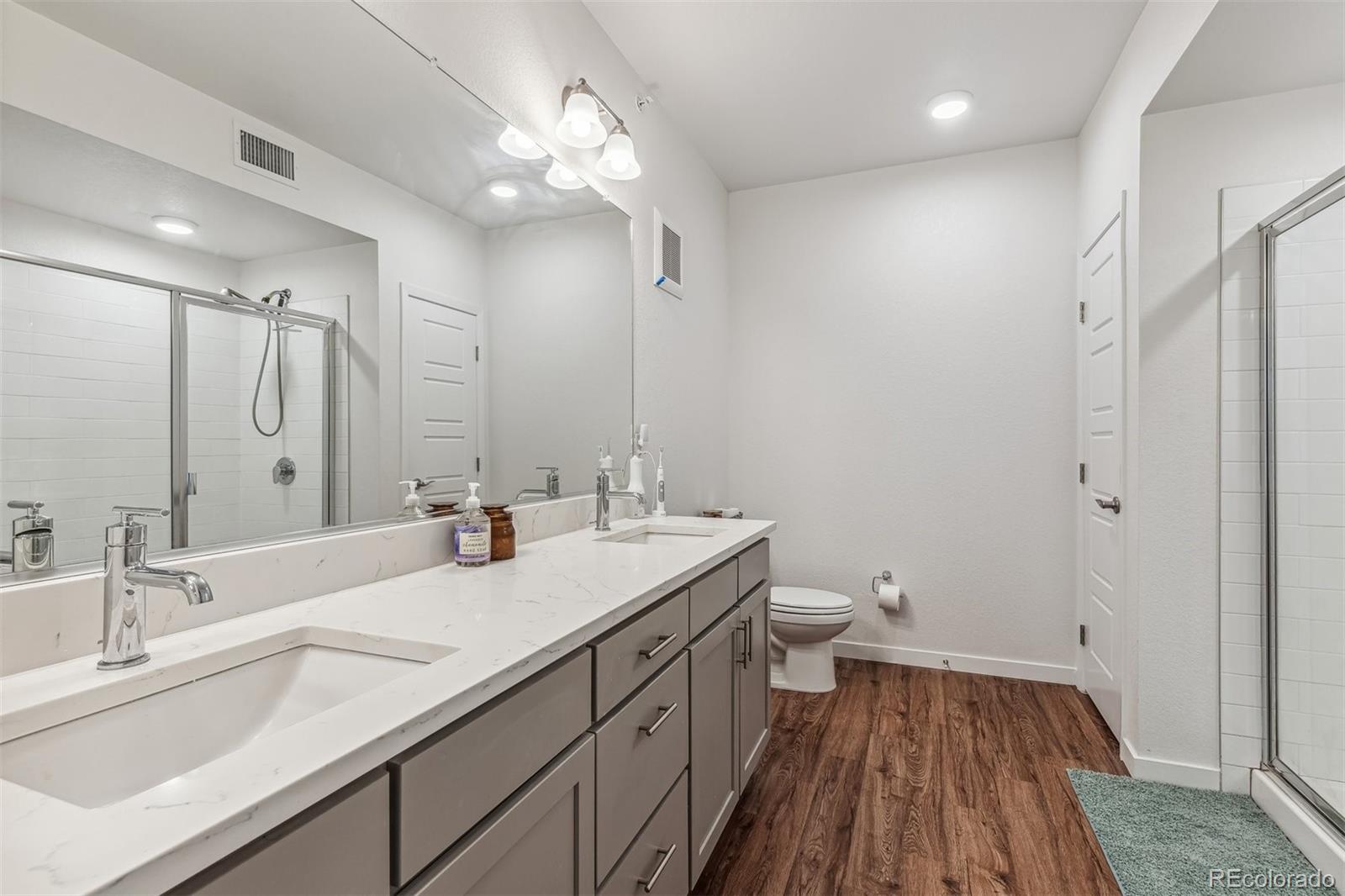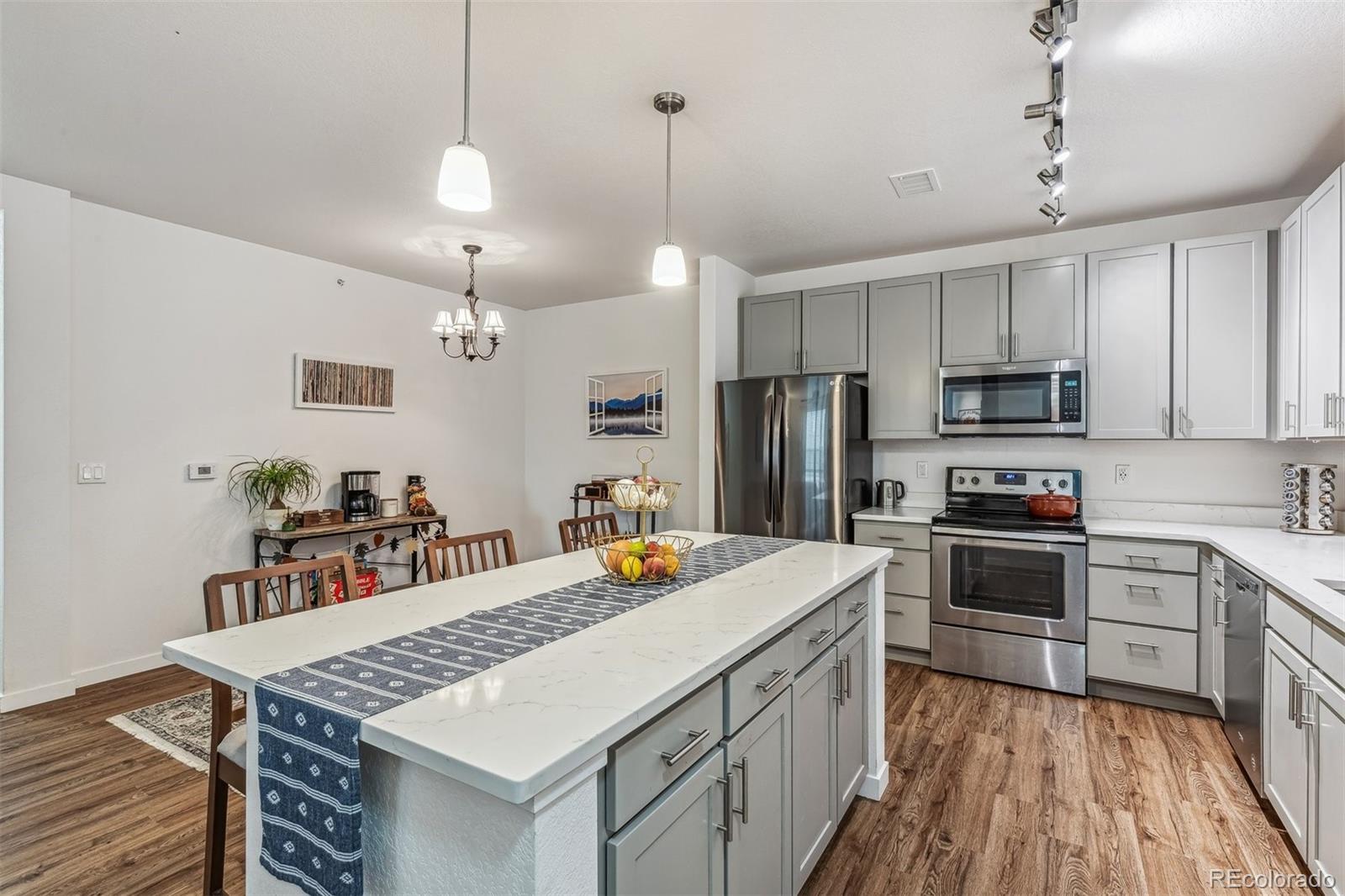 Welcome home to this elegantly appointed second-floor condo which offers beautiful and contemporary craftsmanship along with exceptional amenities-all nestled in a prime Parker location just steps from the Cherry Creek bike path. This home was METICULOUSLY CRAFTED IN 2019 & features an open floor plan with great natural light. The centerpiece of the home, the kitchen, has gorgeous charcoal cabinets, soft white and hazy grey quartz countertops, stainless steel appliances, and fabulous wood-grained luxury plank vinyl. The focal point of the kitchen is a beautiful and expansive kitchen island that includes extra cabinets and a contemporary breakfast bar. The open floor plan seamlessly blends the kitchen, dining, and living spaces, accentuated by the warm and contemporary gas fireplace. Conveniently extend your living space outdoors by stepping onto your covered patio - a peaceful place to enjoy your morning coffee or curl up with a good book in the afternoon. The primary bedroom has an oversized walk-in closet with a significant wow factor, new carpet, and a primary bathroom featuring a double sink vanity with quartz countertop, a spacious walk-in shower with built in bench and an extra linen closet. This home also features a secondary bedroom with brand new carpet and a full guest bathroom with beautiful quartz countertops. Storage is a huge plus with this home with a 1-car detached garage with built-in storage shelves AND an extra patio storage unit. When it is time for a break, the community offers its luxurious pool, soothing hot tub, state-of-the-art fitness center, sand volleyball courts, and a lush park for recreation and relaxation. All of this is situated with quick access to the amazing 40-mile Cherry Creek trail which offers endless opportunity for biking, jogging, or leisurely walks. This home is also strategically positioned close to downtown Parker, DTC, E470, and DIA. Don't miss this amazing opportunity to live with comfort and convenience.