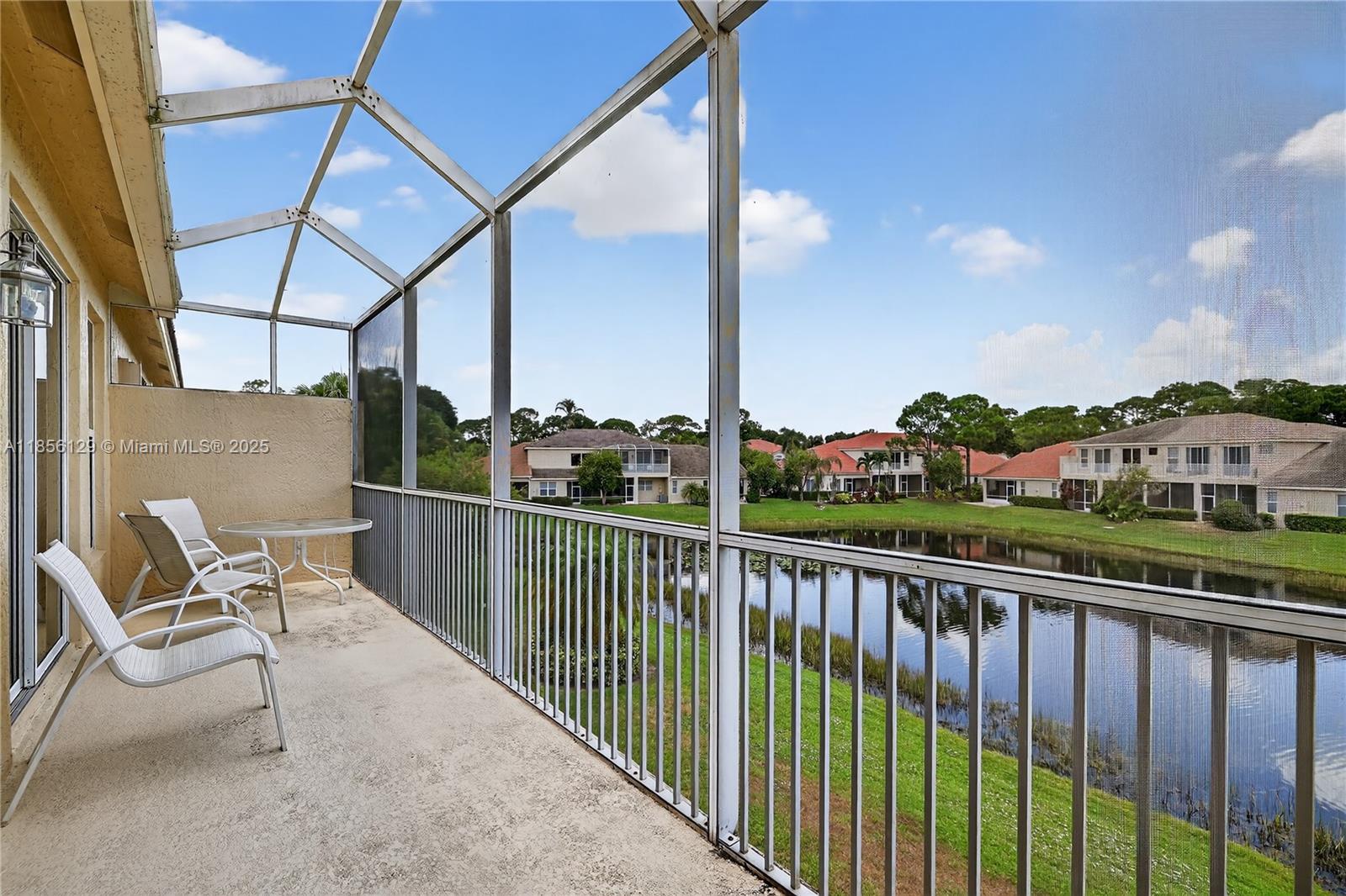 Lovely villa located in PGA Village’s Castle Pines community featuring 3 bedrooms, 2 baths, and a two-car garage. Enjoy high ceilings and bright open living spaces filled with natural light. The living room opens through sliding doors to a screened porch, perfect for relaxing. The master suite boasts vaulted ceilings, a walk-in closet, and an elegant bathroom with soaking tub and separate shower. Each bedroom enjoys access to a screened balcony with serene lake views. Community offers 24/7 staffed security gate, plus internet and basic cable included in the HOA fees.