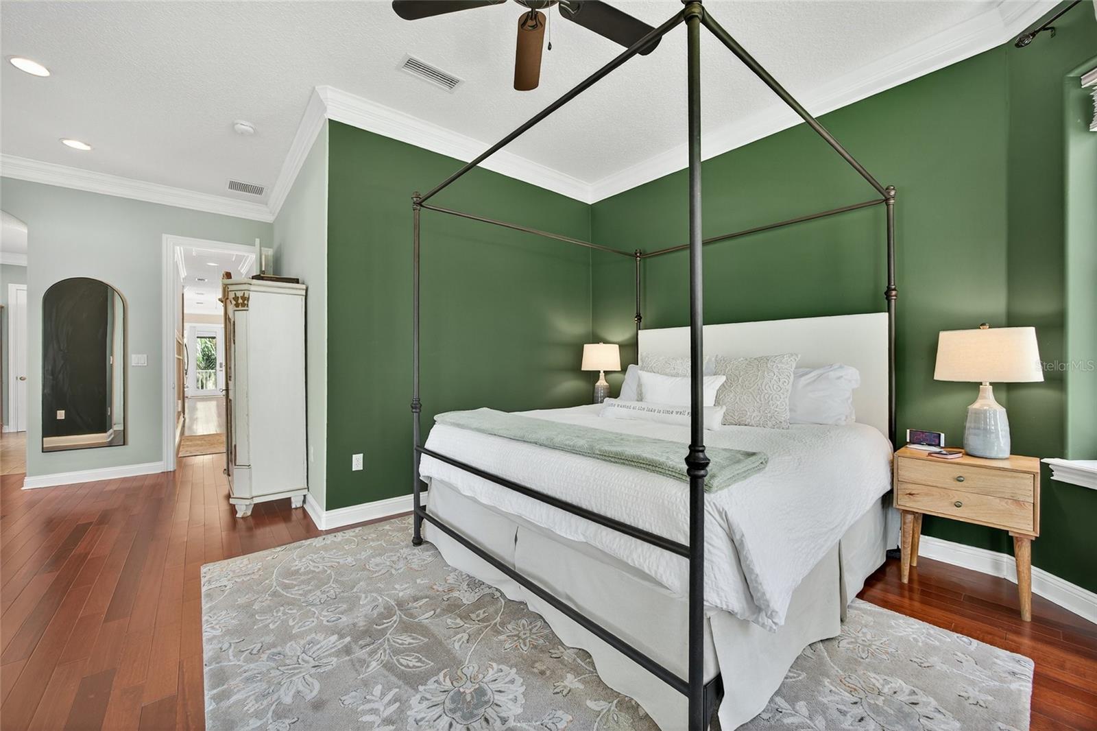 The owner's suite is a true retreat, featuring an oversized walk-in shower, a freestanding jetted soaking tub, a heated towel rack, and custom-designed vanities.