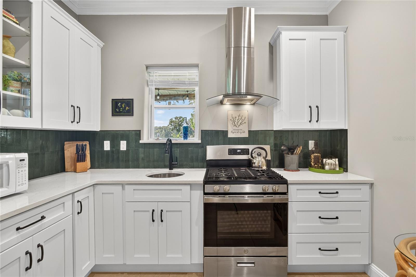 The main kitchen is a chef's dream with granite countertops, KraftMaid cabinetry, double ovens, and a septic-safe disposal system, while the apartment kitchen impresses with quartz countertops and soft-close drawers and doors.