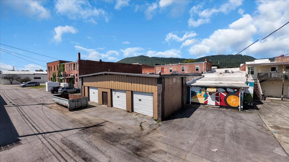 The back section offers three oversized bay garage doors, providing easy access for storage, a workshop, or future expansion. The front area enjoys excellent street visibility and is ideally suited for a storefront, café, or restaurant entrance.