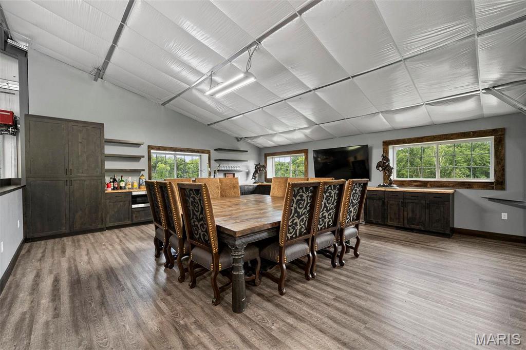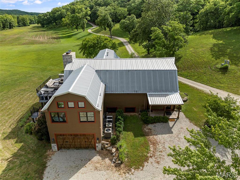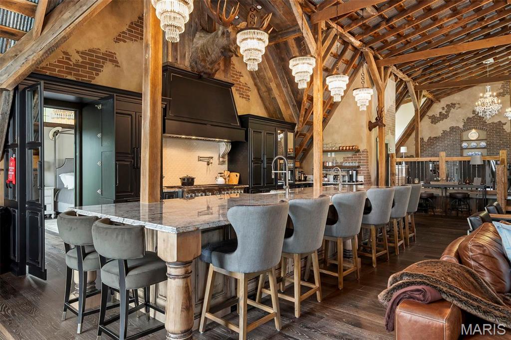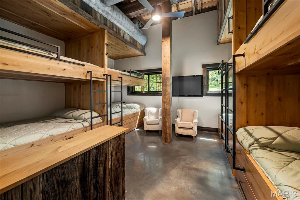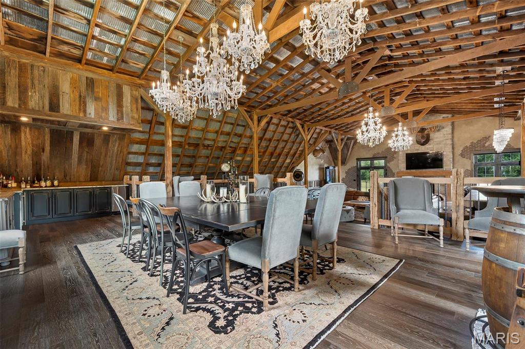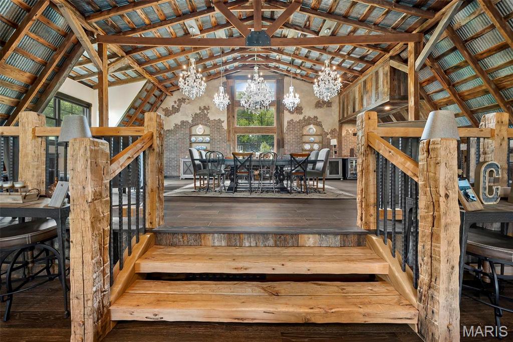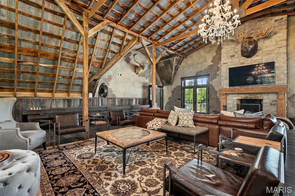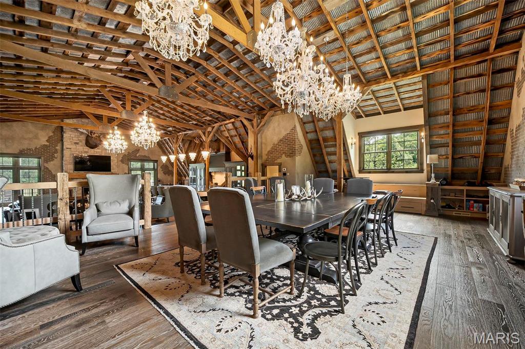 Situated roughly an hour and fifteen minutes SW of St. Louis, amidst the picturesque landscapes of the Missouri Ozarks, lies the Indian Ridge Creek Ranch. With a sprawling 620± acres, this property is a testament to serene living and architectural innovation. One of its main highlights is the meticulously restored dairy barn, transformed into an opulent residence with 7 bedrooms and 4.5 bathrooms, capable of accommodating up to 22 guests. This residence combines rustic charm with modern comforts, from its expansive living room and kitchen area to its spectacular downstairs bar. The ranch is the perfect place to entertain for business or family.