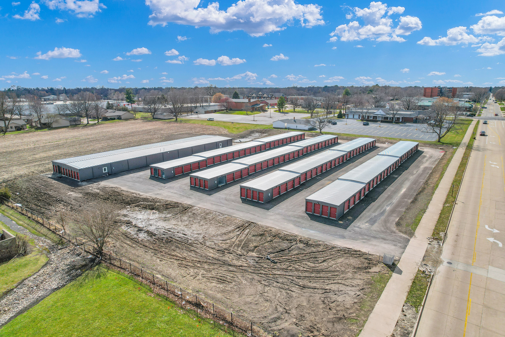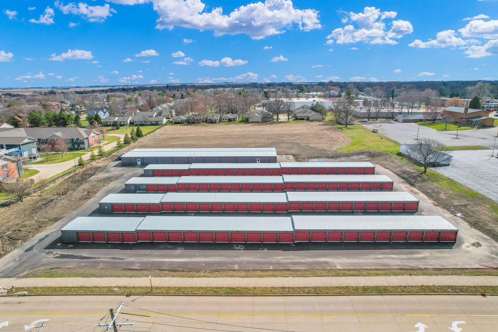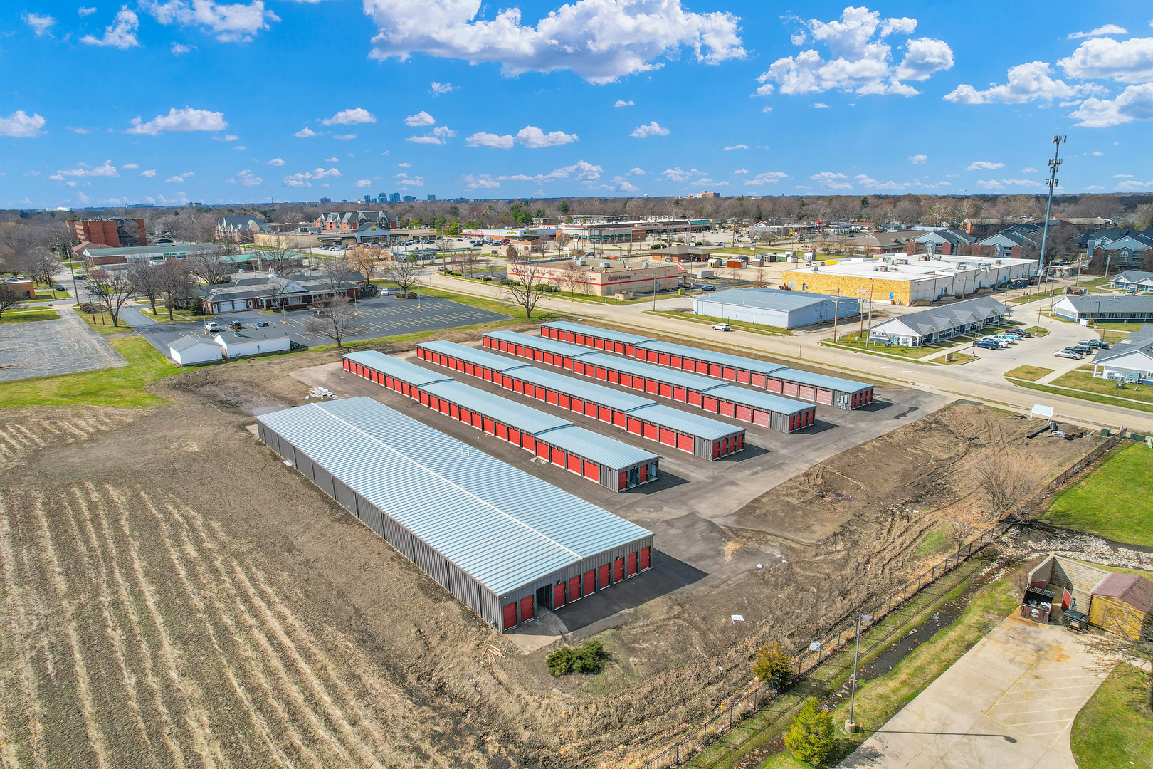 Brand new construction self storage complex in Urbana IL with 314 storage units. The complex features a fully automated security system with cameras, asphalt paved surface with low maintenance metal buildings, fence and automated gate at the entrance. Prime location situated adjacent to residential neighborhoods, apartment complexes and 2 miles to University of Illinois campus. The complex has four non climate controlled buildings with 10x10 and 5x10 units and one climate controlled building with 10x10 and 5x10 units.