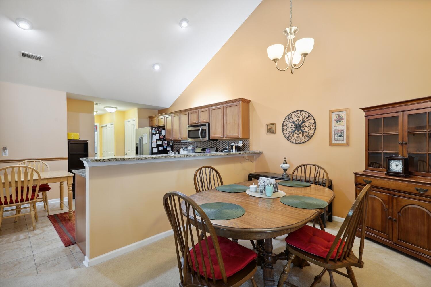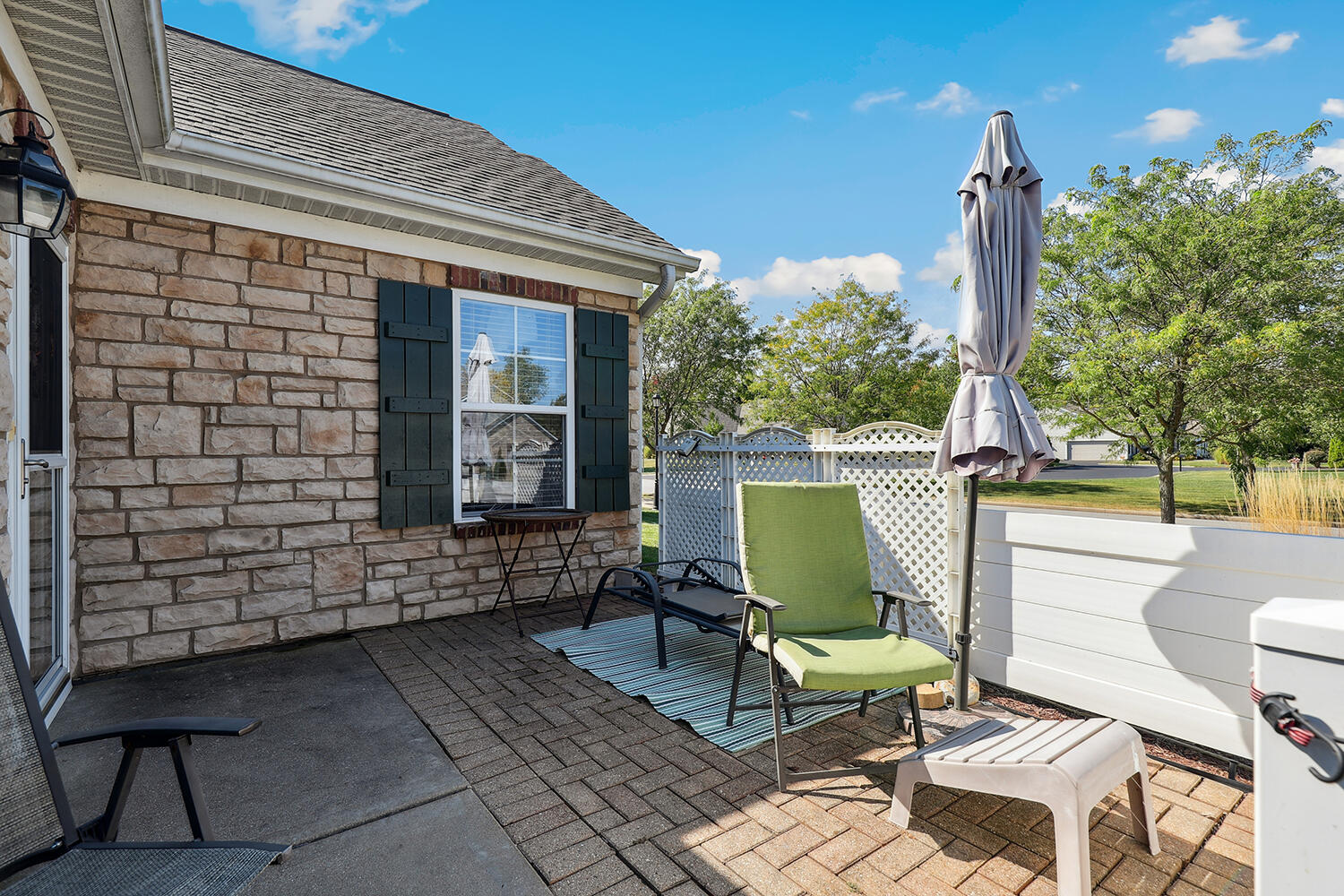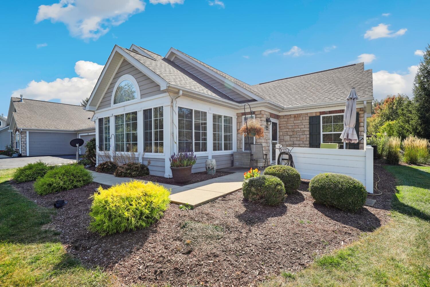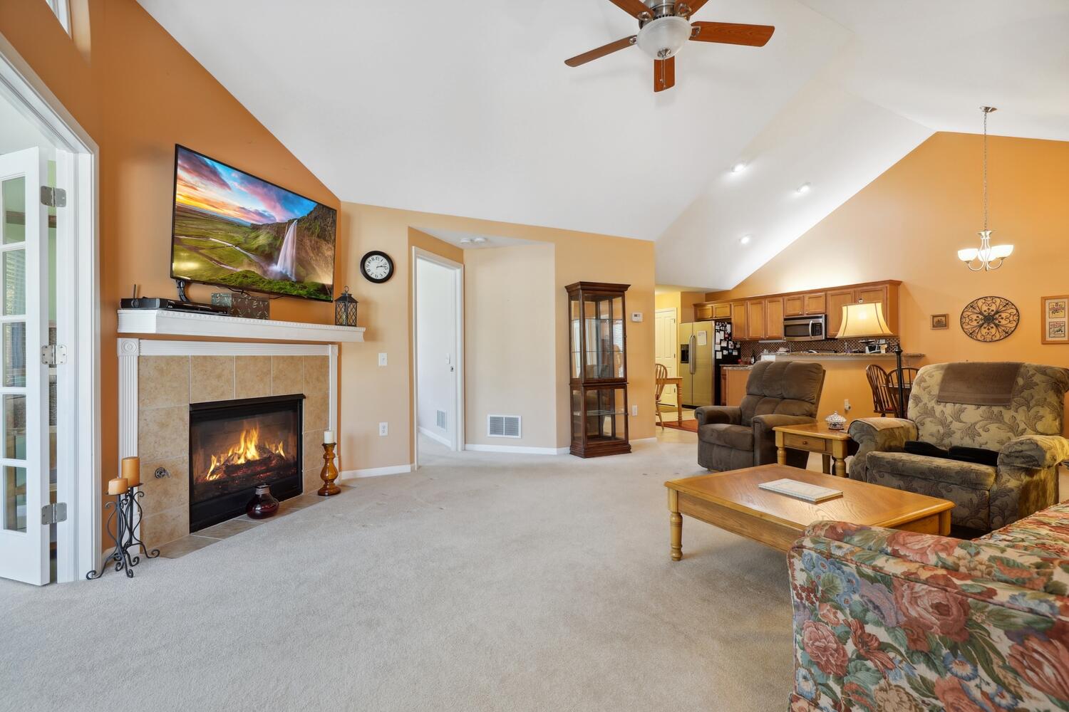 Welcome home to the Villas at Vale Park! Don't miss this desirable stair-free home with an open concept floor plan featuring dramatic cathedral ceilings and tons of natural light throughout. Gather with friends in the inviting living room, anchored by a timeless gas fireplace. Chef's will love the spacious eat-in kitchen boasting a large breakfast bar, granite counters, tiled backsplash, stainless steel appliances, and large pantry. The generous dining area is the perfect place to host holiday meals. Relax all year long in the sunny all season room with scenic views of green space and grasslands. At day's end, retreat to the tranquil primary bedroom with cathedral ceiling and ensuite bath with step-in shower. This home offers another bedroom, full bath, convenient laundry, bonus storage room, attached 2 car garage and private patio. Take advantage of the pool, gym, and clubhouse at the Villas at Vale Park! Great location, close to shopping, dining, parks, schools and more. Come see today!