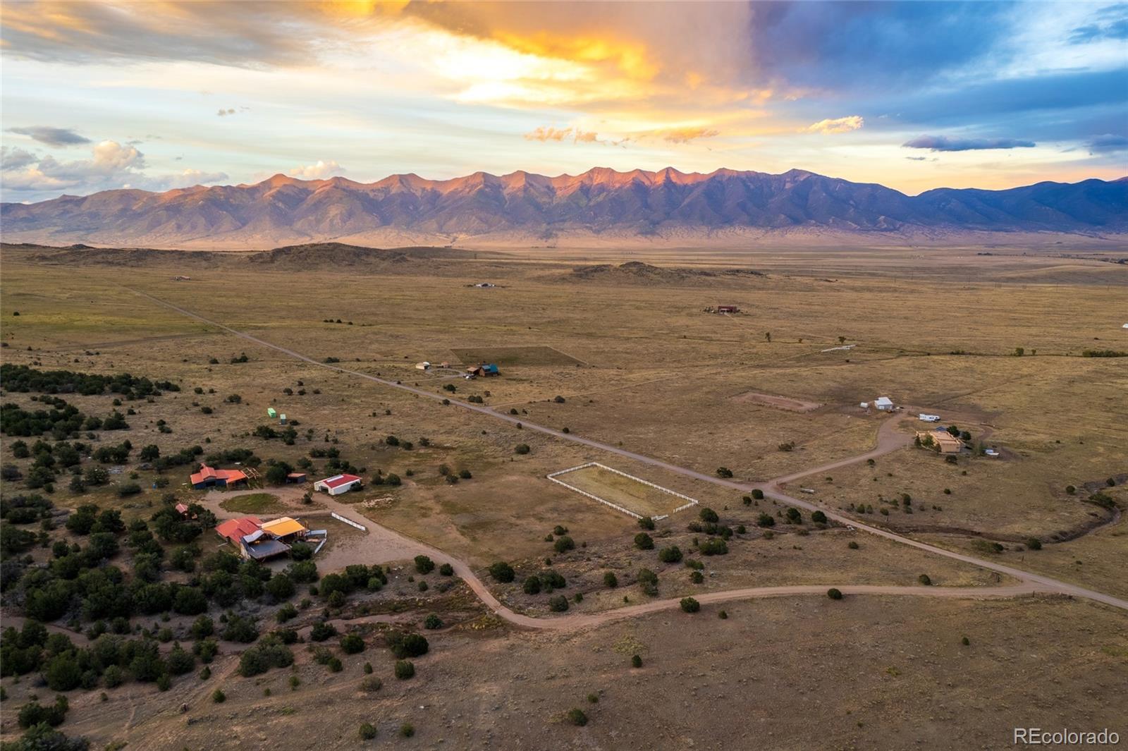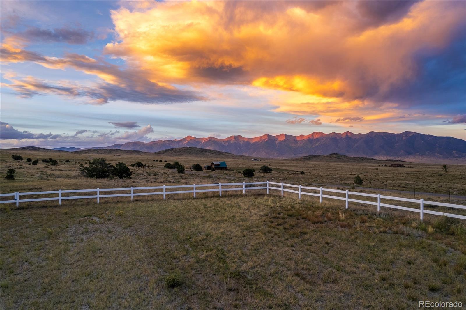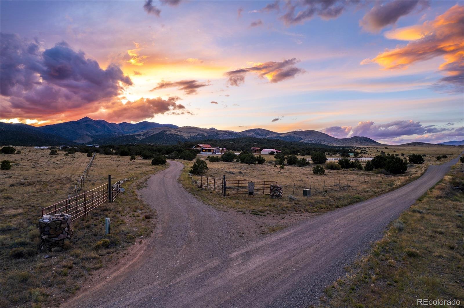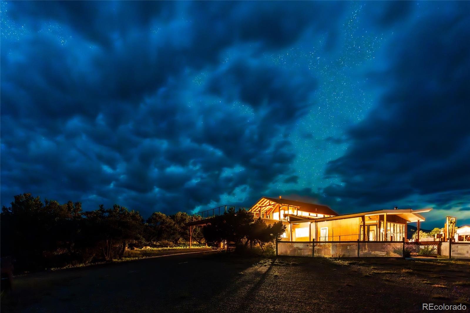 This spacious contemporary home complex has it all and will inspire your mountain living dreams. The property sits in a well-established dark skies area that features incredible views of the Sangre De Cristo Mountains. The main house is a sizeable 3285 square feet and includes a small separate apartment that can produce income as a short-term rental, long-term rental, or guest quarters. The lock-off apartment sits atop the main home with its own staircase and incredible deck. Imagine living in quiet seclusion and yet only 35 minutes from Salida and just 5 minutes to the historic town of Villa Grove. Enjoy high-altitude sunshine, no covenants, and access to the National Forest and BLM for all your recreational and hunting desires (game unit 681). Privacy abounds with juniper stands on three sides and an open meadow, complete with a fenced horse arena to the east. Entering the home from the covered carport or the front door, you are swept into a sun-drenched open combined kitchen, dining, and living area that provides expansive views across the valley. A wall of glass doors opens onto the front deck, complete with an outdoor fireplace, perfect for those small, intimate evenings or grand enough for large gatherings and family get-togethers. The kitchen features stainless steel appliances and colorful backsplash tiling. The primary bedroom opens to another smaller front deck that looks out over this beautiful property. Just off the kitchen and sun room, you will find a lovely front raised bed garden area just waiting for your vegetables and herbs. A separate she shed with a deck is ready to go, and two other outbuildings provide ample room for toy and vehicle storage. One of these is a barn with a separate workshop and office. There are three 40-foot storage containers tastefully tied in to make for more storage or expansion space.