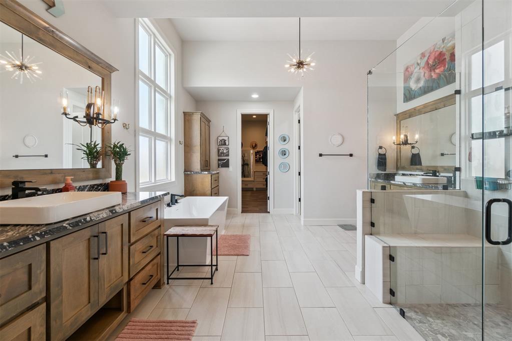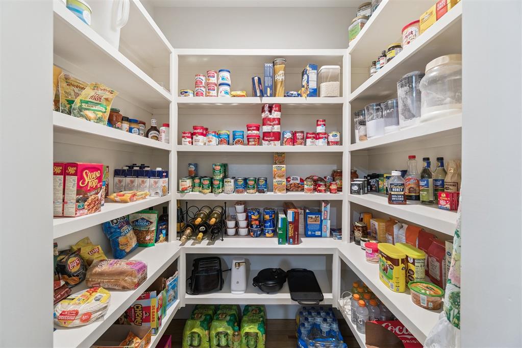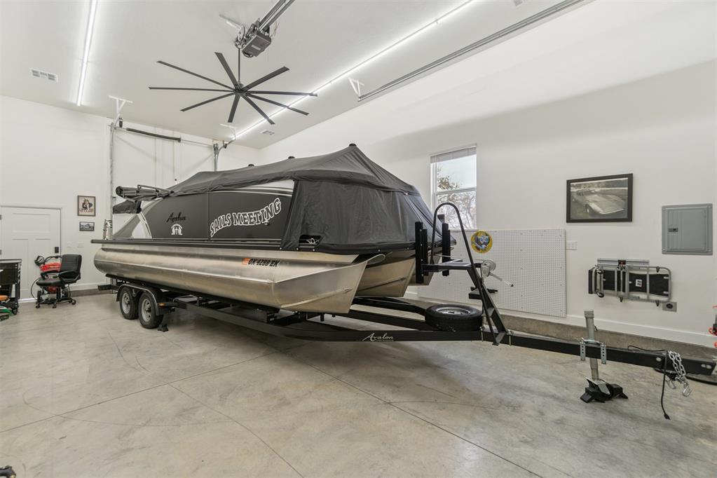 The oversized 977 sq ft extra-deep 3-car garage adds meaningful utility with Wi-Fi openers, an 8' x 18' primary door, an 8' x 8' third door, a ceiling-mounted electric winch, an above-ground Family Safe storm shelter, and a 60-amp EV charging system.